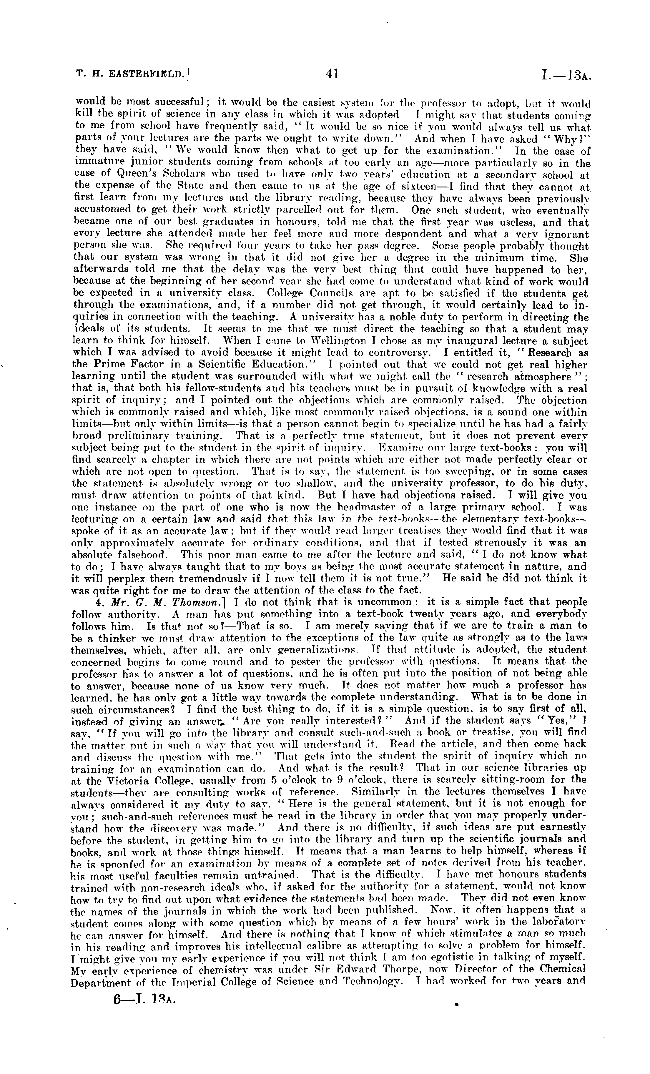 would be most srrccessful; it would be the easiest system for the professor to adopt, but it would kill the spirit of science in any class in which it xvas adopted I might say that students c ing to me from school have frequently said, " It would be so nice if you would always tell us what parts of your lectures are the parts we ought to write down." And when I have asked "Why?" they have said, "We would know then what to get up for the examination." In the case of immature junior students coming from schools at 10,, early an age—more particularly so in the case of Queen's Scholars who used to have only two years' education at a secondary school at the expense of the State and then calm- hi us at the age of sixteen —I find that they cannot at first learn from my lectures and the library reading, because they have always been previously accustomed to get their work strictly parcelled out for them. One such student, who eventually became one of our best graduates in honours, told me that the first year was useless, and that every lecture she attended made her feel more ami more despondent and what a very ignorant person she was. She required four years to take her pass degree. Some people probably thought that our system xvas wrong in that it did not give her a degree in the minimum time. She afterxvards told me that the delay xvas the very best thing that could have happened to her, because at the beginning of her second year she had come to understand what kind of work xvould be expected in a university class. College Councils are apt to be satisfied if the students get through the examinations, and, if a number did not get through, it would certainly lead to inquiries in connection with the teaching. A university has a noble duty to perform in directing the ideals of its students. It seems to me that we must direct the teaching so that a student may learn to think for himself. When I came to Wellington T chose as my inaugural lecture a subject which I xvas advised to avoid because it might lead to controversy. I entitled it, " Research as the Prime Factor in a Scientific Education." I pointed out that we could not get real higher learning until the student xvas surrounded with what we might call the "research atmosphere": that is. that both his fellow-students and his teachers must be in pursuit of knoxvledge with a real spirit of inquiry; and I pointed out the objections which are commonly raised. The objection which is commonly raised and which, like most commonly raised objections, is a sound one within limits—but only within limits—is that a person cannot begin to specialize until he has had a fairly broad preliminary training. That is a perfectly true statement, but it does not prevent every subject being put to the student in the spirit of inquiry. Examine our large text-books: you will find scarcely a chapter in xvhich there are not points which are either not made perfectly clear or which are not open to question. That is to say, the statement is too sweeping, or in some cases the statement is absolutely wrong or too shallow, and the university professor, to do his duty, must draw attention to points of that kind. Hut T have had objections raised. I xvill give you one instance on the part of one who is now the headmaster of a large primary school. T was lecturing on a certain law and said that this law in the text-books—the elementary text-books— spoke of it as an accurate laxv ; but if they would read larger treatises they xvould find that it was only approximately accurate for ordinary conditions, and that if tested strenously it was an absolute falsehood. This poor man came to me after the lecture and said, "I do not know what to do ; I have always taught that to my boys as being the most accurate statement in nature, and it will perplex them tremendously if I now tell them it is not true." TTe said he did not think it was quite right for me to draw the attention of the class to the fact. 4. Mr. G. il/. Thomson.] T do not think that is uncommon : it is a simple fact that people folloxv authority. A man has put something into a text-book twenty years ago, and everybody follows him. Is that not so?— That is so. T am merely saying that if we are to train a man to be a thinker we must draw attention to the exceptions of the law quite as strongly as to the laws themselves, xxdiich, after all, are only generalizations. Tf that attitude is adopted, the student concerned begins to come round and to pester the professor with questions. It means that the professor lias to ansxver a lot of questions, and he is often put into the position of not being able to ansxver. because none of us know very much. Tt does not matter hoxv much a professor has learned, he has only got a little xvay towards the complete understanding. What is to be done in such circumstances? T find the best thing to do, if it is a simple question, is to say first of all. instead of giving an answer, "Are you really interested?" And if the student says "Yes." 1 sax-. " If you xvill go into the library and consult such-and-such a book or treatise, you will find the matter put in such a way that vim xvill understand it. Read the article, and then come back and discuss the question with me." That gets info the student the spirit of inquiry which no training for an examination can do. Ami what is the result? That in our science libraries up at the Victoria College, usually from 5 o'clock to 9 o'clock, there is scarcely sitting-room for the students —they .lie consulting works of reference. Similarly in the lectures themselves I have always considered it my duty to say. " Here is the general statement, but it is not enough for you ; such-and-such references mirst be read in the library in order that yon may properly understand how the discovery xvas made." And there is no difficulty, if such ideas are put earnestly before the student, in getting him to go into the library and turn up the scientific journals 