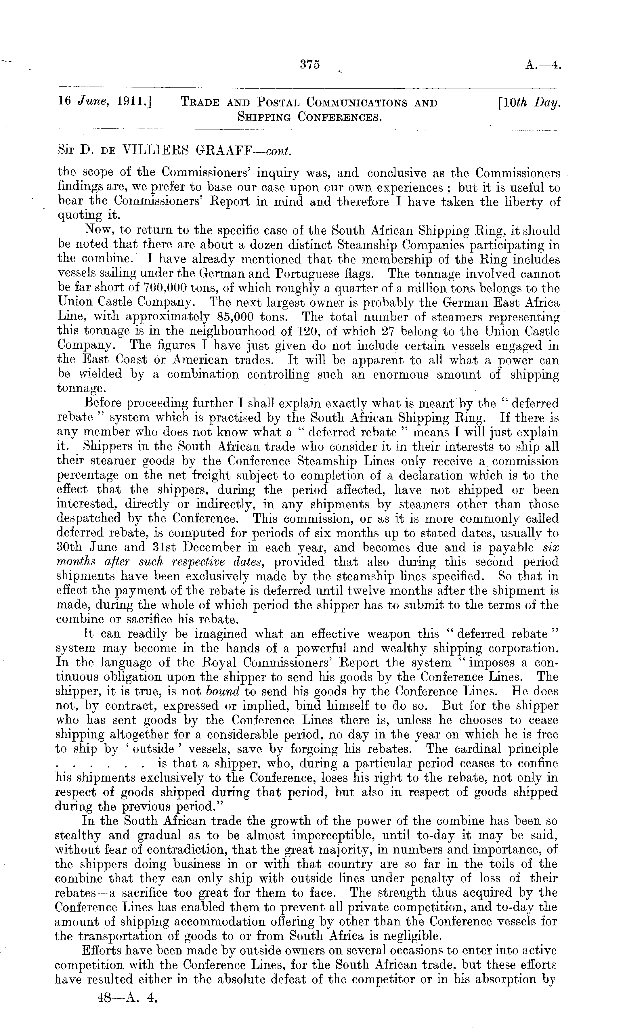 16 June, 1911.] Trade and Postal Communications and \ltith Day. Shipping Conferences. Sir 1). de VILLIEES GRAAFF— cont. the scope of the Commissioners' inquiry was, and conclusive as the Commissioners findings are, we prefer to base our case upon our own experiences ; but it is useful to bear the Commissioners' Report in mind and therefore I have taken the liberty of quoting it. Now, to return to the specific case of the South African Shipping Ring, it should be noted that there are about a dozen distinct Steamship Companies participating in the combine. I have already mentioned that the membership of the Ring includes vessels sailing under the German and Portuguese flags. The tonnage involved cannot be far short of 700,000 tons, of which roughly a quarter of a million tons belongs to the Union Castle Company. The next largest owner is probably the German East Africa Line, with approximately 85,000 tons. The total number of steamers representing this tonnage is in the neighbourhood of 120, of which 27 belong to the Union Castle Company. The figures I have just given do not include certain vessels engaged in the East Coast or American trades. It will be apparent to all what a power can be wielded by a combination controlling such an enormous amount of shipping tonnage. Before proceeding further I shall explain exactly what is meant by the " deferred rebate " system which is practised by the South African Shipping Ring. If there is any member who does not know what a " deferred rebate " means I will just explain it. Shippers in the South African trade who consider it in their interests to ship all their steamer goods by the Conference Steamship Lines only receive a commission percentage on the net freight subject to completion of a declaration which is to the effect that the shippers, during the period affected, have not shipped or been interested, directly or indirectly, in any shipments by steamers other than those despatched by the Conference. This commission, or as it is more commonly called deferred rebate, is computed for periods of six months up to stated dates, usually to 30th June and 31st December in each year, and becomes due and is payable six months after such respective dates, provided that also during this second period shipments have been exclusively made by the steamship lines specified. So that in effect the payment of the rebate is deferred until twelve months after the shipment is made, during the whole of which period the shipper has to submit to the terms of the combine or sacrifice his rebate. It can readily be imagined what an effective weapon this " deferred rebate " system may become in the hands of a powerful and wealthy shipping corporation. In the language of the Royal Commissioners' Report the system " imposes a continuous obligation upon the shipper to send his goods by the Conference Lines. The shipper, it is true, is not bound to send his goods by the Conference Lines. He does not, by contract, expressed or implied, bind himself to do so. But for the shipper who has sent goods by the Conference Lines there is, unless he chooses to cease shipping altogether for a considerable period, no day in the year on which he is free to ship by ' outside ' vessels, save by forgoing his rebates. The cardinal principle is that a shipper, who, during a particular period ceases to confine his shipments exclusively to the Conference, loses his right to the rebate, not only in respect of goods shipped during that period, but also in respect of goods shipped during the previous period." In the South African trade the growth of the power of the combine has been so stealthy and gradual as to be almost imperceptible, until to-day it may be said, without fear of contradiction, that the great majority, in numbers and importance, of the shippers doing business in or with that country are so far in the toils of the combine that they can only ship with outside lines under penalty of loss of their rebates —a sacrifice too great for them to face. The strength thus acquired by the Conference Lines has enabled them to prevent all private competition, and to-day the amount of shipping accommodation offering by other than the Conference vessels for the transportation of goods to or from South Africa is negligible. Efforts have been made by outside owners on several occasions to enter into active competition with the Conference Lines, for the South African trade, but these efforts have resulted either in the absolute defeat of the competitor or in his absorption by