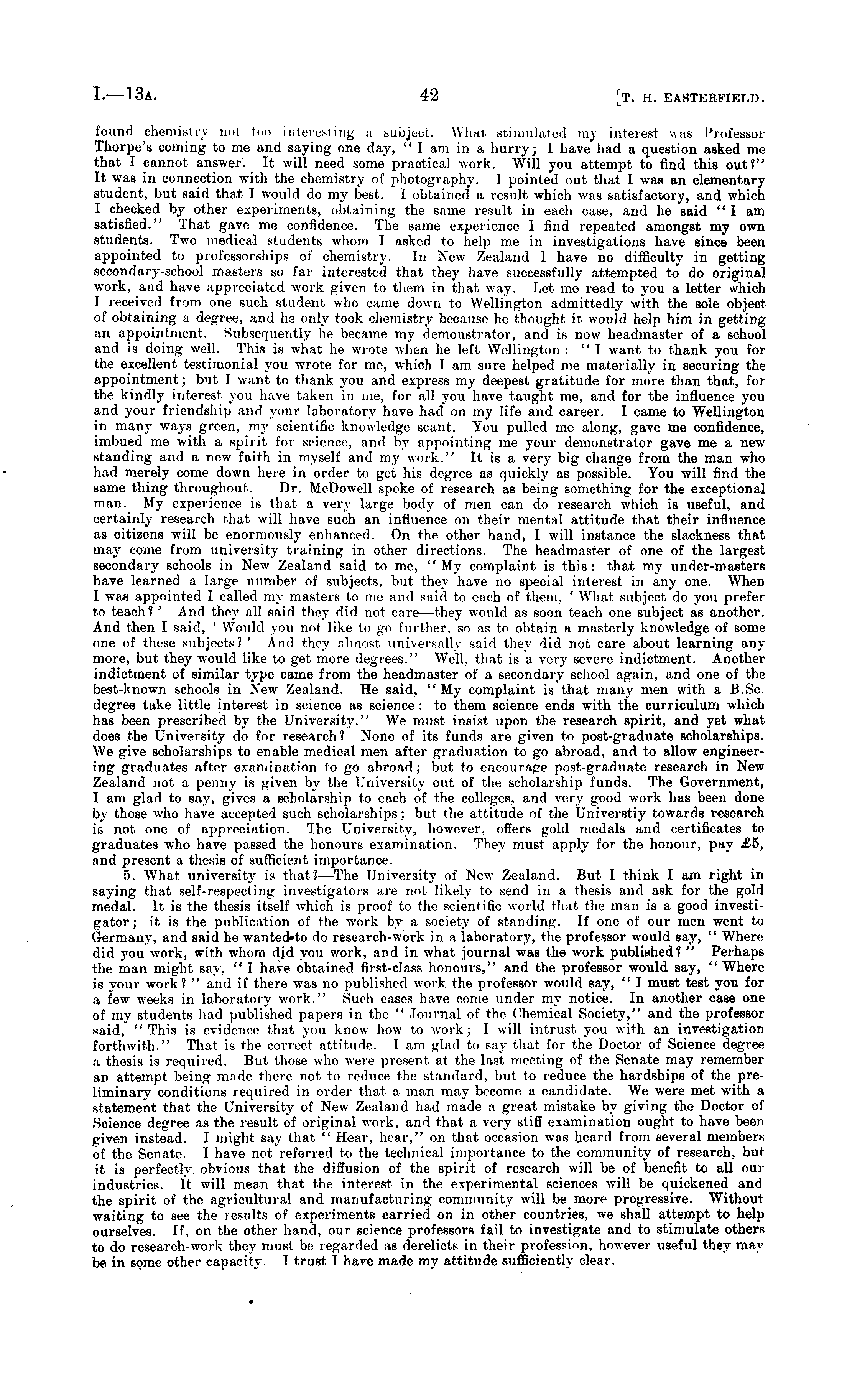 found chemistry not too interesting a subject. What stimulated my interest was Professor Thorpe's coming to me and saying one day, " I am in a hurry; 1 have had a question asked me that I cannot answer. It will need some practical work. Will you attempt to find this out?" It was in connection with the chemistry of photography. I pointed out that I xvas an elementary student, but said that I would do my best. I obtained a result which xvas satisfactory, and which I checked by other experiments, obtaining the same result in each case, and he said "I am satisfied." That gave me confidence. The same experience I find repeated amongst my own students. Two medical students whom I asked to help me in investigations have since been appointed to professorships of chemistry. In Nexv Zealand 1 have no difficulty in getting secondary-school masters so far interested that they have successfully attempted to do original work, and have appreciated work given to them in that way. Let me read to you a letter xvhich I received from one such student who came doxvn to Wellington admittedly xvith the sole object of obtaining a degree, and he only took chemistry because he thought it xvould help him in getting an appointment. Subsequently he became my demonstrator, and is now headmaster of a school and is doing well. This is xvhat he wrote when he left Wellington :"I want to thank you for the excellent testimonial you wrote for me, xvhich I am sure helped me materially in securing the appointment; but I want to thank you and express my deepest gratitude for more than that, for the kindly interest you have taken in me, for all you have taught me, and for the influence you and your friendship and your laboratory have had on my life and career. I came to Wellington in many ways green, my scientific knowledge scant. You pulled me along, gave me confidence, imbued me xvith a spirit for science, and by appointing me your demonstrator gave me a nexv standing and a nexv faith in myself and my xvork." It is a very big change from the man xx-ho had merely come doxvn here in order to get his degree as quickly as possible. You will find the same thing throughout. Dr. McDoxvell spoke of research as being something for the exceptional man. My experience is that a very large body of men can do research xvhich is useful, and certainly research that xvill have such an influence on their mental attitude that their influence as citizens xvill be enormously enhanced. On the other hand, I will instance the slackness that may come from university training in other directions. The headmaster of one of the largest secondary schools in Nexv Zealand said to me, "My complaint is this: that my under-masters have learned a large number of subjects, btrt they have no special interest in any one. When I was appointed I called my masters to me and said to each of them, ' What subject do you prefer to teach? ' And they all said they did not care —they would as soon teach one subject as another. And then I said, ' Would you not like to go further, so as to obtain a masterly knoxxdedge of some one of these subjects? ' And they almost universally said they did not care about learning any more, but they xvould like to get more degrees." Well, that is a very severe indictment. Another indictment of similar type came from the headmaster of a secondary school again, and one of the best-known schools in Nexv Zealand. He said, "My complaint is that many men with a B.Sc. degree take little interest in science as science : to them science ends xvith the curriculum xvhich has been prescribed by the University." We must insist upon the research spirit, and yet what does the University do for research? None of its funds are given to post-graduate scholarships. We give scholarships to enable medical men after graduation to go abroad, and to allow engineering graduates after examination to go abroad; but to encourage post-graduate research in New Zealand not a penny is given by the University oirt of the scholarship funds. The Government, I am glad to say, gives a scholarship to each of the colleges, and very good work has been done by those who have accepted such scholarships; but the attitude of the Universtiy towards research is not one of appreciation. The University, hoxvever, offers gold medals and certificates to graduates who have passed the honours examination. They must apply for the honour, pay £5, and present a thesis of sufficient importance. 5. W 7 hat university is that?— The University of New Zealand. But I think I am right in saying that self-respecting investigators are not likely to send in a thesis and ask for the gold medal. It is the thesis itself xvhich is proof to the scientific world that the man is a good investigator; it is the publication of the work by a society of standing. If one of our men went to Germany, and said he wanteoVto do research-work in a laboratory, the professor xvould say, " Where did you xvork, with whom did yon work, and in xvhat journal xvas the xx-ork published? " Perhaps the man might say, " 1 have obtained first-class honours," and the professor would say, " Where is your work? " and if there xvas no published xvork the professor xvould say, " I must test you for a few xveeks in laboratory xvork." Such cases have come under my notice. In another case one of my students had published papers in the " Journal of the Chemical Society," and the professor said, "This is evidence that you know how to xvork; I xvill intrust you xvith an investigation forthwith." That is the correct attitude. lam glad to say that for the Doctor of Science degree a thesis is required. But those xvho were present at the last meeting of the Senate may remember an attempt being made there not to reduce the standard, but to reduce the hardships of the preliminary conditions required in order that a man may become a candidate. We were met with a statement that the University of New Zealand had made a great mistake by giving the Doct