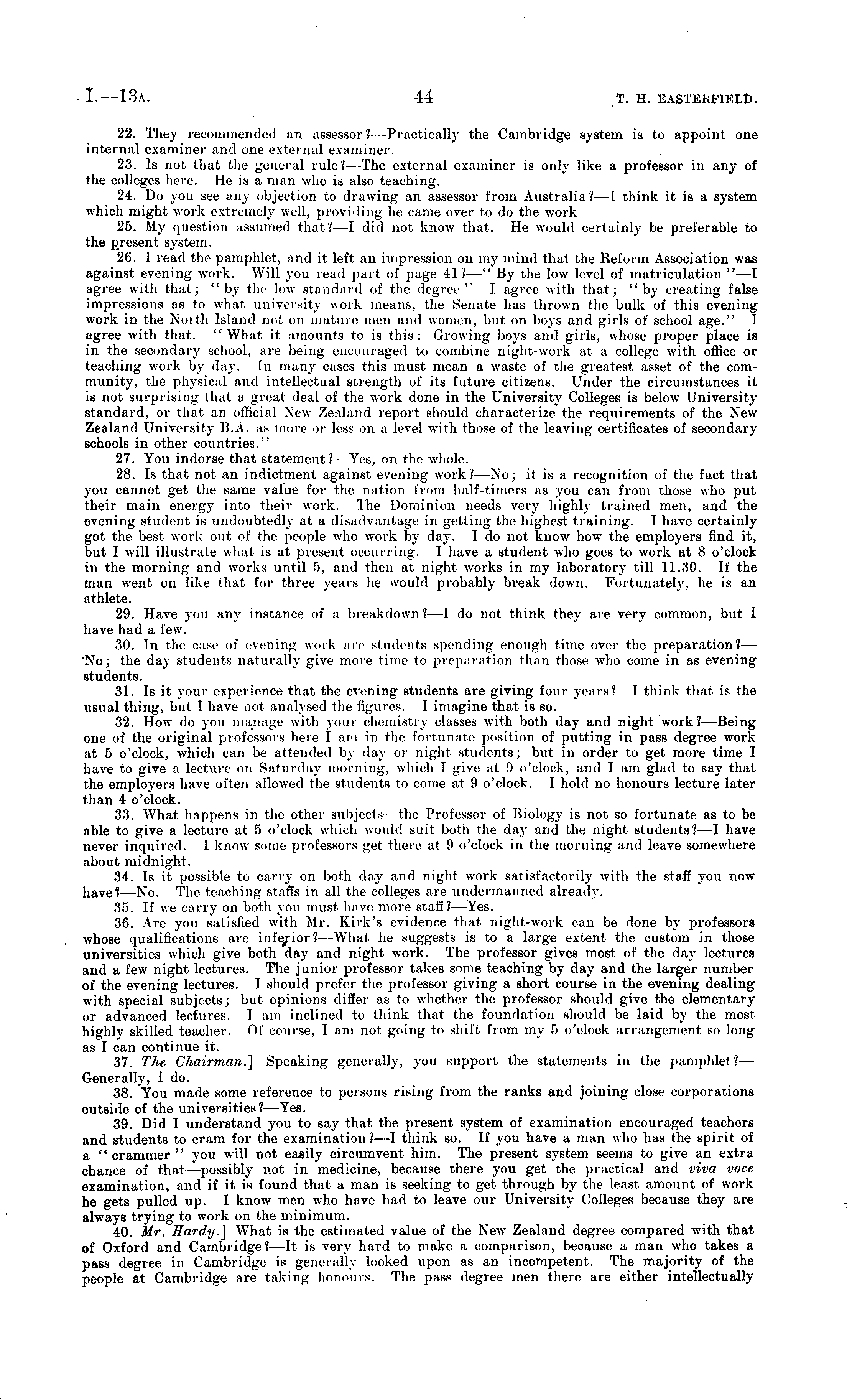 22. They recommended an assessor? —Practically the Cambridge system is to appoint one internal examiner and one external examiner. 23. Is not that Die general rule? —The external examiner is only like a professor in any of the colleges here. He i.s a man who is also teaching. 24. Do you see any objection to drawing an assessor from Australia? —I think it is a system which might work extremely well, providing he came over to do the work 25. My question assumed that?—l did not know that. He would certainly be preferable to the present system. 26. I read the pamphlet, and it left an impression on my mind that the Reform Association was against evening work. Will you read part of page 41 1 —" By the low level of matriculation " — I agree with that; "by the low standard of the degree" — 1 agree with that; "by creating false impressions as to what university work means, the Senate has thrown the bulk of this evening work in the North Island not on mature men and women, but on boys and girls of school age." 1 agree with that. "What ii amounts to is this: Growing boys and girls, whose proper place is in the secondary school, are being encouraged to combine night-work at a college with office or teaching work by day. In many cases this must mean a waste of the greatest asset of the community, the physical and intellectual strength of its future citizens. Under the circumstances it is not surprising that a great deal of the work done in the University Colleges is below University standard, or that an official New Zealand report should characterize the requirements of the New Zealand University B.A. as more or less on a level with those of the leaving certificates of secondaryschools in other countries." 27. You indorse thai statement? — Yes, on the whole. 28. Is that not an indictment against evening work? —No; it is a recognition of the fact that you cannot get the same value for the nation from half-timers as you can from those who put their main energ}- into their work. 'I lie Dominion needs very highly trained men, and the evening student is undoubtedly at a disadvantage in getting the highest training. I have certainly got the best work out oi' the people who work by day. Ido not know how the employers find it, but I will illustrate what is at present occurring. I have a student who goes to work at 8 o'clock in the morning and works until 5, and then at night works in my laboratory till 11.30. If the man went on like that for three years he would probably break down. Fortunately, he is an athlete. 29. Have you any instance of a breakdown?—l do not think they are very common, but I have had a few. 30. In the case of evening work are students spending enough time over the preparation? — No; the day students naturally give more time to preparation than those who come in as evening students. 31. Is it your experience that the evening students are giving four years? —I think that is the usual thing, but I have not analysed the figures. 1 imagine that is so. 32. How do you manage with your chemistry classes with both day and night work? —Being one of the original professors here I am in the fortunate position of putting in pass degree work at 5 o'clock, which can be attended by day or night students; but in order to get more time I have to give a lecture on Saturday morning, which 1 give at !) o'clock, and I am glad to say that the employers have often allowed the students to come at 9 o'clock. 1 hold no honours lecture later than 4 o'clock. 33. What happens in the other subjects—the Professor of Biology is not so fortunate as to be able to give a lecture at 5 o'clock which would suit both the day and the night students?—l have never inquired. I know si,me professors get there at 9 o'clock in the morning and leave somewhere about midnight. 34. Is it possible to carry on both day and night work satisfactorily with the staff you now have? —No. The teaching staffs in all the colleges are undermanned already. 35. If we carry on both you must have more staff?— Yes. 36. Are you satisfied with Mr. Kirk's evidence that night-work can be done by professors whose qualifications are inferior? —What he suggests is to a large extent the custom in those universities which give both day and night work. The professor gives most of the day lectures and a few night lectures. The junior professor takes some teaching by day and the larger number of the evening lectures. I should prefer the professor giving a short course in the evening dealing with special subjects; but opinions differ as to whether the professor should give the elementary or advanced lectures. I am inclined to think that the foundation should be laid by tint most highly skilled teacher. Of course, lam not going to shift from my ."> "'clock arrangement so long as I can continue it. 37. The Chairman.] Speaking generally, you support the statements in the pamphlet?— Generally, I do. 38. You made some reference to persons rising from the ranks and joining close corporations outside of the universities? —Yes. 39. Did I understand you to say that the present system of examination encouraged teachers and students to cram for the examination? —I think so. If you have a man who has the spirit of a " crammer " you will not easily circumvent him. The present system seems to give an extra chance of that —possibly not in medicine, because there you get the practical and viva voce examination, and if it is found that a man is seeking to get through by the least amount of work he gets pulled up. I know men who have had to leave our University Colleges because they are always trying to work on the minimum. 40. Mr. Hardy.] What is the estimated value of the New Zealand degree compared with that of Oxford and Cambridge?—lt is very hard to make a comparison, because a man who takes a pass degree in Cambridge is generally looked upon as an incompetent. The majority of the people at Cambridge are taking honours. The pass degr