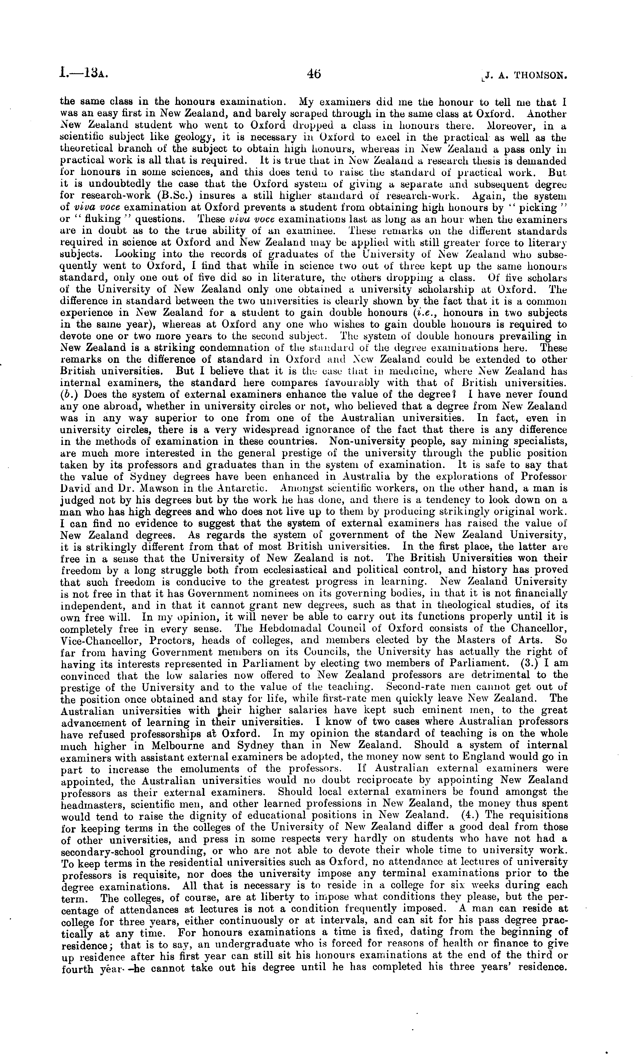 the same class iv the honours examination. My examiners did me the honour to tell me that 1 was an easy first in New Zealand, and barely scraped through in the same class at Oxford. Another New Zealand student who went to Oxford dropped a class in honours there. Moreover, in a scientific subject like geology, it is necessary in Oxford to excel in the practical as well as the theoretical branch of the subject to obtain high honours, whereas in New Zealand a pass only in practical work is all that is required. It is true that in New Zealand a research thesis is demanded for honours in some sciences, and this does tend to raise die standard of practical work. But it is undoubtedly the case that the Oxford system of giving a separate and subsequent degree for research-work (B.Sc.) insures a still higher standard of research-work. Again, the system of viva voce examination at Oxford prevents a student from obtaining high honours by " picking " or '' fluking ' questions. These viva vocc examinations last as long as an hour when the examiners are in doubt as to the true ability of an examinee. These remarks on the different standards required in science at Oxford and New Zealand may be applied with still greater force to literary subjects. Looking into the records of graduates of the University of New Zealand who subsequently went to Oxford, 1 find that while in science two out of three kept up the same honours standard, only one out of five did so in literature, the others dropping a class. Of five scholars of the University of New Zealand only one obtained a university scholarship at Oxford. The difference in standard between the two universities is clearly shown by the fact that it is a common experience in New Zealand for a student to gain double honours (i.e., honours in two subjects in the same year), whereas at Oxford any one who wishes to gain double honours is required to devote one or two more years to the second subject. The system of double honours prevailing in New Zealand is a striking condemnation of the standard of the degree examinations here. These remarks on the difference of standard in Oxford and .New Zealand could be extended to other British universities. But 1 believe that it is the case ihat in medicine, where New Zealand has internal examiners, the standard here compares favourably with that of British universities. (6.) Does the system of external examiners enhance the value of the degree? I have never found any one abroad, whether in university circles or not, who believed that a degree from New Zealand was in any way superior to one from one of the Australian universities. In fact, even in university circles, there is a very widespread ignorance of the fact that there is any difference in the methods of examination in these countries. Non-university people, say mining specialists, are much more interested in the general prestige of the university through the public position taken by its professors and graduates than in the system of examination. It is safe to say that the value of Sydney degrees have been enhanced in Australia by the explorations of Professor David and Dr. Mawson in the Antarctic. Amongst scientific workers, on the other hand, a man is judged not by his degrees but by the work he has done, and there is a tendency to look down on a man who has high degrees and who does not live up to them by producing strikingly original work. I can find no evidence to suggest that the system of external examiners has raised the value of New Zealand degrees. As regards the system of government of the New Zealand University, it is strikingly different from that of most British universities. In the first place, the latter are free in a sense that the University of New Zealand is not. The British Universities won their freedom by a long struggle both from ecclesiastical and political control, and history has proved that such freedom is conducive to the greatest progress in learning. New Zealand University is not free in that it has Government nominees on its governing bodies, in that it is not financially independent, and in that it cannot grant new degrees, such as that in theological studies, of its own free will. In my opinion, it will never be able to carry out its functions properly until it is completely free in every sense. The Hebdomadal Council of Oxford consists of the Chancellor, Vice-Chancellor, Proctors, heads of colleges, and members elected by the Masters of Arts. So far from having Government members on its Councils, the University has actually the right of having its interests represented in Parliament by electing two members of Parliament. (3.) I am convinced that the low salaries now offered to New Zealand professors are detrimental to the prestige of the University and to the value of tlie teaching. Second-rate men cannot get out of the position once obtained and stay for life, while first-rate men quickly leave New Zealand. The Australian universities with their higher salaries have kept such eminent men, to the great advancement of learning in their universities. I know of two cases where Australian professors have refused professorships at Oxford. In my opinion the standard of teaching is on the whole much higher in Melbourne and Sydney than in New Zealand. Should a system of internal examiners with assistant external examiners be adopted, the money now sent to England would go in part to increase the emoluments of the professors. If Australian external examiners were appointed, the Australian universities would no doubt reciprocate by appointing New Zealand professors as their external examiners. Should local external examiners be found amongst the headmasters, scientific men, and other learned professions in New Zealand, the money thus spent would tend to raise the dignity of educational positions in New Zealand. (4.) The requisitions for keeping terms in the colleges of the University of New Zealand differ a good deal from those of other univer