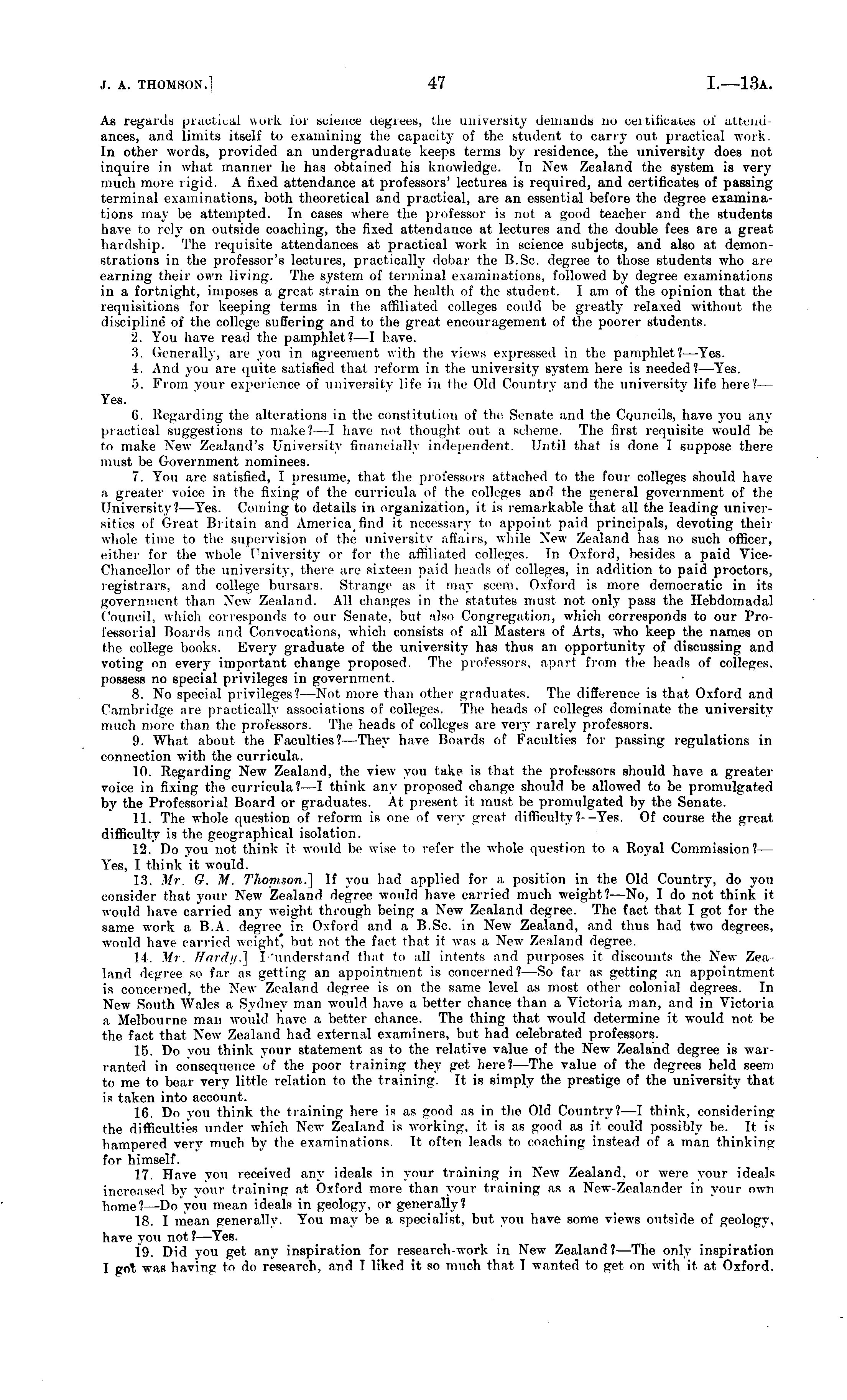 As regards practical work for science degrees, the university demands no cci tihcates oi attendances, and limits itself to examining the capacity of the student to carry out practical work. In other words, provided an undergraduate keeps terms by residence, the university does not inquire in what manner he has obtained his knowledge. In New Zealand the system is very much more rigid. A fixed attendance at professors' lectures is required, and certificates of passing terminal examinations, both theoretical and practical, are an essential before the degree examinations may be attempted. In cases where the professor is not a good teacher and the students nave to rely on outside coaching, the fixed attendance at lectures and the double fees are a great hardship. The requisite attendances at practical work in science subjects, and also at demonstrations in the professor's lectures, practically debar the B.Sc. degree to those students who c.iiiiiug their own living. The system of terminal examinations, followed by degree examinations in a fortnight, imposes a great strain on the health of the student. lam of the opinion that the requisitions for keeping terms in the affiliated colleges could be greatly relaxed without the discipline of the college suffering and to the great encouragement of the poorer students. 2. You have read the pamphlet?—l have. 3. Generally, are you in agreement with the views expressed in the pamphlet?— Yes. I. And viiii are quite satisfied thai reform in the university system here is needed? —Yes. .">. From your experience of university life in the Old Country and the university life here? — Yes. 6. Regarding the alterations in the constitution of the Senate and the Councils, have you any practical suggestions to make?—] have not thought out a scheme. The first requisite would be to make New Zealand's University financially independent. Until that is done I suppose there must be Government nominees. 7. You are satisfied, I presume, that the professors attached to the four colleges should have a greater voice in the fixing of the curricula of the colleges and the general government of the University?— Yes. Coming to details in organization, it is remarkable that all the leading universities of Great Britain and Americafind it necessary to appoint paid principals, devoting their whole time to the supervision of the university affairs, while Now Zealand has no such officer, either for the whole University or for the affiliated colleges. In Oxford, besides a paid ViceChancellor of the university, there are sixteen paid heads of colleges, in addition to paid proctors, registrars, and college bursars. Strange as it may seem. Oxford is more democratic in its government than New Zealand. All changes in the statutes must not only pass the Hebdomadal Council, which corresponds to our Senate, but also Congregation, which corresponds to our Professorial Boards and Convocations, which consists of all Masters of Arts, who keep the names on the college books. Every graduate of the university has thus an opportunity of discussing and voting on every important change proposed. The professors, apart from the heads of colleges, possess no special privileges in government. 8. No special privileges? —Not more than other graduates. The difference is that Oxford and Cambridge are practically associations of colleges. The heads of colleges dominate the university much more than the professors. The heads of colleges are very rarely professors. 9. What about the Faculties? —They have Hoards of Faculties for passing regulations in connection with the curricula. 10. Regarding New Zealand, the view you fake is that the professors should have a greater voice in fixing the curricula? —I think any proposed change should be allowed to be promulgated by the Professorial Board or graduates. At present it must be promulgated by the Senate. 11. The whole question of reform is one of very great difficulty 1- -Yes. Of course the great difficulty is the geographical isolation. 12. Do you not think it would be wise to refer the whole question to a Royal Commission? — Yes, I think it would. 13. Mr. G. M . T7wpnson.~\ If you had applied for a position in the Old Country, do you consider that your Xew Zealand degree would have carried much weight?—No, I do not think it would have carried any weight through being a Xew Zealand degree. The fact that I got for the same work a TS.A. degree in Oxford and a B.Sc. in New Zealand, and thus had two degrees, would have carried weight" but not the fact that it was a New Zealand degree. 14. Mr. Hardy.'] I-'understand that to all intents and purposes it discounts the New Zealand degree so far as getting an appointment is concerned? —So far as getting an appointment is concerned, the New Zealand degree is on the same level as most other colonial degrees. In New South Wales a Sydney man would have a better chance than a Victoria man, and in Victoria a Melbourne man would have B better chance. The thing that would determine it would not be the fact that New Zealand had external examiners, but had celebrated professors. 15. Do you think your statement as to the relative value of the New Zealand degree is warranted in consequence of the poor training they got here?— The value of the degrees held seem to me to bear very little relation to the training. Tt is simply the prestige of the university that is taken into account. 16. Do you think the training here is as good as in the Old Country?—l think, considering the difficulties under which New Zealand is working, it is as good as it could possibly be. It is hampered very much by the examinations. Tt often leads to coaching instead of a man thinking for himself. 17. Have you received any ideals in your training in Now Zealand, or were your ideals increased by your training at Oxford more than your training as a New-Zealandor in your own home?—Do you mean ideals in geology, or generally? 18. I mean gener