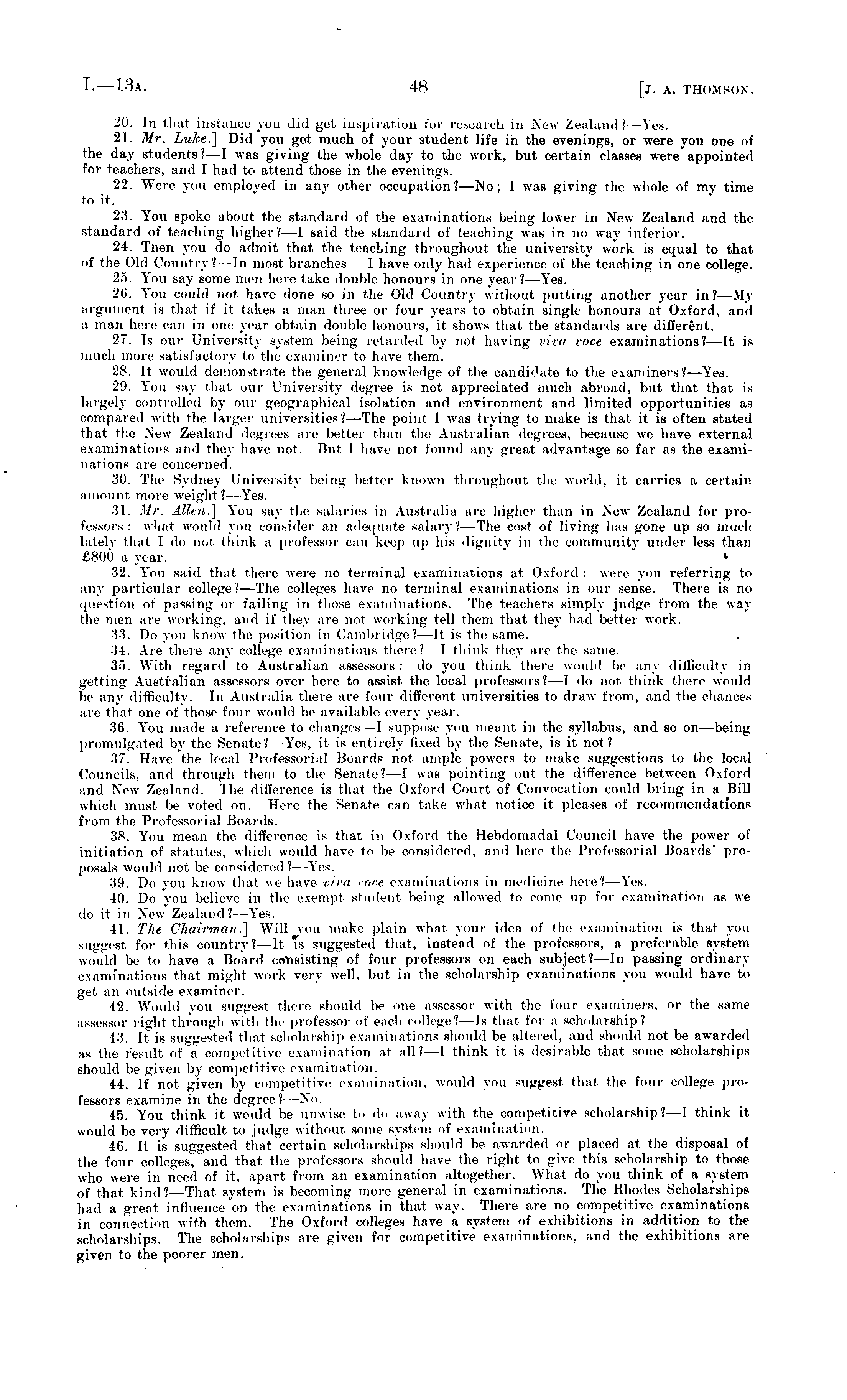 20. In that instance you did gut inspiration for research in New Zealand .' i'es. 21. Mr. Luke.] Did you get much of your student life in the evenings, or were you one of the day students? —I was giving the whole day to the work, but certain classes were appointed for teachers, and I had to attend those in the evenings. 22. Were you employed in any other occupation/ — No; 1 was giving the whole of mv time to it. i , -!. Yon spoke about the standard of the examinations being lower in New Zealand and the stamlaid of teaching higher? — l said the standard of teaohing was in no way inferior. 24. Then you do admit that the teaching throughout the university work is equal to that of the Old Country ! — ln most branches. I have only had experience of the teaching in one college. 25. You say some men here take double honours in one vear!—Fes. 2(>. You could not have done so in the Old Country without putting another year in J — Mγ argument is that if it takes a man three or four years to obtain single honours at Oxford, and a man hero can in one year obtain double honours, it shows that the standards are different. 27. Is our University system being retarded by not having viva race examinations?— lt is much more satisfactory to the examiner to have them. 28. It would demonstrate the general knowledge of the candidate to the examiners) — Yes. 29. You say that our University degree is not appreciated much abroad, but that that is largely controlled by our geographical isolation and environment and limited opportunities as compared with the larger universities?— The point I was trying to make is that it is often stated that the Xew Zealand degrees are better than the Australian degrees, 1 ause we have external examinations and they have not. But I have not found any great advantage so far as the examinat ions are concerned. ■'!(). The Sydney University being better known throughout the world, it carries a certain amount more weight?— Yes. ■') I . Mr. Alien.] You say the salaries in Australia are higher than in New Zealand for pro fessors : what would you consider an adequate salary.'- The cost of living has gone up so much lately that I do not think a professor can keep up his dignity in the community under less than £800 a y< ar. 32. You said that there were no terminal examinations at Oxford: were you referring to any particular college? The colleges have no terminal examinations in our sense. There is no question of passing or failing in those examinations. The teachers simply judge from the way the men are working, and if they are not working tell them that they had better work. •S.S. Do you know the position in Cambridge? — It i.s the same. 34. Are there any college examinations there? — I think they are the same. 35. With regard to Australian assessors: do you think there would be any difficulty in getting Australian assessors over here to assist the local professors.' —1 do not think there would be any difficulty. In Australia there arc four different universities to draw from, and the chances are that one of those four would be available every year. 36. You made a reference to changes—l suppose you meant in the syllabus, and so on—being promulgated by the Senate?— Yes, it is entirely fixed by the Senate, is it not? 37. Have the lecal Professorial Boards not ample powers to make suggestions to the local Councils, and through then: to the Senate?—l was pointing out the. difference between Oxford and New Zealand. '1 lie difference is that the Oxford Court of Convocation could bring in a Hill which must be voted on. Here the Senate can take what notice it pleases of recommendations from the Professorial Hoards. 3.8. You mean the difference is that in Oxford the Hebdomadal Council have the power of initiation of statutes, which would have to be considered, and here the I'rol'essorial Hoards' proposals would not be considered ?- Yes. .'!!). Do vnii know that we have viva voce examinations in medicine here.'—Yes. 10. Do you believe in the exempt student being allowed to come up for examination as we do it in New Zealand? —Yes. 11. Tht Chairman.] Will you make plain what your idea of the examination is that you suggest for this count ry.' -It Is suggested that, instead of the professors, a preferable system would be to have a Board consisting of four professors on each subject? In passing ordinary examinations that mighi work very well, but in the scholarship examinations yon would have to get an outside examiner. 42. Would you suggest there should be one assessor with the four examiners, or the same assessor right through with the professor of each college) —Is that for a scholarship? 4.'5. It is suggested that scholarship examinations should be altered, and should not be awarded as the result of a competitive examination at all? I thin!; it is desirable that some scholarships should be given b3 T competitive examination. 11. If not given by competitive examination, would you suggest that the four college professors examine in (he degree J — No. 15, You think it would be unwise to do away with the competitive scholarship?—l think it would be very difficult to judge without some system of examination. 46. It is suggested that certain scholarships should lie awarded or placed at the disposal of the four colleges, and that the professors should have the right to give this scholarship to those who were in need of it, apart from an examination altogether. "What do you think of a system of that kind] That system is becoming more general in examinations. The Rhodes Scholarships had a great influence on the examinations in that way. There are no competitive examinations in connection with them. The Oxford colleges have a system of exhibitions in addition to the scholarships. The scholarships are given for competitive examinations, and the exhibitions are given to the poorer men.