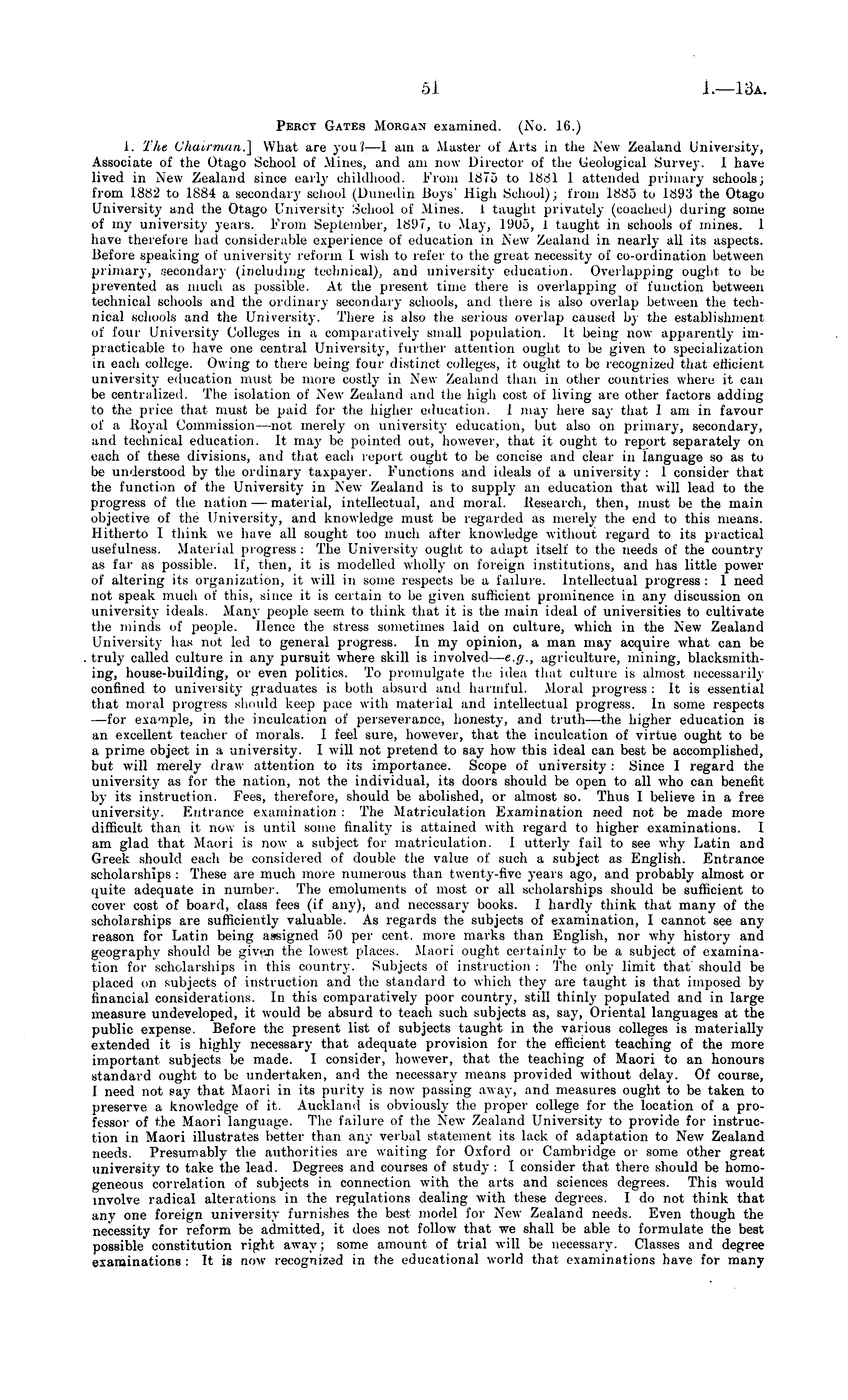 Percy Gates Morgan examined. (No. 16.) i. The Chairman.] What are youl —I am a Master of Arts in the New Zealand University, Associate of the Otago School of Mines, and am now Director of the Geological Survey. 1 have lived in New Zealand since early childhood. From 1875 to 1881 1 attended primary schools; from 1882 to 1884 a secondary school (Dunedin Boys' High School); from 1885 to 1893 the Otago University and the Otago University School of Alines. I taught privately (coached) during some of my university y< ars. From September, 1897, to May, 1!)U5, I taught in schools of mines. 1 have therefore had considerable experience of education in New Zealand in nearly all its aspects. Before speaking of university reform 1 wish to refer to the great necessity of co-ordination between primary, secondary (including inimical), and university education. Overlapping ought to be prevented as much as possible. At the present time there is overlapping of function between technical schools and the ordinary secondary schools, and there is also overlap between the technical school:, and the University. Fhere is also the serious overlap caused by the establishment of four University Colleges in a comparatively small population. It being now apparently impracticable to have one central University, further attention ought to be given to specialization in each college. Owing to there being four distinct colleges, it ought to be recognized that efficient university education musl be more costly in New Zealand than in other countries where it can be centralized. The isolation of New Zealand and the high cost of living are other factors adding to the price that must be paid for the higher education. 1 may here say that I am in favour of a Royal Commission —not merely on university education, but also on primary, secondary, and technical education. It may be pointed out, however, that it ought to report separately on each of these divisions, and that each report ought to lie concise and clear in language so as to be understood by the ordinary taxpayer. Functions and ideals of a university : 1 consider that the function of the University in New Zealand is to supply an education that will lead to the progress of the nation — material, intellectual, and moral. Research, then, must lie the main objective of the University, and knowledge must be regarded as merely the end to this means. Hitherto I think we have all sought too much after knowledge without regard to its practical usefulness. Material progress : The University ought to adapt itself to the needs of the country as far as possible. If, then, it is modelled wholly on foreign institutions, and has little power of altering its organization, it will in some respects be a failure. Intellectual progress : 1 need not speak much of this, since it is certain to be given suiiicient prominence in any discussion on university ideals. Many people seem to think that, it is the main ideal of universities to cultivate the minds of people. Hence the stress sometimes laid on culture, which in the New Zealand University has not led to general progress. In my opinion, a man maj acquire what can be truly called culture in any pursuit where skill is involved — e.g., agriculture, mining, blacksmithing, house-building, or even politics. To promulgate tin , idea that culture is almost necessarily confined to university graduates is both absurd ami harmful. Moral progress: It is essential that moral progress should keep pace with material and intellectual progress. In some respects —for example, in the inculcation of perseverance, honesty, and truth—the higher education is an excellent teacher of morals. I feel sure, however, that the inculcation of virtue ought to be a prime object in a university. 1 will not pretend to say how this ideal can best be accomplished, but will merely draw attention to its importance. Scope of university : Since I regard the university as for the nation, not the individual, its doors should be open to all who can benefit by its instruction. Fees, therefore, should be abolished, or almost so. Thus I believe in a free university. Entrance examination : The Matriculation Examination need not be made more difficult than it. now is until some finality is attained with regard to higher examinations. 1 am glad that Maori is now a subject for matriculation. 1 utterly fail to see why Latin and Greek should each lie considered of double the value of such a subject as English. Entrance scholarships: These are much more numerous than twenty-five years ago, and probably almost or quite adequate in number. The emoluments of most or all scholarships should be sufficient to cover cost of board, class fees (if any), and necessary hooks. 1 hardly think that many of the scholarships are sufficiently valuable. As regards the subjects of examination, I cannot see any reason for Latin being assigned 50 per cent, more marks than English, nor why history and geography should be giveji the lowest places. Maori ought certainly to be a subject of examination for scholarships in this country. Subjects of instruction : The only limit that should be placed on subjects of instruction and the standard to which they are taught is that imposed by financial considerations. In this comparatively poor country, still thinly populated and in large measure undeveloped, it would be absurd to teach such subjects as, say, Oriental languages at the public expense. Before the present list of subjects taught in the various colleges is materially extended it is highly necessary that adequate provision for the efficient teaching of the more important subjects be made. I consider, however, that the teaching of Maori to an honours Standard ought to be undertaken, and the necessary means provided without delay. Of course, I need not Bay that Maori in its purity is now passing away, and measures ought to be taken to preserve a knowledge of it. Auckland is obviously the proper college for th