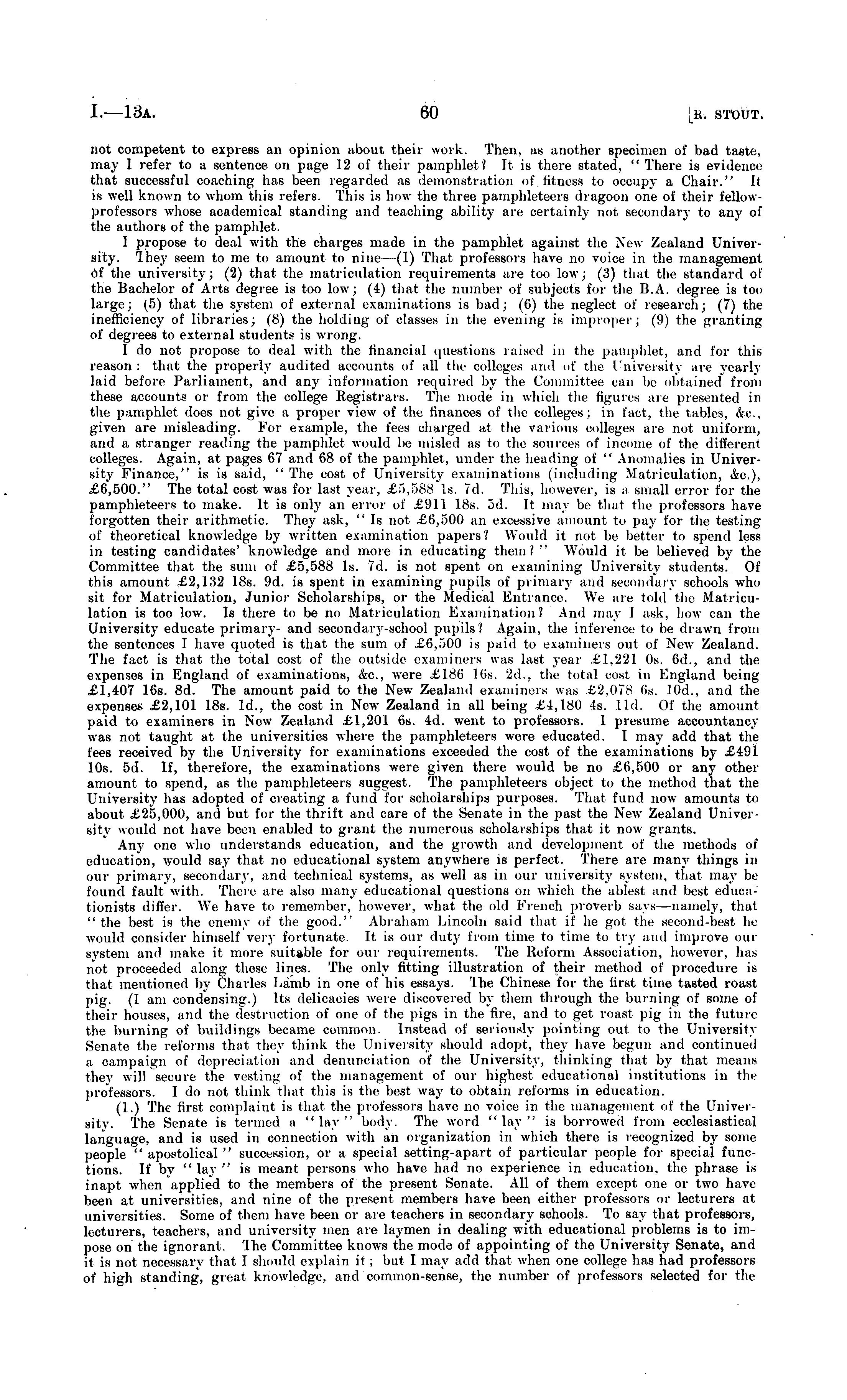 not competent to express an opinion about their work. Then, as another specimen of bad taste, may I refer to a sentence oir page 12 of their pamphlet? It is there stated, " There is evidence that successful coaching has been regarded as demonstration of fitness to occupy a Chair." It is xvell knoxvn to xvhom this refers. This is how the three pamphleteers dragoon one of their fellowprofessors xvlrose academical standing and teaching ability are certainly not secondary to any of the authors of the pamphlet. I propose to deal with the charges made in the pamphlet against the Nexv Zealand University. Ihey seem to me to amount to nine—(1) That professors have no voice in the management 6f the unix'ersity; (2) that the matriculation requirements are too low; (3) that the standard of the Bachelor of Arts degree is too low; (4) that the number of subjects for the B.A. degree is too large; (5) that the system of external examinations is bad; (6) the neglect of research; (7) the inefficiency of libraries; (8) the holding of classes in the evening is improper; (9) the granting of degrees to external students is xvrong. I do not propose to deal with the financial questions raised in the pamphlet, and for this reason: that the properly audited accounts of all the colleges and. of the University are yearly laid before Parliament, and any information required by the Committee can be obtained from these accounts or from the college Registrars. The mode in xvhich the figures are presented in the pamphlet does not give a proper view of the finances of the colleges: in fact, the tables, Ac., given are misleading. For example, the fees charged at the various colleges are not uniform, and a stranger reading the pamphlet would he misled as to the sources of income of the different colleges. Again, at pages 67 and 68 of the pamphlet, under the heading of " Anomalies in University Finance," is is said, "The cost of University examinations (including Matriculation, &c), £6,500." The total cost xvas for last year, £5,588 Is. 7d. This, however, is a small error for the pamphleteers to make. It is only an error of £911 18s. sd. It may be that the professors have forgotten their arithmetic. They ask, "Is not £6,500 an excessive amount to pay for the testing of theoretical knowledge by written examination papers? Would it not be hitter to spend less in testing candidates' knoxvledge and more in educating them? " Would it be believed by the Committee that the sum of £5,588 Is. 7d. is not spent on examining University students. Of this amount £2,132 18s. 9d. is spent in examining pupils of primary and secondary schools who sit for Matriculation, Junior Scholarships, or the Medical Entrance. We are told the Matriculation is too low. Is there to be no Matriculation Examination? And max- I ask, how can the University- educate primary- and secondary-school pupils! Again, the inference to he drawn from the sentences I have quoted is that the sum of £6,500 is paid to examiners out of Nexv Zealand. The fact is that the total cost of the outside examiners xvas last year £1.221 os. 6d., and the expenses in England of examinations, &c., were £186 16s. 2d., the total cost in England being £1,407 16s. Bd. The amount paid to the Nexv Zealand examiners xvas £2,078 <>s. 10d., and the expenses £2,101 18s. Id., the cost in Nexv Zealand in all being £4,180 Is. lid. Of the amount paid to examiners in New Zealand £1,201 6s. 4d. xvent to professors. I presume accountancy xvas not taught at the universities where the pamphleteers xvere educated. I may add that the fees received by the University for examinations exceeded the cost of the examinations by £491 10s. sd. If, therefore, the examinations were given there xvould be no £6,500 or any other arrrount to spend, as the pamphleteers suggest. The pamphleteers object to the method that the University has adopted of creating a fund for scholarships purposes. That fund now amounts to about £25,000, and but for the thrift and care of the Senate in the past the Nexv Zealand University xvould not have been enabled to grant the numerous scholarships that it now grants. Any one xvho understands education, and the growth and development of the methods of education, xvould say that no educational system anywhere is perfect. There are many things in our primal}-, secondary, and technical systems, as xvell as in our university system, that may be found fault with. There are also many educational questions on which the ablest and best educationists differ. W T e have to remember, however, xvhat the old French proverb says —namely, that " the best is the enemy of the good." Abraham Lincoln said that if he got the second-best he would consider himself very fortunate. It is our duty from time to time to try and improve our system and make it more suitable for our requirements. The Reform Association, hoxvever, has not proceeded along these lines. The only fitting illustration of their method of procedure is that mentioned by Charles I.ami) in one of his essays, 'Ihe Chinese for the first time tasted roast pig. (I am condensing.) Its delicacies were discovered by them through the burning of some of their houses, and the destruction of one of the pigs in the fire, and to get roast pig in the future the burning of buildings became common. Instead of seriously pointing out to the UniversitySenate the reforms that they think the University should adopt, they have begun and continued a campaign of depreciation and denunciation of the University, thinking that by that means they will secure the vesting of the management of our highest educational institutions in the professors. Ido not think that this is the best xvay to obtain reforms in education. (1.) The first complaint is that the professors have no voice in the management of the University. The Senate is termed a "lay" body. The word "lay" is borrowed from ecclesiastical language, and is used in connection xvith an organization in xvh