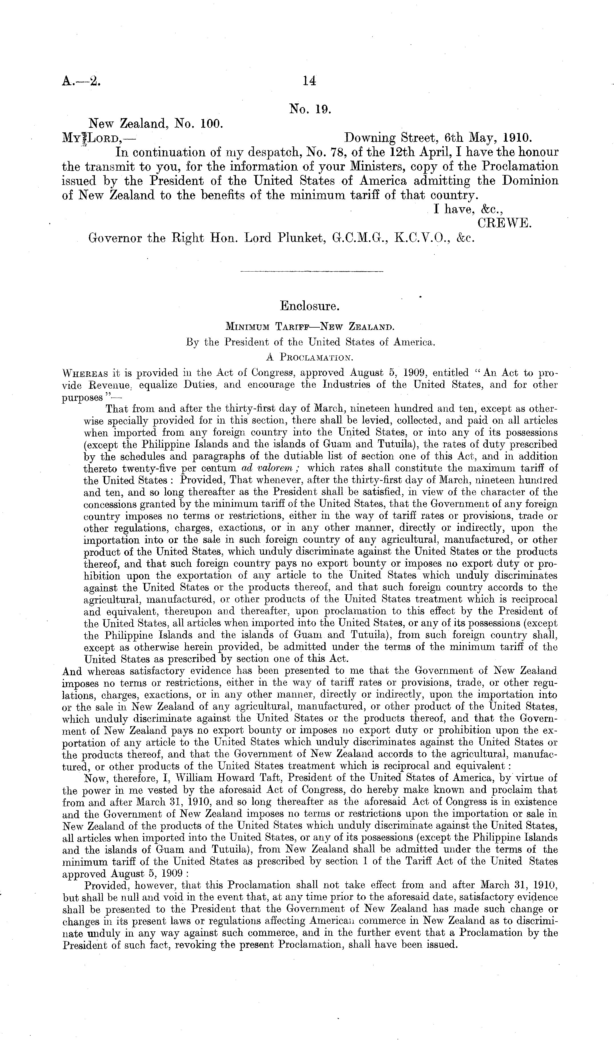 No. 19. New Zealand, No. 100. MyJLord, — Downing Street, 6th May, 1910. In continuation of my despatch, No. 78, of the 12th April, I have the honour the transmit to you, for the information of your Ministers, copy of the Proclamation issued by the President of the United States of America admitting the Dominion of New Zealand to the benefits of the minimum tariff of that country. I have, &c, CRBWE. Governor the Right Hon. Lord Plunket, G.C.M.G., X.C.V.0., &c. Enclosure. Minimum Tariff —New Zealand. By the President of the United States of America. A Proclamation. Whereas it is provided in the Act of Congress, approved August 5, 1909, entitled " An Act to provide E,evenue ; equalize Duties, and encourage the Industries of the United States, and for other purposes " — That from and after the thirty-first day of March, nineteen hundred and ten, except as otherwise specially provided for in this section, there shall be levied, collected, and paid on all articles when imported from any foreign country into the United States, or into any of its possessions (except the Philippine Islands and the islands of Guam and Tutuila), the rates of duty prescribed by the schedules and paragraphs of the dutiable list of section one of this Act, and in addition thereto twenty-five per centum ad valorem ; which rates shall constitute the maximum tariff of the United States : Provided, That whenever, after the thirty-first day of March, nineteen hundred and ten, and so long thereafter as the President shall be satisfied, in view of the character of the concessions granted by the minimum tariff of the United States, that the Government of any foreign country imposes no terms or restrictions, either in the way of tariff rates or provisions, trade or other regulations, charges, exactions, or in any other manner, directly or indirectly, upon the importation into or the sale in such foreign country of any agricultural, manufactured, or other product of the United States, which unduly discriminate against the United States or the products thereof, and that such foreign country pays no export bounty or imposes no export duty or prohibition upon the exportation of any article to the United States which unduly discriminates against the United States or the products thereof, and that such foreign country accords to the agricultural, manufactured, or other products of the United States treatment which is reciprocal and equivalent, thereupon and thereafter, upon proclamation to this effect by the President of the United States, all articles when imported into the United States, or any of its possessions (except the Philippine Islands and the islands of Guam and Tutuila), from such foreign country shall, except as otherwise herein provided, be admitted under the terms of the minimum tariff of the United States as prescribed by section one of this Act. And whereas satisfactory evidence has been presented to me that the Government of New Zealand imposes no terms or restrictions, either in the way of tariff rates or provisions, trade, or other regulations, charges, exactions, or in any other manner, directly or indirectly, upon the importation into or the sale in New Zealand of any agricultural, manufactured, or other product of the United States, which unduly discriminate against the United States or the products thereof, and that the Government of New Zealand pays no export bounty or imposes no export duty or prohibition upon the exportation of any article to the United States which unduly discriminates against the United States or the products thereof, and that the Government of New Zealand accords to the agricultural, manufactured., or other products of the United States treatment which is reciprocal and equivalent : Now, therefore, I, William Howard Taft, President of the United States of America, by virtue of the power in me vested by the aforesaid Act of Congress, do hereby make known and proclaim that from and after March 31, 1910, and so long thereafter as the aforesaid Act of Congress is in existence and the Government of New Zealand imposes no terms or restrictions upon the importation or sale in New Zealand of the products of the United States which unduly discriminate against the United States, all articles when imported into the United States, or any of its possessions (except the Philippine Islands and the islands of Guam and Tutuila), from New Zealand shall be admitted under the terms of the minimum tariff of the United States as prescribed by section 1 of the Tariff Act of the United States approved August 5, 1909 : Provided, however, that this Proclamation shall not take effect from and after March 31, 1910, but shall be null and void in the event that, at any time prior to the aforesaid date, satisfactory evidence shall be presented to the President that the Government of New Zealand has made such change or changes in its present laws or regulations affecting American commerce in New Zealand as to discriminate unduly in any way against such commerce, and in the further event that a Proclamation by the President of such fact, revoking the present Proclamation, shall have been issued.