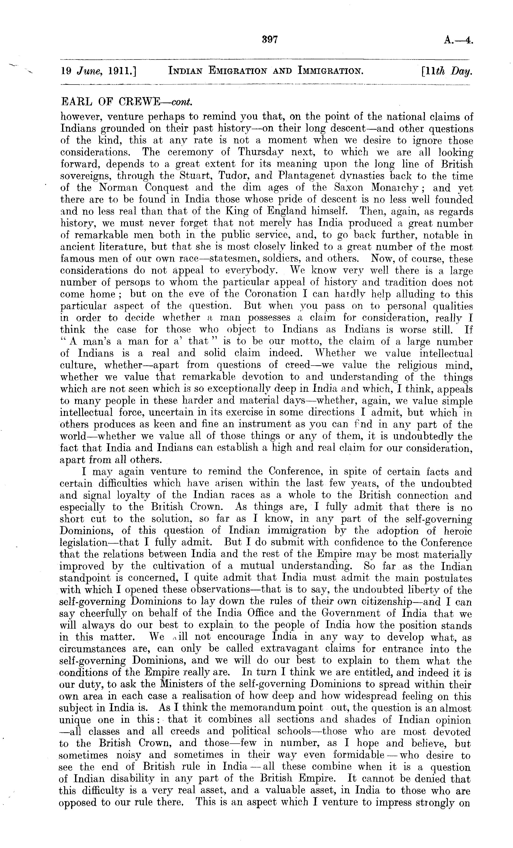 19 June, 1911.] Indian Emigration and Immigration. [11th Day. EARL OF CREWE— cont. however, venture perhaps to remind you that, on the point of the national claims of Indians grounded on their past history—on their long descent—and other questions of the kind, this at any rate is not a moment when we desire to ignore those considerations. The ceiemony of Thursday next, to which we are all looking forward, depends to a great extent for its meaning upon the long line of British sovereigns, through the Stuart, Tudor, and Plantagenet dynasties back to the time of the Norman Conquest and the dim ages of the Saxon Monaichy; and yet there are to be found in India those whose pride of descent is no less well founded and no less real than that of the King of England himself. Then, again, as regards history, we must never forget that not merely has India produced a great number of remarkable men both in the public service, and, to go back further, notable in ancient literature, but that she is most closely linked to a great number of the most famous men of our own race—statesmen, soldiers, and others. Now, of course, these considerations do not appeal to everybody. We know very well there is a large number of persons to whom the particular appeal of history and tradition does not come home ; but on the eve of the Coronation I can hardly help alluding to this particular aspect of the question. But when you pass on to personal qualities in order to decide whether a man possesses a claim for consideration, really I think the case for those who object to Indians as Indians is worse still. If " A man's a man for a' that " is to be our motto, the claim of a large number of Indians is a real and solid claim indeed. Whether we value intellectual culture, whether—apart from questions of creed—we value the religious mind, whether we value that remarkable devotion to and understanding of the things which are not seen which is so exceptionally deep in India and which, I think, appeals to many people in these harder and material days—whether, again, we value simple intellectual force, uncertain in its exercise in some directions I admit, but which in others produces as keen and fine an instrument as you can fnd in any part of the world—whether we value all of those things or any of them, it is undoubtedly the fact that India and Indians can establish a high and real claim for our consideration, apart from all others. I may again venture to remind the Conference, in spite of certain facts and certain difficulties which have arisen within the last few years, of the undoubted and signal loyalty of the Indian races as a whole to the British connection and especially to the British Crown. As things are, I fully admit that there is no short cut to the solution, so far as I know, in any part of the self-governing Dominions, of this question of Indian immigration by the adoption of heroic legislation —that I fully admit. But Ido submit with confidence to the Conference that the relations between India and the rest of the Empire may be most materially improved by the cultivation of a mutual understanding. So far as the Indian standpoint is concerned, I quite admit that India must admit the main postulates with which I opened these observations—that is to say, the undoubted liberty of the self-governing Dominions to lay down the rules of their own citizenship—and I can say cheerfully on behalf of the India Office and the Government of India that we will always do our best to explain to the people of India how the position stands in this matter. We all not encourage India in any way to develop what, as circumstances are, can only be called extravagant claims for entrance into the self-governing Dominions, and we will do our best to explain to them what the conditions of the Empire really are. In turn I think we are entitled, and indeed it is our duty, to ask the Ministers of the self-governing Dominions to spread within their own area in each case a realisation of how deep and how widespread feeling on this subject in India is. As I think the memorandum point out, the question is an almost unique one in this : that it combines all sections and shades of Indian opinion —all classes and all creeds and political schools—those who are most devoted to the British Crown, and those —few in number, as I hope and believe, but sometimes noisy and sometimes in their way even formidable — who desire to see the end of British rule in India — all these combine when it is a question of Indian disability in any part of the British Empire. It cannot be denied that this difficulty is a very real asset, and a valuable asset, in India to those who are opposed to our rule there. This is an aspect which I venture to impress strongly on