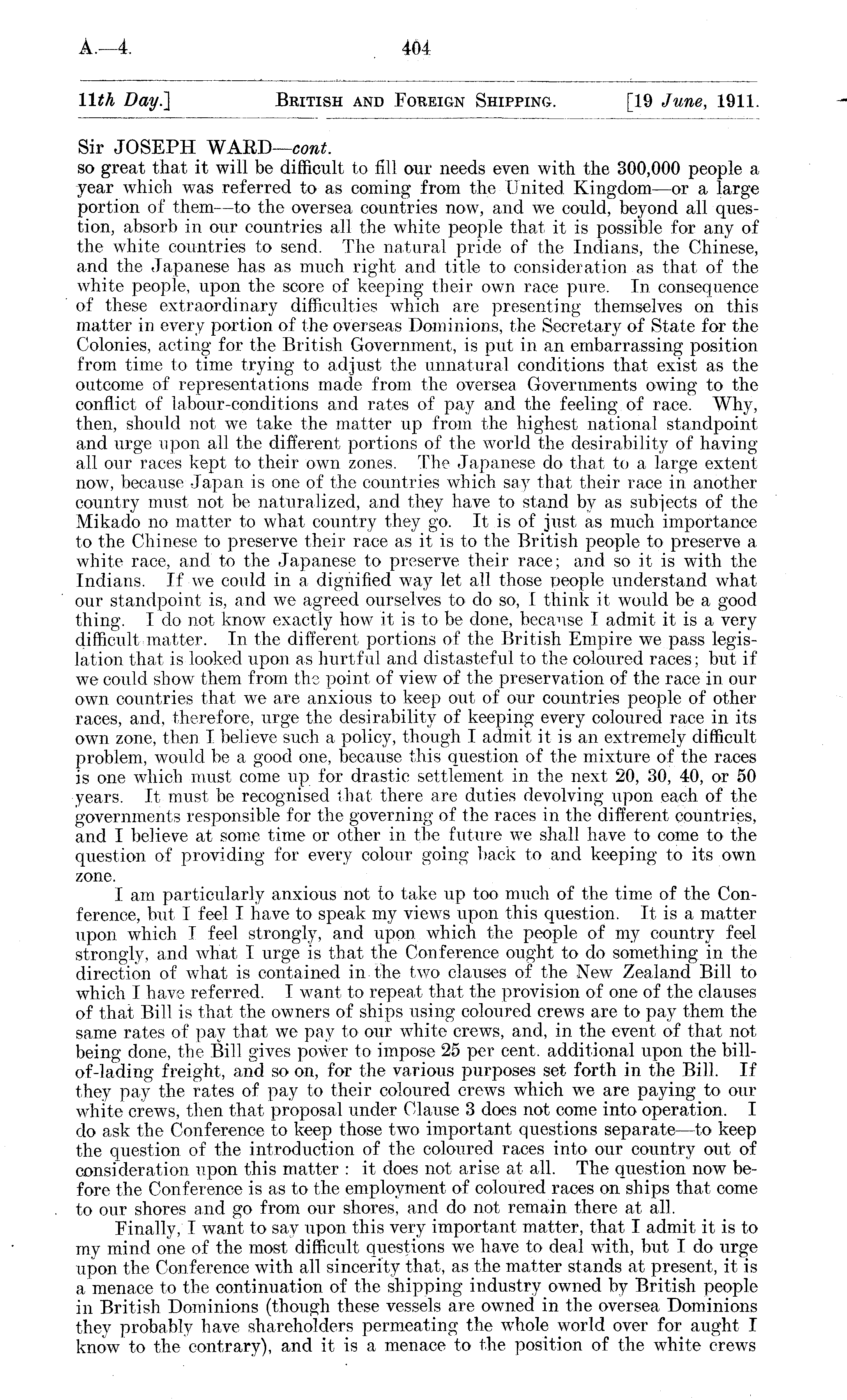 11th Day.] British and Foreign Shipping. [19 June, 1911. Sir JOSEPH WARD— cont. so great that it will be difficult to fill our needs even with the 300,000 people a year which was referred to as coming from the United Kingdom—or a large portion of them —to the oversea countries now, and we could, beyond all question, absorb in our countries all the white people that it is possible for any of the white countries to send. The natural pride of the Indians, the Chinese, and the Japanese has as much right and title to consideration as that of the white people, upon the score of keeping their own race pure. In consequence of these extraordinary difficulties which are presenting themselves on this matter in every portion of the overseas Dominions, the Secretary of State for the Colonies, acting for the British Government, is piit in an embarrassing position from time to time trying to adjust the unnatural conditions that exist as the outcome of representations made from the oversea Governments owing to the conflict of labour-conditions and rates of pay and the feeling of race. Why, then, should not we take the matter up from the highest national standpoint and urge upon all the different portions of the world the desirability of having all our races kept to their own zones. The Japanese do that to a large extent now, because Japan is one of the countries which say that their race in another country must not be naturalized, and they have to stand by as subjects of the Mikado no matter to what country they go. It is of just as much importance to the Chinese to preserve their race as it is to the British people to preserve a white race, and to the Japanese to preserve their race; and so it is with the Indians. If we could in a dignified way let all those people understand what our standpoint is, and we agreed ourselves to do so, I think it would be a good thing. I do not know exactly how it is to be done, because I admit it is a very difficult matter. In the different portions of the British Empire we pass legislation that is looked upon as hurtful and distasteful to the coloured races; but if we could show them from the point of view of the preservation of the race in our own countries that we are anxious to keep out of our countries people of other races, and, therefore, urge the desirability of keeping every coloured race in its own zone, then I believe such a policy, though I admit it is an extremely difficult problem, would be a good one, because this question of the mixture of the races is one which must come up for drastic settlement in the next 20, 30, 40, or 50 years. It must be recognised that there are duties devolving upon each of the governments responsible for the governing of the races in the different countries, and I believe at some time or other in the future we shall have to come to the question of providing for every colour going back to and keeping to its own zone. I am particularly anxious not to take up too much of the time of the Conference, but T feel I have to speak my views upon this question. It is a matter upon which I feel strongly, and upon which the people of my country feel strongly, and what I urge is that the Conference ought to do something in the direction of what is contained in the two clauses of the New Zealand Bill to which I have referred. I want to repeat that the provision of one of the clauses of that Bill is that the owners of ships using coloured crews are to pay them the same rates of pay that we pay to our white crews, and, in the event of that not being done, the Bill gives power to impose 25 per cent, additional upon the bill-of-lading freight, and so on, for the various purposes set forth in the Bill. If they pay the rates of pay to their coloured crews which we are paying to our white crews, then that proposal under Clause 3 does not come into operation. I do ask the Conference to keep those two important questions separate —to keep the question of the introduction of the coloured races into our country out of consideration upon this matter : it does not arise at all. The question now before the Conference is as to the employment of coloured races on ships that come to our shores and go from our shores, and do not remain there at all. Finally, I want to say upon this very important matter, that I admit it is to my mind one of the most difficult questions we have to deal with, but I do urge upon the Conference with all sincerity that, as the matter stands at present, it is a menace to the continuation of the shipping industry owned by British people in British Dominions (though these vessels are owned in the oversea Dominions they probably have shareholders permeating the whole world over for aught I know to the contrary), and it is a menace to the position of the white crews