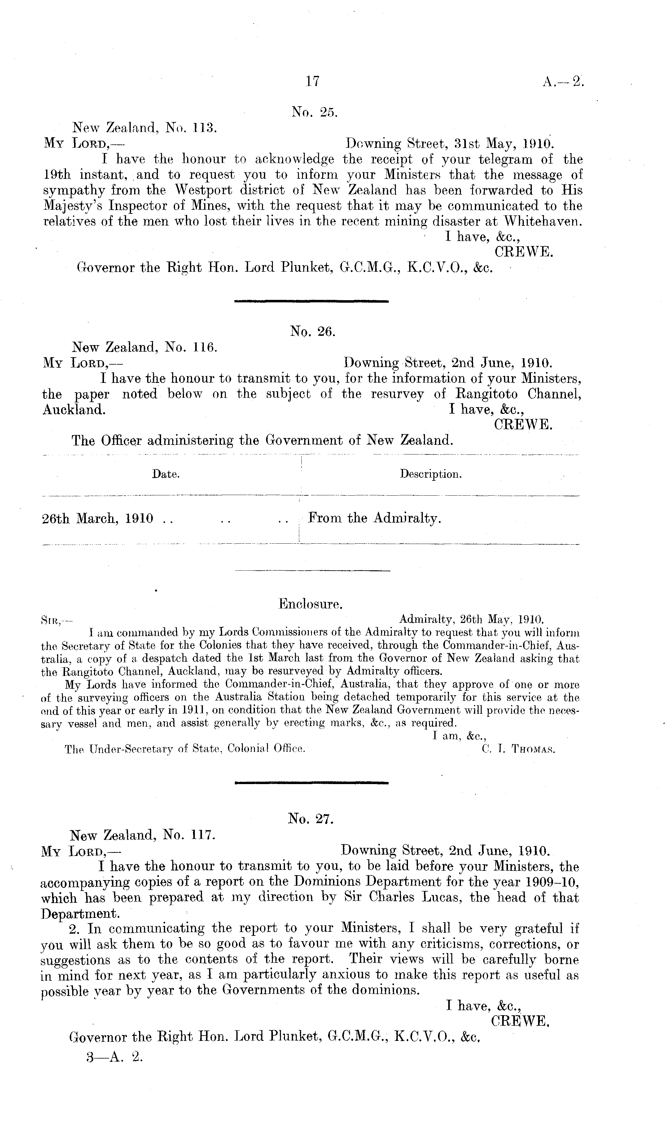 Enclosure. Sμ:. Admiralty, 26th May, 1910. I am commanded by my Lords Commissioners of the Admiralty to request that you will inform the Secretary of State for the Colonies that they have received, through the Commander-in-Chief, Australia, a copy of a despatch dated the Ist March last from the Governor of New Zealand asking that the Rangitoto Channel, Auckland, may be resurveyed by Admiralty officers. My Lords have informed the Commander-in-Chief, Australia, that they approve of one or more, of the surveying officers on the Australia Station being detached temporarily for this service at the end of this year or early in 1911, on condition that the New Zealand Government will provide the necessary vessel and men, and assist generally by erecting marks, &c, as required. I am, &c, The Under-Secretary of State, Colonial Office. C. T. Thomas.