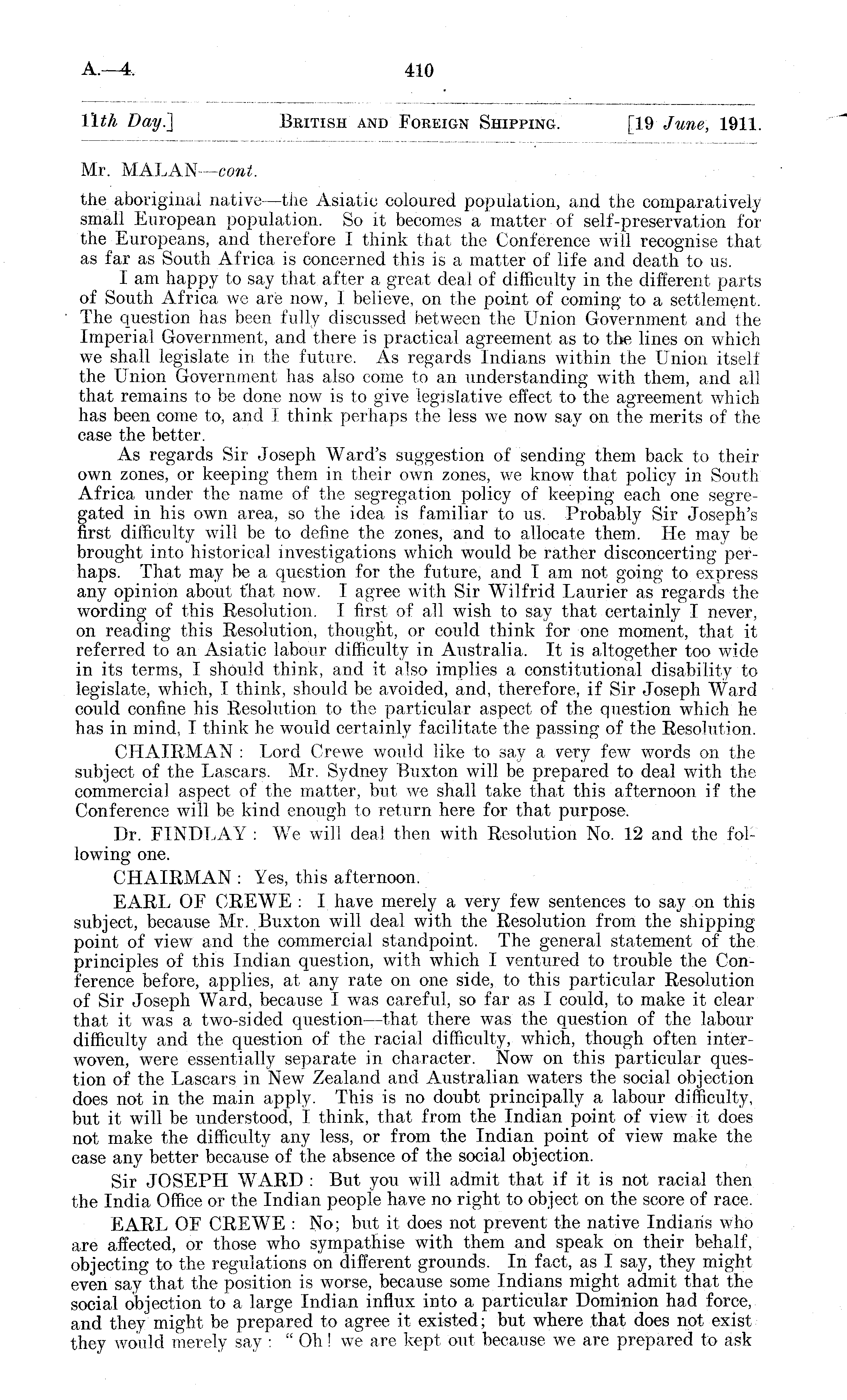 11th Day.] British and Foreign Shipping. [19 June, 1911. Mr. MALAN— eont. the aboriginal native —tiie Asiatic coloured population, and the comparatively small European population. So it becomes a matter of self-preservation for the Europeans, and therefore I think that the Conference will recognise that as far as South Africa is concerned this is a matter of life and death to us. I am happy to say that after a great deal of difficulty in the different parts of South Africa we are now, I believe, on the point of coming to a settlement. The question has been fully discussed between the Union Government and the Imperial Government, and there is practical agreement as to the lines on which we shall legislate in the future. As regards Indians within the Union itself the Union Government has also come to an understanding with them, and all that remains to be done now is to give legislative effect to the agreement which has been come to, and I think perhaps the less we now say on the merits of the case the better. As regards Sir Joseph Ward's suggestion of sending them back to their own zones, or keeping them in their own zones, we know that policy in South Africa under the name of the segregation policy of keeping each one segregated in his own area, so the idea is familiar to us. Probably Sir Joseph's first difficulty will be to define the zones, and to allocate them. He may be brought into historical investigations which would be rather disconcerting perhaps. That may be a question for the future, and I am not going to express any opinion about that now. I agree with Sir Wilfrid Laurier as regards the wording of this Resolution. I first of all wish to say that certainly I never, on reading this Resolution, thought, or could think for one moment, that it referred to an Asiatic labour difficulty in Australia. It is altogether too wide in its terms, I should think, and it also implies a constitutional disability to legislate, which, I think, should be avoided, and, therefore, if Sir Joseph Ward could confine his Resolution to the particular aspect of the question which he has in mind, I think he would certainly facilitate the passing of the Resolution. CHAIRMAN : Lord Crewe would like to say a very few words on the subject of the Lascars. Mr. Sydney Buxton will be prepared to deal with the commercial aspect of the matter, but we shall take that this afternoon if the Conference will be kind enough to return here for that purpose. Dr. FINDLAY : We will dea! then with Resolution No. 12 and the following one. CHAIRMAN : Yes, this afternoon. EARL OF CREWE : I have merely a very few sentences to say on this subject, because Mr. Buxton will deal with the Resolution from the shipping point of view and the commercial standpoint. The general statement of the principles of this Indian question, with which I ventured to trouble the Conference before, applies, at any rate on one side, to this particular Resolution of Sir Joseph Ward, because I was careful, so far as I could, to make it clear that it was a two-sided question —that there was the question of the labour difficulty and the question of the racial difficulty, which, though often interwoven, were essentially separate in character. Now on this particular question of the Lascars in New Zealand and Australian waters the social objection does not in the main apply. This is no doubt principally a labour difficulty, but it will be understood, I think, that from the Indian point of view it does not make the difficulty any less, or from the Indian point of view make the case any better because of the absence of the social objection. Sir JOSEPH WARD : But you will admit that if it is not racial then the India Office or the Indian people have no right to object on the score of race. EARL OF CREWE : No; but it does not prevent the native Indians who are affected, or those who sympathise with them and speak on their behalf, objecting to the regulations on different grounds. In fact, as I say, they might even say that the position is worse, because some Indians might admit that the social objection to a large Indian influx into a particular Dominion had force, and they might be prepared to agree it existed; but where that does not exist they would merely say : " Oh ! we are kept out because we are prepared to ask