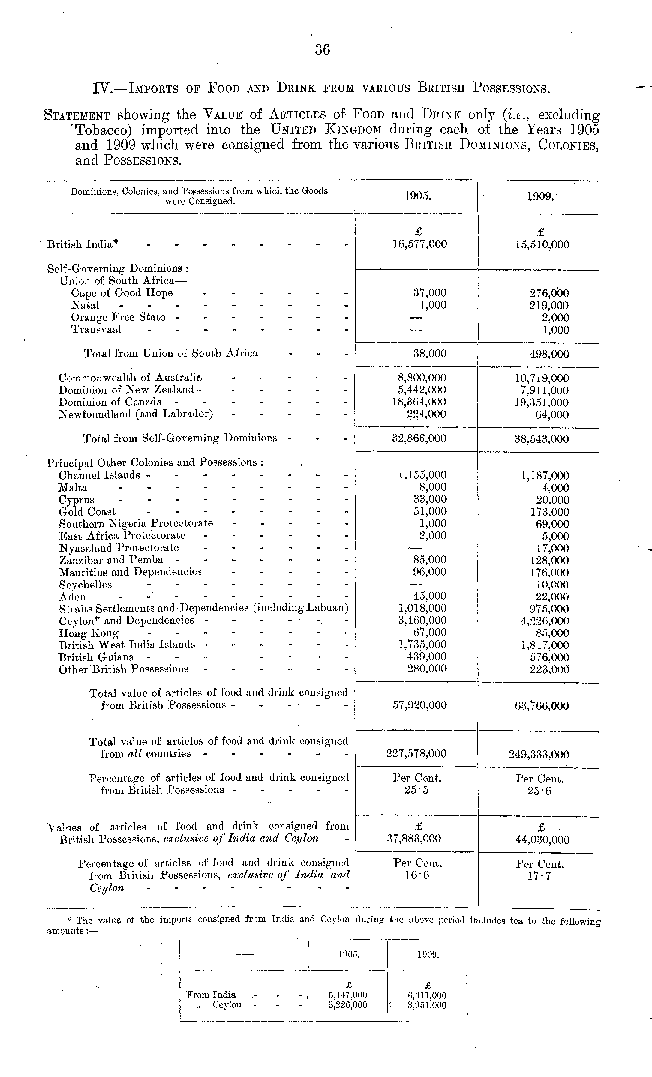 IV. —Imports of Food and Drink from various British Possessions. Statement showing the Value of Articles of Food and Drink only (i.e., excluding Tobacco) imported into the United Kingdom during each of the Years 1905 and 1909 which were consigned from the various British Dominions, Colonies, and Possessions.