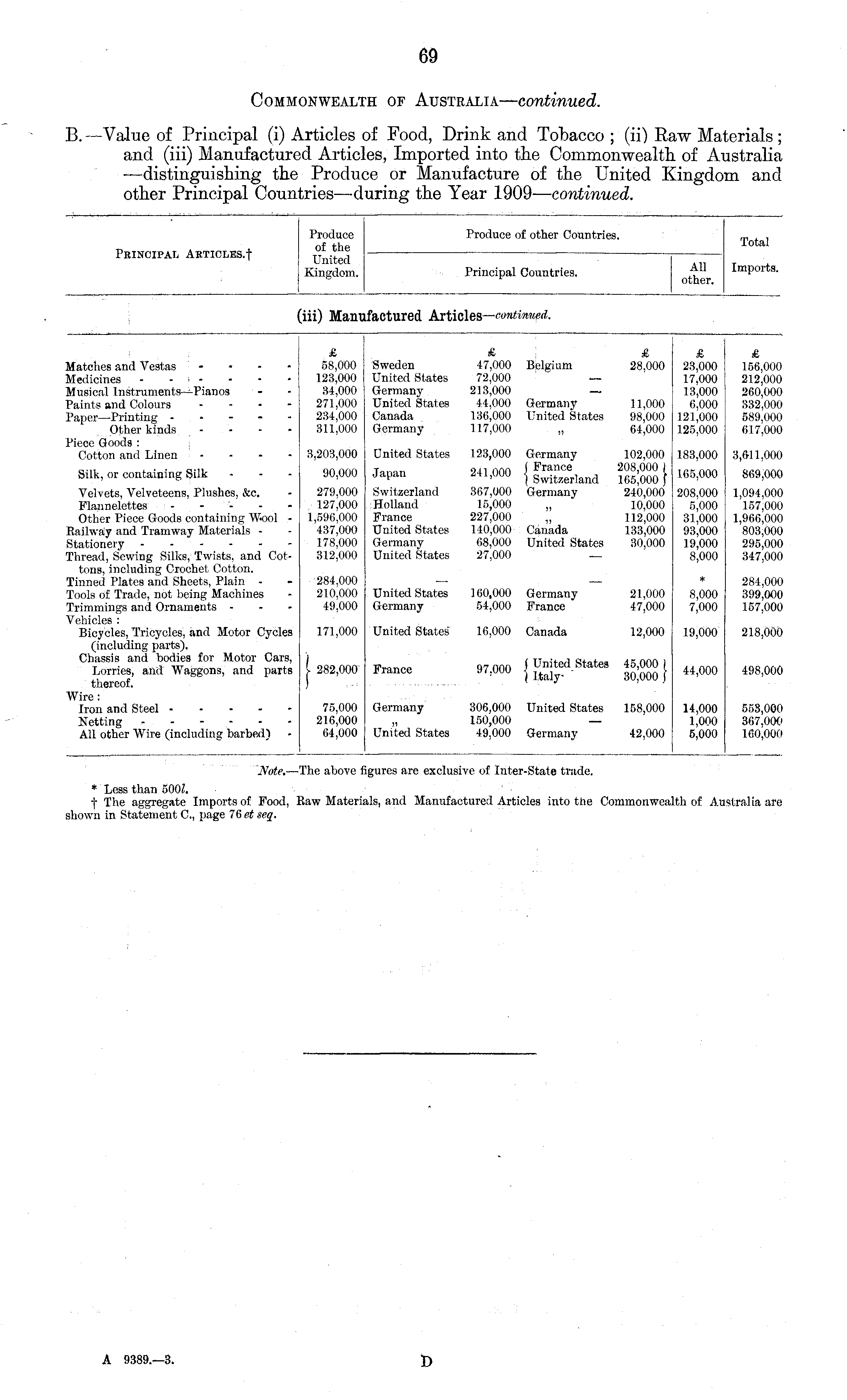 Commonwealth of Australia— continued. B.—Value of Principal (i) Articles of Food, Drink and Tobacco; (ii) Raw Materials; and (iii) Manufactured Articles, Imported into the Commonwealth of Australia —distinguishing the Produce or Manufacture of the United Kingdom and other Principal Countries—during the Year 1909 — continued.