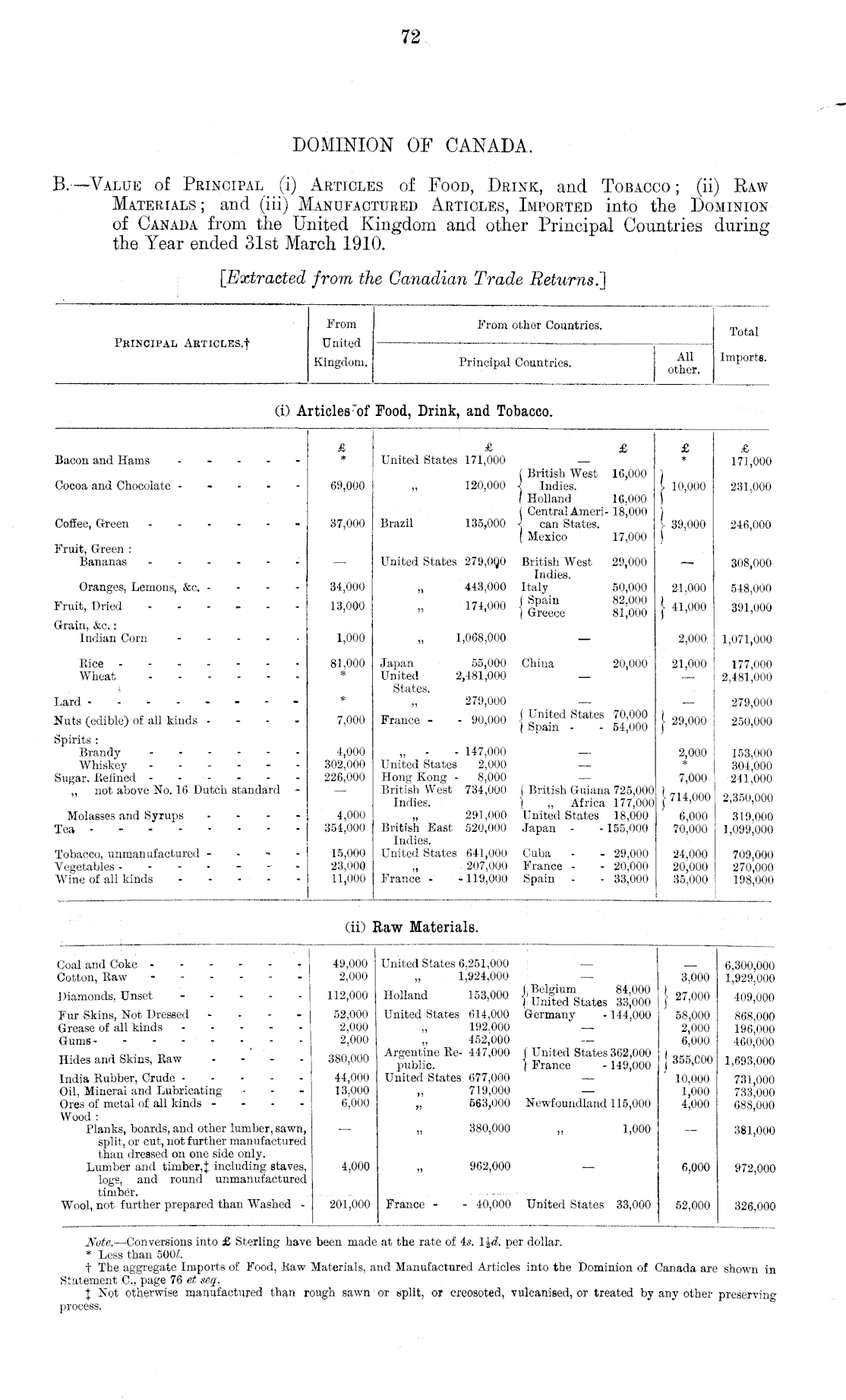 DOMINION OF CANADA. B.—Value of Principal (i) Articles of Food, Drink, and Tobacco; (ii) Raw Materials; and (iii) Manufactured Articles, Imported into the Dominion of Canada from the United Kingdom and other Principal Countries during the Year ended 31st March 1910.