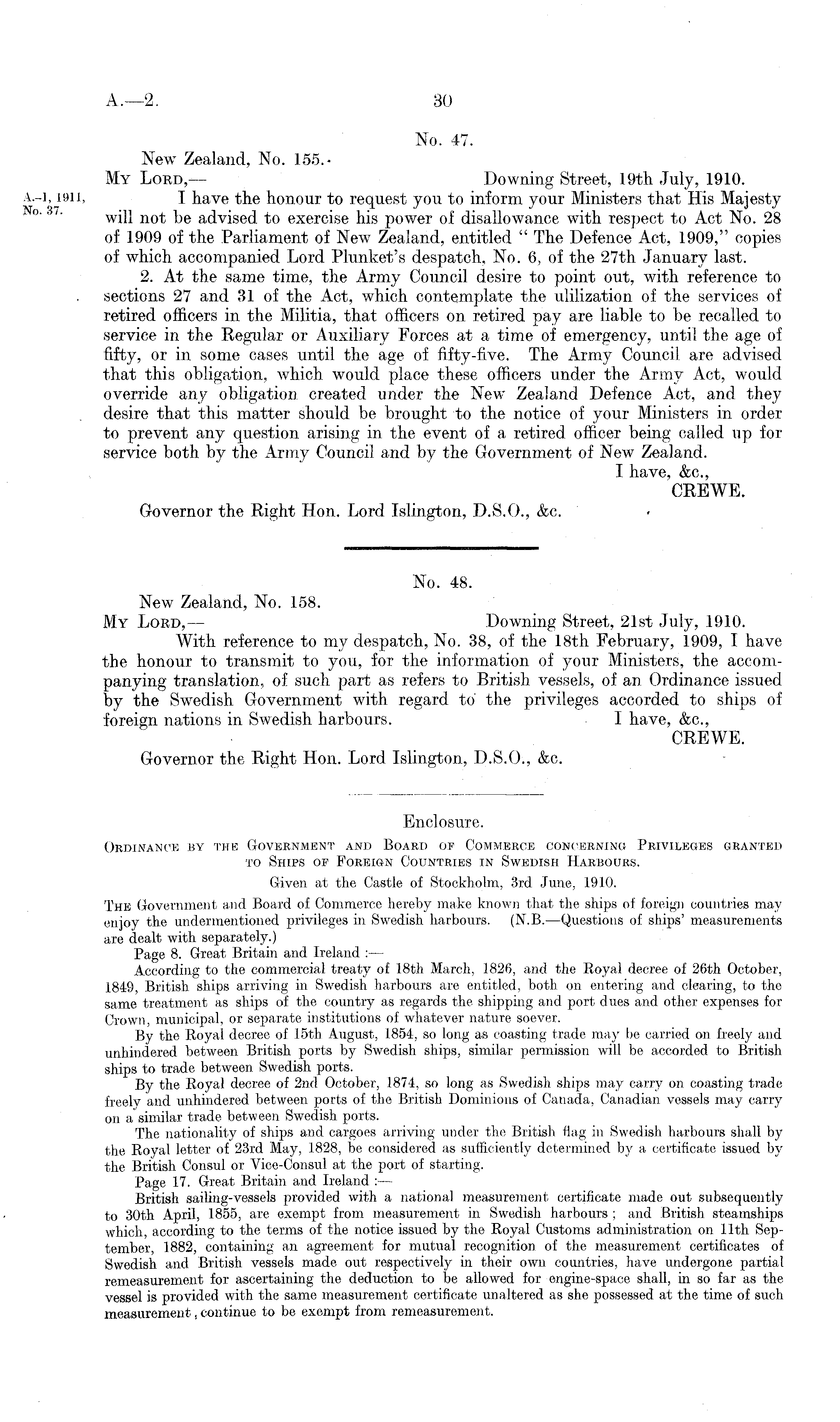 No. 48. New Zealand, No. 158. My Lord, — Downing Street, 21st July, 1910. With reference to my despatch, No. 38, of the 18th February, 1909, I have the honour to transmit to you, for the information of your Ministers, the accompanying translation, of such part as refers to British vessels, of an Ordinance issued by the Swedish Government with regard to the privileges accorded to ships of foreign nations in Swedish harbours. I have, &c, CREWE. Governor the Right Hon. Lord Islington, D.5.0., &c.