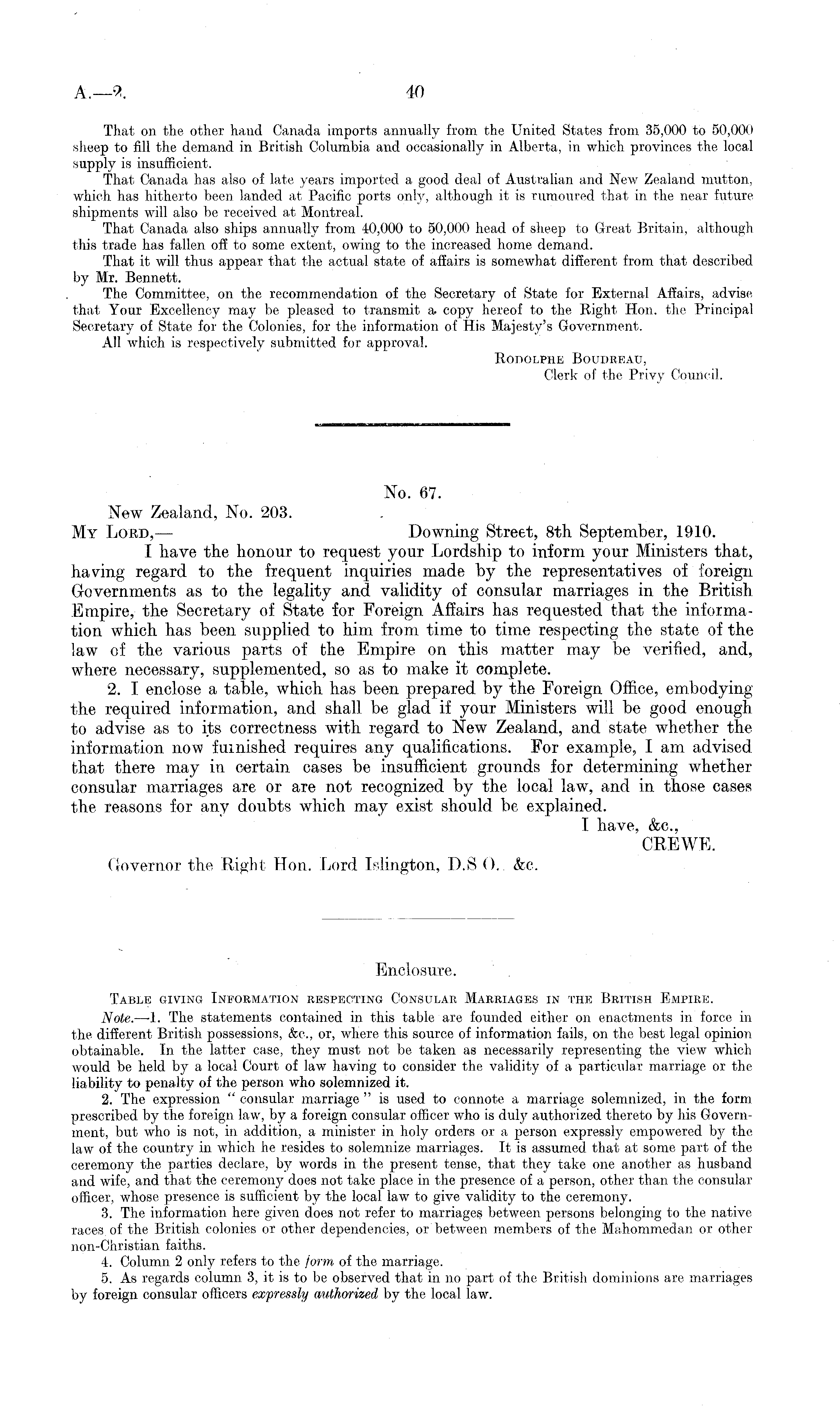 No. 67. New Zealand, No. 203. My Lord, — Downing Street, Bth September, 1910. I have the honour to request your Lordship to inform your Ministers that, having regard to the frequent inquiries made by the representatives of foreign Governments as to the legality and validity of consular marriages in the British Empire, the Secretary of State for Foreign Affairs has requested that the information which has been supplied to him from time to time respecting the state of the law of the various parts of the Empire on this matter may be verified, and, where necessary, supplemented, so as to make it complete. 2. I enclose a table, which has been prepared by the Foreign Office, embodying the required information, and shall be glad if your Ministers will be good enough to advise as to its correctness with regard to New Zealand, and state whether the information now furnished requires any qualifications. For example, lam advised that there may in certain cases be insufficient grounds for determining whether consular marriages are or are not recognized by the local law, and in those cases the reasons for any doubts which may exist should be explained. I have, &c, CREW PI Governor the Right Hon. Lord Islington, D.S ().. &c. Enclosure. Table giving Information respecting Consular Marriages in the British Empire. Note. —1. The statements contained in this table are founded either on enactments in force in the different British possessions, &c, or, where this source of information fails, on the best legal opinion obtainable. In the latter case, they must not be taken as necessarily representing the view which would be held by a local Court of law having to consider the validity of a particiilar marriage or the liability to penalty of the person who solemnized it. 2. The expression " consular marriage " is used to connote a marriage solemnized, in the form prescribed by the foreign law, by a foreign consular officer who is duly authorized thereto by his Government, but who is not, in addition, a minister in holy orders or a person expressly empowered by the law of the country in which he resides to solemnize marriages. It is assumed that at some part of the ceremony the parties declare, by words in the present tense, that they take one another as husband and wife, and that the ceremony does not take place in the presence of a person, other than the consular officer, whose presence is sufficient by the local law to give validity to the ceremony. 3. The information here given does not refer to marriages between persons belonging to the native races of the British colonies or other dependencies, or between members of the Mahommedan or other non-Christian faiths. 4. Column 2 only refers to the form of the marriage. 5. As regards column 3, it is to be observed that in no part of the British dominions are marriages by foreign consular officers expressly authorized by the local law.