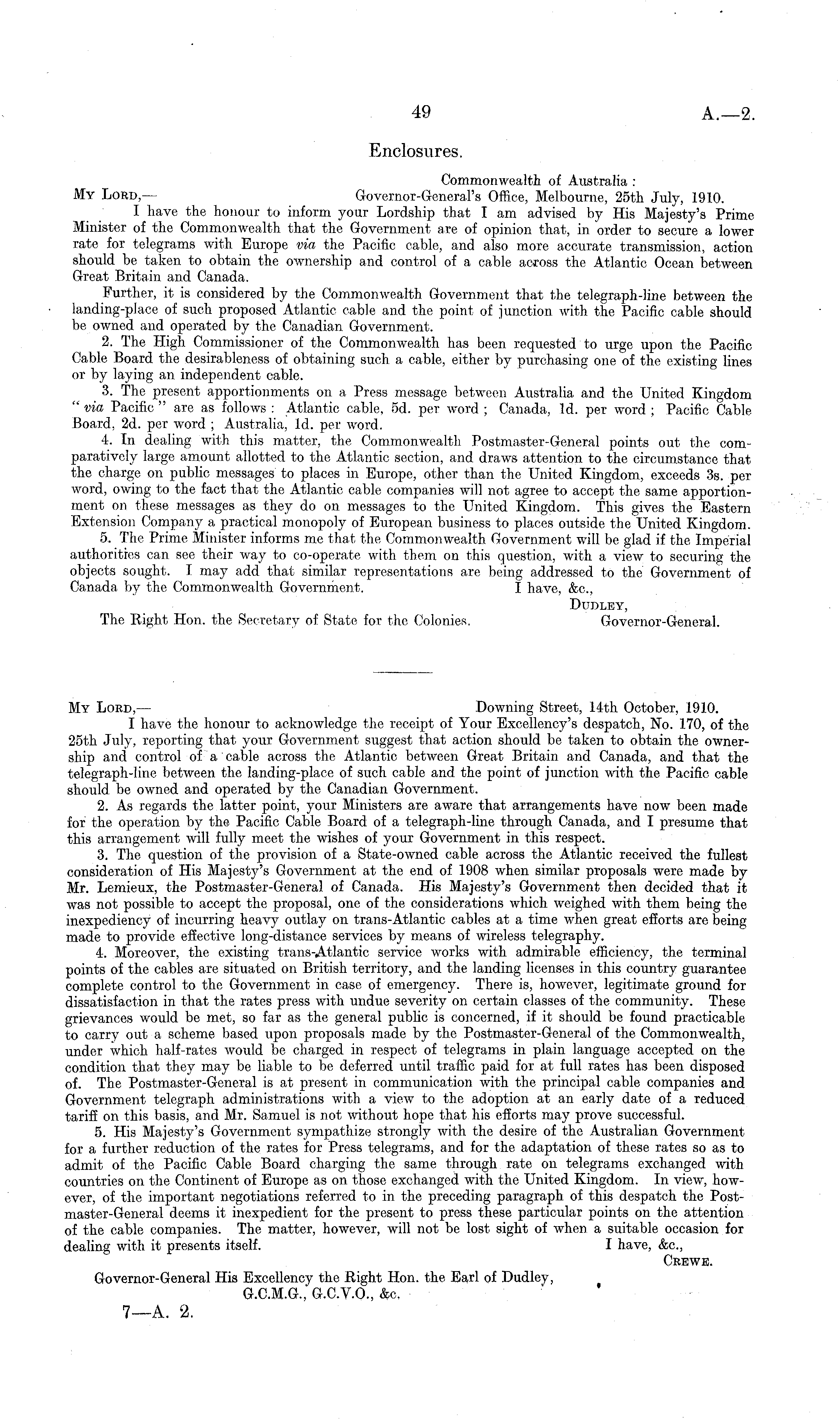 Enclosures. Commonwealth of Australia : My Lord,— Governor-General's Office, Melbourne, 25th July, 1910. I have the honour to inform your Lordship that I am advised by His Majesty's Prime Minister of the Commonwealth that the Government are of opinion that, in order to secure a lower rate for telegrams with Europe via the Pacific cable, and also more accurate transmission, action should be taken to obtain the ownership and control of a cable across the Atlantic Ocean between Great Britain and Canada. Further, it is considered by the Commonwealth Government that the telegraph-line between the landing-place of such proposed Atlantic cable and the point of junction with the Pacific cable should be owned and operated by the Canadian Government. 2. The High Commissioner of the Commonwealth has been requested to urge upon the Pacific Cable Board the desirableness of obtaining such a cable, either by purchasing one of the existing lines or by laying an independent cable. 3. The present apportionments on a Press message between Australia and the United Kingdom " via Pacific " are as follows : Atlantic cable, sd. per word ; Canada, Id. per word ; Pacific Cable Board, 2d. per word ; Australia, Id. per word. 4. In dealing with this matter, the Commonwealth Postmaster-General points out the comparatively large amount allotted to the Atlantic section, and draws attention to the circumstance that the charge on public messages to places in Europe, other than the United Kingdom, exceeds 3s. per word, owing to the fact that the Atlantic cable companies will not agree to accept the same apportionment on these messages as they do on messages to the United Kingdom. This gives the Eastern Extension Company a practical monopoly of European business to places outside the United Kingdom. 5. The Prime Minister informs me that the Commonwealth Government will be glad if the Imperial authorities can see their way to co-operate with them on this question, with a view to securing the objects sought. I may add that similar representations are being addressed to the Government of Canada by the Commonwealth Government. I have, &c, Dudley, The Right Hon. the Secretary of State for the Colonies. Governor-General. My Lord, — Downing Street, 14th October, 1910. I have the honour to acknowledge the receipt of Your Excellency's despatch, No. 170, of the 25th July, reporting that your Government suggest that action should be taken to obtain the ownership and control of a' cable across the Atlantic between Great Britain and Canada, and that the telegraph-line between the landing-place of such cable and the point of junction with the Pacific cable should be owned and operated by the Canadian Government. 2. As regards the latter point, your Ministers are aware that arrangements have now been made for the operation by the Pacific Cable Board of a telegraph-line through Canada, and I presume that this arrangement will fully meet the wishes of your Government in this respect. 3. The question of the provision of a State-owned cable across the Atlantic received the fullest consideration of His Majesty's Government at the end of 1908 when similar proposals were made by Mr. Lemieux, the Postmaster-General of Canada. His Majesty's Government then decided that it was not possible to accept the proposal, one of the considerations which weighed with them being the inexpediency of incurring heavy outlay on trans-Atlantic cables at a time when great efforts are being made to provide effective long-distance services by means of wireless telegraphy. 4. Moreover, the existing trans-Atlantic service works with admirable efficiency, the terminal points of the cables are situated on British territory, and the landing licenses in this country guarantee complete control to the Government in case of emergency. There is, however, legitimate ground for dissatisfaction in that the rates press with undue severity on certain classes of the community. These grievances would be met, so far as the general public is concerned, if it should be found practicable to carry out a scheme based upon proposals made by the Postmaster-General of the Commonwealth, under which half-rates would be charged in respect of telegrams in plain language accepted on the condition that they may be liable to be deferred until traffic paid for at full rates has been disposed of. The Postmaster-General is at present in communication with the principal cable companies and Government telegraph administrations with a view to the adoption at an early date of a reduced tariff on this basis, and Mr. Samuel is not without hope that his efforts may prove successful. 5. His Majesty's Government sympathize strongly with the desire of the Australian Government for a further reduction of the rates for Press telegrams, and for the adaptation of these rates so as to admit of the Pacific Cable Board charging the same through rate on telegrams exchanged with countries on the Continent of Europe as on those exchanged with the United Kingdom. In view, however, of the important negotiations referred to in the preceding paragraph of this despatch the Post-master-General deems it inexpedient for the present to press these particular points on the attention of the cable companies. The matter, however, will not be lost sight of when a suitable occasion for dealing with it presents itself. I have, &c, Crewe. Governor-General His Excellency the Right Hon. the Earl of Dudley, G.C.M.G.,' G.C.V.0., &c.