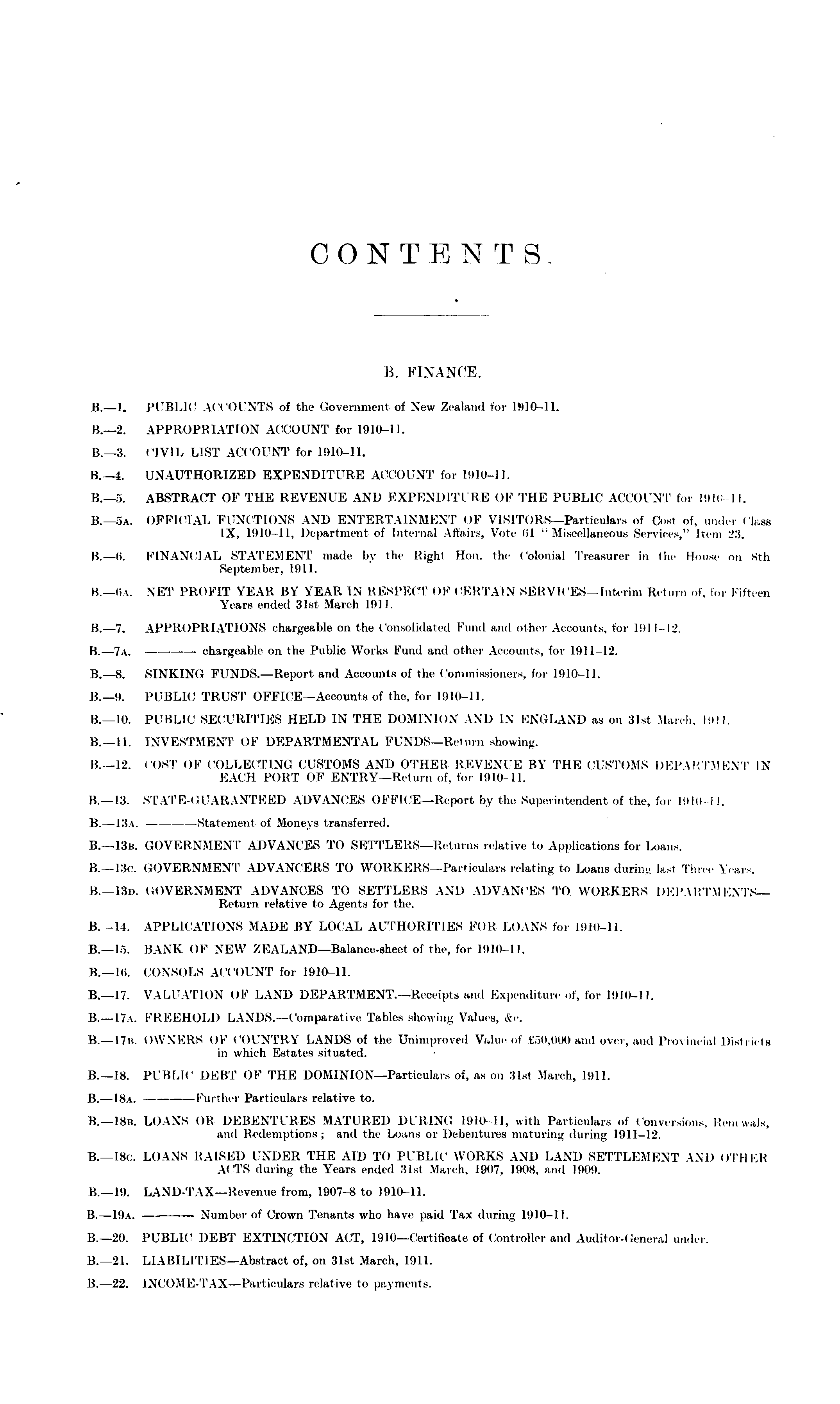 CONTENTS. B. FINANCE. B.—l. PUBLIC ACCOUNTS of the Government of New Zealand for 1910-11. 8.—2. APPROPRIATION ACCOUNT for 1910-11. 8.—3. CIVIL LIST ACCOUNT for 1910-11. B.—t. UNAUTHORIZED EXPENDITURE ACCOUNT for 1910-11. 8.—5. ABSTRACT OF THE REVENUE AND EXPENDITI RE OF THE PUBLIC ACCOUNT for 191( 1 I. B.—6a. OFFICIAL FUNCTIONS AND ENTERTAINMENT OF VlSlTORS—Particulars of Cost of, under Llasa IX, 1910-11, Department of Internal Affairs, Vote (il " Miscellaneous Services," Item 23. B.—l>. FINANCIAL STATEMENT made by the Right Hon. the Colonial Treasurer in the House en sth September, 1911. B.—liA. NET PROFIT YKAK BY YEAB IX RESPECT OF CERTAIN SERVICES—Interim Return of, for Fifteen Years ended ISlst March 1911. B.— 7. APPROPRIATIONS chargeable on the Consolidated Fund and oilier Accounts, for Mil i 12. B.—7a. chargeable on the Public Works Fund and other Accounts, fur 11)11-12. B._B. SINKING FUNDS.—Report and Accounts of the Commissioners, tor I!)1<M 1. 8.—9. PUBLIC TRUST OFFlCE—Accounts of the, for 1910-11. B.—lo. PUBLIC SECURITIES HELD IN THE DOMINION' AND IN ENGLAND as on Hist March, 1911. B.—ll. INVESTMENT OF DEPARTMENTAL FUNDS—Return showing. 8.—12. COST OF COLLECTING CUSTOMS AND OTHER REVENUE BY THE CUSTOMS DEPARTMENT IN EACH I'ORT ()F ENTRY—Return of, for 1010-11. 8.—13. STATE-GUARANTEED ADVANCES OFFICE—Report by the Superintendent of the, for lit In i !. 8.—13 a. Statement of Moneys transferred. 8.—13b. GOVERNMENT ADVANCES TO SETTLERS—Returns relative to Applications for Loans. 8.—13 c. GOVERNMENT ADVANCERS TO WORKERS—Particulars relating to Loans during last Three Yeai 15.—13 d. GOVERNMENT ADVANCES TO SETTLERS AND ADVANCES TO WORKERS DEPARTMENTS— Return relative to Agents for the. 8.—14. APPLICATIONS HADE BY LOCAL AUTHORITIES FOB LOANS tor 1910-11. 8.—15. BANK OF NEW ZEALAND—Balance-sheet of the, for 1910-11. B._Hi. CONSOLS ACCOUNT for 1910-11. 8.—17. VALUATION OF LAND DEPARTMENT.—Receipts and Expenditure of, for 1910-11. B.— 17a. FREEHOLD LANDS.—Comparative Tables showing Values, &c. 8.—17b. OWNERS OF COUNTRY LANDS of the Unimproved Value of £60,000 and over, and Provincial Districts in which Estates situated. B._lB. PUBLIC DEBT OK THE DOMlNlON—Particulars of, as on 31st March, 1911. B. —18a. Further Particulars relative to. B.—lBb. LOAN'S OR DEBENTURES MATURED DURING 1910-11, with Particulars of Conversions, Renewals, and Redemptions; and the Loans or Debentures maturing during 1911-12. B.—lBc. LOANS RAISED UNDER THE AID TO PUBLIC WORKS AND LAND SETTLEMENT AND OTHEB ACTS during the Years ended 31st March, 1907, 1908, and 1909. 8.—19. LAND TAX—Revenue from, 1907-8 to 1910-11. 8.—19 a. Number of Crown Tenants who have paid Ta.\ during 1910—11. 8.—20. PUBLIC DEBT EXTINCTION ACT, 1910—Certificate of Controller and Auditor-Genera] under. 8.—21. LIABILITIES—Abstract of, on 31st March, 1911. 8.—22. INCOME-TAX—Particulars relative to payments.