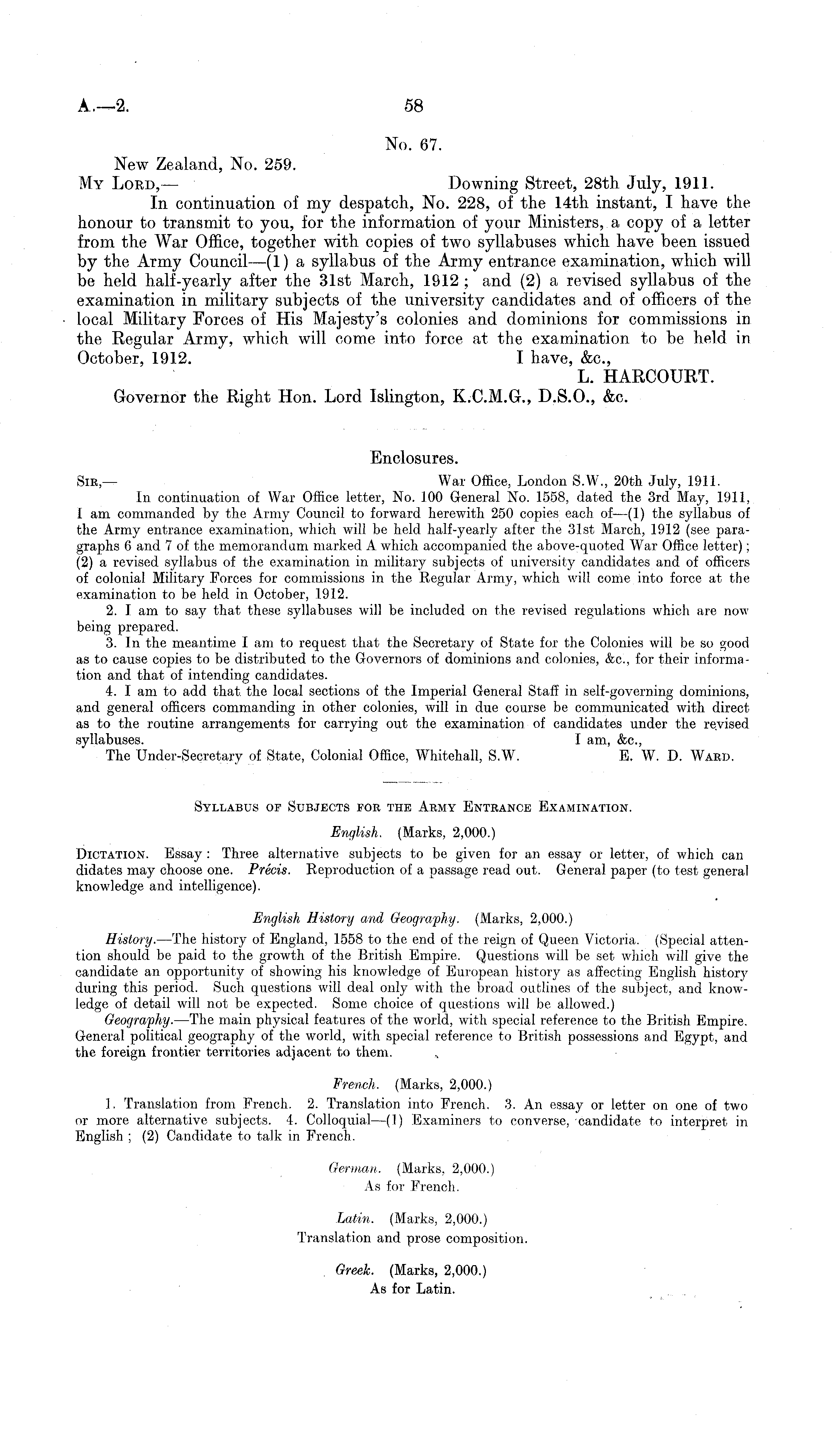 No. 67. New Zealand, No. 259. My Lord,— Downing Street, 28th July, 1911. In continuation of my despatch, No. 228, of the 14th instant, I have the honour to transmit to you, for the information of your Ministers, a copy of a letter from the War Office, together with copies of two syllabuses which have been issued by the Army Council—(l) a syllabus of the Army entrance examination, which will be held half-yearly after the 31st March, 1912 ; and (2) a revised syllabus of the examination in military subjects of the university candidates and of officers of the local Military Forces of His Majesty's colonies and dominions for commissions in the Regular Army, which will come into force at the examination to be held in October, 1912. I have, &c, L. HARCOURT. Governor the Right Hon. Lord Islington, K.C.M.G., D.5.0., &c. Enclosures. Sir— War Office, London S.W., 20th July, 1911. In continuation of War Office letter, No. 100 General No. 1558, dated the 3rd May, 1911, I am commanded by the Army Council to forward herewith 250 copies each of—(1) the syllabus of the Army entrance examination, which will be held half-yearly after the 31st March, 1912 (see paragraphs 6 and 7 of the memorandum marked A which accompanied the above-quoted War Office letter); (2) a revised syllabus of the examination in military subjects of university candidates and of officers of colonial Military Forces for commissions in the Regular Army, which will come into force at the examination to be held in October, 1912. 2. I am to say that these syllabuses will be included on the revised regulations which are now being prepared. 3. In the meantime I am to request that the Secretary of State for the Colonies will be so good as to cause copies to be distributed to the Governors of dominions and colonies, &c, for their information and that of intending candidates. 4. I am to add that, the local sections of the Imperial General Staff in self-governing dominions, and general officers commanding in other colonies, will in due course be communicated with direct as to the routine arrangements for carrying out the examination of candidates under the revised syllabuses. I am, &c, The Under-Secretary of State, Colonial Office, Whitehall, S.W. E. W. D. Ward.