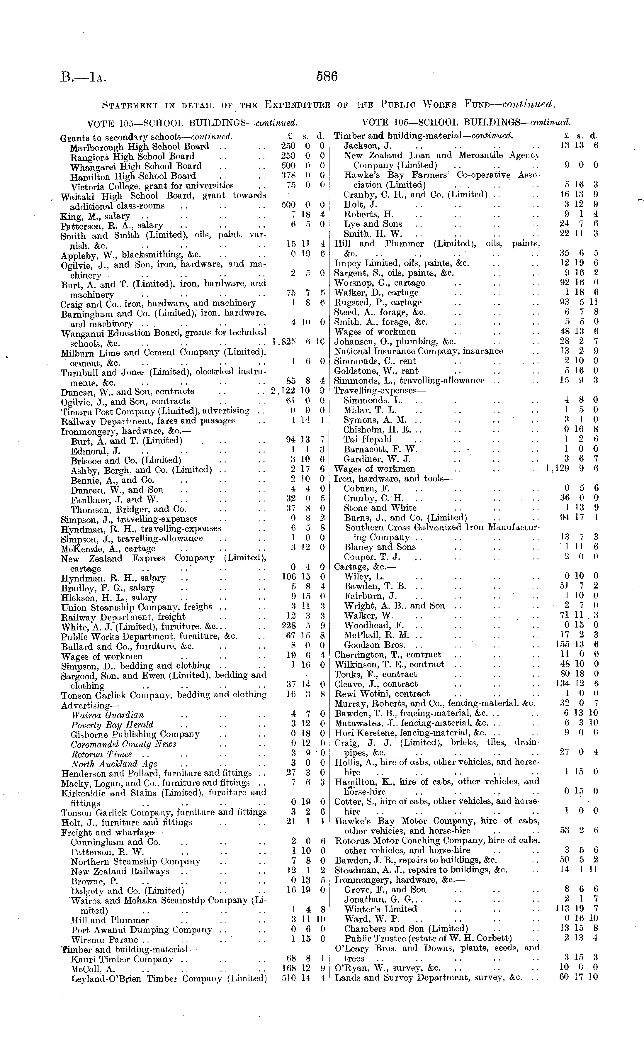 Statement in detail op the Expenditure of the Public Works Fund— continued. VOTE ] 05—SCHOOL BUlLDlNGS— continued. VOTE 105—SCHOOL BUILDINGS— continued. Grants to secondary schools— continued. £ s. d. ! Timber and building-material— continued. £ 8. d. Marlborough High School Board .. .. 250 0 0 Jackson, J. .. .. .. .. 13 13 6 Rangiora High School Board .. . . 250 0 0 New Zealand Loan and Mercantile Agency Whangarei High School Board .. .. 500 0 0 Company (Limited) . . .. . . 90 (I Hamilton High School Board .. .. 378 0 Oj Hawke's Bay Farmers' Co-operative AssoVictoria College, grant for universities .. 75 0 0 ciation (Limited) .. .. .. 5 16 3 Waitaki High School Board, grant towards Cranby, C. H., and Co. (Limited) .. . . 46 13 9 additional class-rooms . . .. .. 500 0 0 ; Holt, J. .. . . .. .. 312 9 King, M., salary .. .. •■ •• 7184 Roberts, H. .. . . .. .. 9 14 Patterson, R. A., salary .. .. .. 6 5 0 Lye and Sons .. .. .. .. 24 7 (i Smith and Smith (Limited), oils, paint, var- Smith, H. W. .. .. .. .. 22 11 3 nish, &c. . • • • • • • • 15 114 Hill and Plummer (Limited), oils, paints, Appleby, W., blacksmithing, &c. .... 0 19 6 &c. . . .. . . .. . . 35 6 5 Ogilvie, J., and Son, iron, hardware, and ma- Impey Limited, oils, paints, &c. .. .. 12 19 6 chine'ry ■ • ■ • • • ■ • 2 5 0 Sargent, S., oils, paints, &c. . . . . 916 2 Burt, A. and T. (Limited), iron, hardware, and Worsnop, G., cartage .. .. . . 92 16 0 machinery .••■ • ■ • • 75 7 5 Walker, D., cartage .. .. . . 118 6 Craig and Co., iron, hardware, and machinery I 8 6 Rugsted, P., cartage . . .. .. 93 511 Barningham and Co. (Limited), iron, hardware, Steed, A., forage, &c. . . .. .. 6 7 8 and machinery .. • • • • • • 410 0 Smith, A., forage, &c. .. .. .. 5 5 0 Wanganui Education Board, grants for technical Wages of workmen . . .. .. 48 13 6 schools, &c. .. .. •■ ■• 1,825 610 Johansen, 0., plumbing, &c. .. .. 28 2 7 Milburn Lime and Cement Company (Limited), National Insurance Company, insurance .. 13 2 9 ' cement, &c. .. .. ■ • • ■ L 6 0 Simmonds, C. rent .. .. .. 210 0 Turnbull and Jones (Limited), electrical instru- Goldstone, W., rent .. .. .. 5 16 0 ments, &c. .. ■. ■•• • 85 8 4 Simmonds, L., travelling-allowance .. .. 15 9 3 Duncan,'W., and Son, contracts .. .. 2,122 10 9 Travelling-expenses— Ogilvie, J., and Son, contracts .. .. 61 0 0 Simmonds, L. .. .. .. .. 4 8 0 Timaru Post Company (Limited), advertising .. 0 9 0 Millar, T. L. .. .. .. .. 15 0 Railway Department, fares and passages .. 114! Symons, A. M. .. ... .. .. 3 10 Ironmongery, hardware, &c— Chisholm, H. E. .. . . .. . . 016 8 Burt A and T. (Limited) . .. .. 94 13 7 Tai Hepahi .. .. .. .. 12 6 Edmond, J. .. ■ • ■ ■ • • 113 Barnacott, F. W. .. • .. . . 10 0 Briscoe and Co. (Limited) .. .. 310 6 Gardiner, W. J. .. .. .. 3 6 7 Ashby, Bergh, and Co. (Limited) .. .. 2 17 6 Wages of workmen .. .. .. 1.129 9 6 Bennie, A., and Co. .. .. .. 210 0 Iron, hardware, and tools — Duncan, W., and Son .. .. 4 4 0 Coburn, F. .. .. .. . . 0 5 6 Faulkner, J. and W. . . .. .. 32 0 5 Cranby, C. H. . . .. .. .. 36 0 0 Thomson, Bridger, and Co. .. .. 37 8 0 Stone and White . . . . . . 113 9 Simpson, J., travelling-expenses .. .. 08 2 Burns, J., and Co. (Limited) .. .. 94 17 1 Hyndman, R. H., travelling-expenses . . 6 5 8 Southern Cross Galvanized Iron ManufacturSimpson, J"., travelling-allowance .. .. 10 0 ing Company .. .. .. .. 13 7 3 McKenzie, A., cartage .. .. .. 312 0 Blaney and Sons .. .. .. 111 6 New Zealand Express Company (Limited), Couper, T. J. .. . . .. 2 0 0 cartage .. • • • • ■ • 0 4 0 Cartage, &c— Hyndman, R. H., salary .. .. .. 106 15 0 Wiley, L. .. .. .. .. 010 0 Bradley. F. G., salary ' .. .. • • 5 8 4 Bawden, T. B. .. .. .. .. 51 7 2 Hickson, H. L., salary .. .. .. 915 0 Fairburn, J. .. .. .. .. 110 0 Union Steamship Company, freight .. .. 311 3 Wright, A. 8., and Son .. .. ..270 Railway Department, freight .. .. 12 3 3 Walker, W. .. .. .. .. 71 11 3 White, A. J. (Limited), furniture, &c... .. 228 5 9 Woodhead, F. .. . . . . .. 015 0 Public Works Department, furniture, &c. .. 67 15 8 McPhail, R. M. .. .. .. .. 17 2 3 Bullard and Co., furniture, &c. .. .. 8 0 0 Goodson Bros. .. .. ■ .. .. 155 13 6 Wages of workmen .. .. .. 19 6 4 Cherrington, T., contract .. .. .. 11 0 0 Simpson, D., bedding and clothing .. . . 116 0 Wilkinson, T. E., contract .. . . .. 48 10 0 Sargood, Son, and Ewen (Limited), bedding and Tonks, F., contract . . .. .. 80 18 0 clothing .. •• ■• •■ 37 14 0 Cleave, J., contract .. .. .. 134 12 6 Tonson Garlick Company, bedding and clothing Hi 3 8 Rewi Wetini, contract .. .. .. 10 0 Advertising Murray, Roberts, and Co., fencing-material, &c. 32 0 7 Wairoa Guardian .. .. .. 4 7 0 Bawden, T. 8., fencing-material, &c. .. .. 6 13 10 Poverty Bay Herald ■ . ■. 312 0 Matawatea, J., fencing-material, &c. . ... 6 310 Gisborne Publishing Company .. .. 018 0 Hori Keretene, fencing-material, &o. .. .. 9 0 0 Coromandel County News .. . ■ 012 0 Craig, J. J. (Limited), bricks, tiles, drainRotorua Times .. ■ ■ ■ ■ ■ ■ 390 pipes, &c. . . .. .. . . 27 0 4 North Auckland Age .. . . .. 3 0 0 Hollis, A., hire of cabs, other vehicles, and horseHenderson and Pollard, furniture and fittings .. 27 3 0 hire .. .. .. . . . . 115 0 Macky, Logan, and Co., furniture and fittings .. 7 6 3 Hamilton, IC, hire of cabs, other vehicles, and Kirkcaldie and Stains (Limited), furniture and horse-hire .. .. .. .. 015 0 fittings .. .. .. . • 019 0 Cotter, S., hire of cabs, other vehicles, and horseTonson Garlick Company, furniture and fittings 3 2 6 hire .. .. .. .. .. 10 0 Holt, J., furniture and fittings .. .. 21 1 1 Hawke's Bay Motor Company, hire of cabs, Freight and wharfage— other vehicles, and horse-hire .. . . 53 2 6 Cunningham and Co. .. .. .. 2 0 6 Rotorua Motor Coaching Company, hire of cabs, Patterson, R. W. .. ..