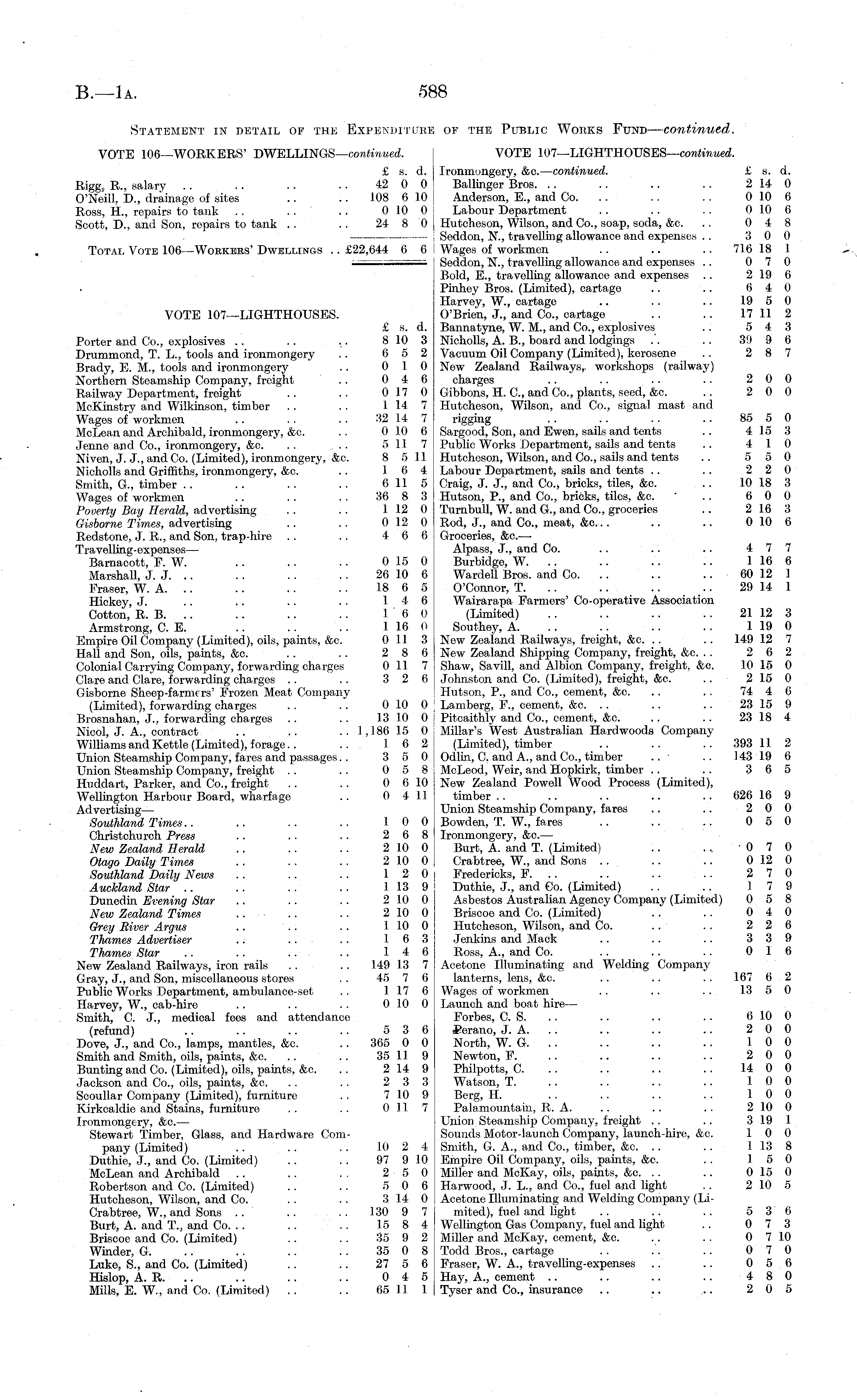Statement in detail of the Expenditure of the Public Works Fund— continued. VOTE 106—WORKERS' DWELLlNGS— continued. VOTE 107—LIGHTHOUSES— continued. £ a. d. Ironmongery, &c.— continued. £ s. d. Rigg, R., salary .. .. .. .. 42 0 0 Ballinger Bros. .. .. .. .. 214 0 O'Neill, D., drainage of sites .. .. 108 610 Anderson, E., and Co. . . .. 010 6 Ross, H., repairs to tank . . .. . . 010 0 Labour Department . . .. .. 010 6 Scott, D., and Son, repairs to tank . ... 24 8 0 | Hutoheson, Wilson, and Co., soap, soda, &c. 0 4 8 j Seddon, N., travelling allowance and expenses . . 3 0 0 Total Vote 106—Workers' Dwellings ..£22,644 6 6 I Wages of workmen .. .. .. 716 18 1 — j Seddon, N., travelling allowance and expenses .. 0 7 0 Bold, E., travelling allowance and expenses .. 2 19 6 Pinhey Bros. (Limited), cartage .. .. 6 4 0 Harvey, W., cartage .. .. .. 19 5 0 VOTE 107—LIGHTHOUSES. O'Brien, J., and Co., cartage .. .. 17 11 2 £ s. d. I Bannatyne, W. M., and Co., explosives .. 5 4 3 Porter and Co., explosives .. .. .. 810 3 j Nicholls, A. 8., board and lodgings .'. .. 39 9 6 Drummond, T. L., tools and ironmongery .. 6 5 2 | Vacuum Oil Company (Limited), kerosene .. 2 8 7 Brady, E. M., tools and ironmongery .. 0 10 New Zealand Railways,, workshops (railway) Northern Steamship Company, freight .. 0 4 6 j charges .. .. .. .. 200 Railway Department, freight .. .. 017 0 j Gibbons, H. C, and Co., plants, seed, &c. .. 2 0 0 McKinstry and Wilkinson, timber . . . . 1 14 7 Hutcheson, Wilson, and Co., signal mast and Wages of workmen .. . . .. 32 14 7 rigging .. .. .. .. 85 5 0 McLean and Archibald, ironmongery, &c. . . 010 6 Sargood, Son, and Ewen, sails and tents .. 415 3 Jenne and Co., ironmongery, &c. .. ... 511 7 Public Works Department, sails and tents .. 4 10 Niven, J. J., and Co. (Limited), ironmongery, &c. 8 511 Hutcheson, Wilson, and Co., sails and tents .. 5 5 0 Nicholls and Griffiths, ironmongery, &c. .. 16 4 Labour Department, sails and tents .. .. 2 2 0 Smith, G., timber .. .. .. .. 6115 Craig, J. J., and Co., bricks, tiles, &c. .. 10 18 3 Wages of workmen .. .. . . 36 8 3 Hutson, P., and Co., bricks, tiles, &c. .. 6 0 0 Poverty Bay Herald, advertising . . .. 112 0 Turnbull, W. and G., and Co., groceries .. 216 3 Gisborne Times, advertising .. .. 012 0 j Rod, J., and Co., meat, &c... .. .. 010 6 Redstone, J. R., and Son, trap-hire . . . . 4 6 6 Groceries, &c. —■ Travelling-expenses— Alpass, J., and Co. .. .. .. 4 7 7 Barnacott, F. W. .. .. .. 015 0 Burbidge, W. .. .. .. .. 116 6 Marshall, J. J. .. .. 26 10 6 Wardell Bros, and Co. .. .. .. 60 12 1 Fraser, W. A. .. .. .. .. 18 6 5 O'Connor, t. .. .. .. .. 29 14 1 Hickey, J. .. .. .. .. 14 6 Wairarapa Farmers' Co-operative Association Cotton, R. B. . . .. .. .. 1' 6 0 (Limited) .. .. .. .. 21 12 3 Armstrong, C. E. .. . . .. 116 0 Southey, A. .. .. .. .. 119 0 Empire Oil Company (Limited), oils, paints, &c. 011 3 New Zealand Railways, freight, &c. .. .. 149 12 7 Hall and Son, oils, paints, &c. .. .. 2 8 6 New Zealand Shipping Company, freight, &c. . . 2 6 2 Colonial Carrying Company, forwarding charges 0 11 7 Shaw, Savill, and Albion Company, freight, &c. 10 15 0 Clare and Clare, forwarding charges .. .. 3 2 6 Johnston and Co. (Limited), freight, &c. .. 215 0 Gisborne Sheep-farmers' Frozen Meat Company ! Hutson, P., and Co., cement, &c. .. .. 74 4 6 (Limited), forwarding charges .. .. 010 0 Lamberg, F., cement, &c. .. .. 23 15 9 Brosnahan, J., forwarding charges . . .. 13 10 0 Pitcaithly and Co., cement, &c. .. .. 23 18 4 Nicol, J. A., contract .. .. . . 1,186 15 0 Millar's West Australian Hardwoods Company Williams and Kettle (Limited), forage.. ... 16 2 (Limited), timber .. .. .. 393 11 2 Union Steamship Company, fares and passages.. 3 5 0 j Odlin, C. and A., and Co., timber .. ■ .. 143 19 6 Union Steamship Company, freight .. .. 05 8 ! McLeod, Weir, and Hopkirk, timber .. .. 36 5 Huddart, Parker, and Co., freight .. .. 0 6 10 New Zealand Powell Wood Process (Limited), Wellington Harbour Board, wharfage .. 0411 j timber .. .. .. .. .. 626 16 9 Advertising— : Union Steamship Company, fares .. .. 2 0 0 Southland Times.. .. .. .. 10 0 Bowden, T. W., fares .. .. .. 0 5 0 Christohurch Press .. .. .. 2 6 8 Ironmongery, &c.— New Zealand Herald .. .. .. 210 0 Burt, A. and T. (Limited) .. ~ 0 7 0 Otago Daily Times .. .. .. 210 0 Crabtree, W.. and Sons . ... .. 012 0 Southland Daily News .. .. .. 1 2 0 I Fredericks, F. .. .. .. .. 2 7 0 Auckland Star .. .. . . .. 113 9 | Duthie, J., and Co. (Limited) . . . . 17 9 Dunedin Evening Star .. .. .. 210 0 I Asbestos Australian Agency Company (Limited) 0 5 8 New Zealand Times .. - .. .. 210 0 Briscoe and Co. (Limited) . . .. 0 4 0 drey River Argus .. .. .. 110 0 Hutcheson, Wilson, and Co. .. . . 2 2 6 Thames Advertiser .. .. .. 1 6 3 j Jenkins and Mack .. .. .. 3 3 9 Thames Star .. .. .. .. 146j Ross, A., and Co. .. .. .. 0 16 New Zealand Railways, iron rails .. .. 149 13 7 Acetone Illuminating and Welding Company Gray, J., and Son, miscellaneous stores . . 45 7 6 lanterns, lens, &c. .. .. . . 167 6 2 Public Works Department, ambulance-set .. 117 6 Wages of workmen .. .. .. 13 5 0 Harvey, W., cab-hire .. .. .. 010 0 Launch and boat hire— Smith, C. J., medical fees and attendance Forbes, C. S. . . .. .. .. 6 10 0 (refund) .. .. . . .. 5 3 6 Perano, J. A. .. .. .. .. 2 0 0 Dove, J., and Co., lamps, mantles, &o. .. 365 0 0 North, W. G. .. .. .. .. 10 0 Smith and Smith, oils, paints, &c. . . .. 35 11 9 Newton, F. .. .. .. .. 2 0 0 Bunting and Co. (Limited), oils, paints, &c. .. 214 9 Philpotts, C. .. .. .. .. 14 0 0 Jackson and Co., oils, paints, &c. .. .. 2 3 3 Watson, T. .. .. .. .. 10 0 Scoullar Company (Limited), furniture . . 710 9 Berg, H. .. .. .. . . 10 0 Kirkcaldie and Stains, furniture .. .. 0 11 7 Palamountain, R. A. .. .. .. 2 10 0 Ironmongery, &c.— Union Steamship Company, freight . . .. 319 1 Stewart Timber, Glass, and Hardware Com- Sounds Motor-launch Company, launch-hire,