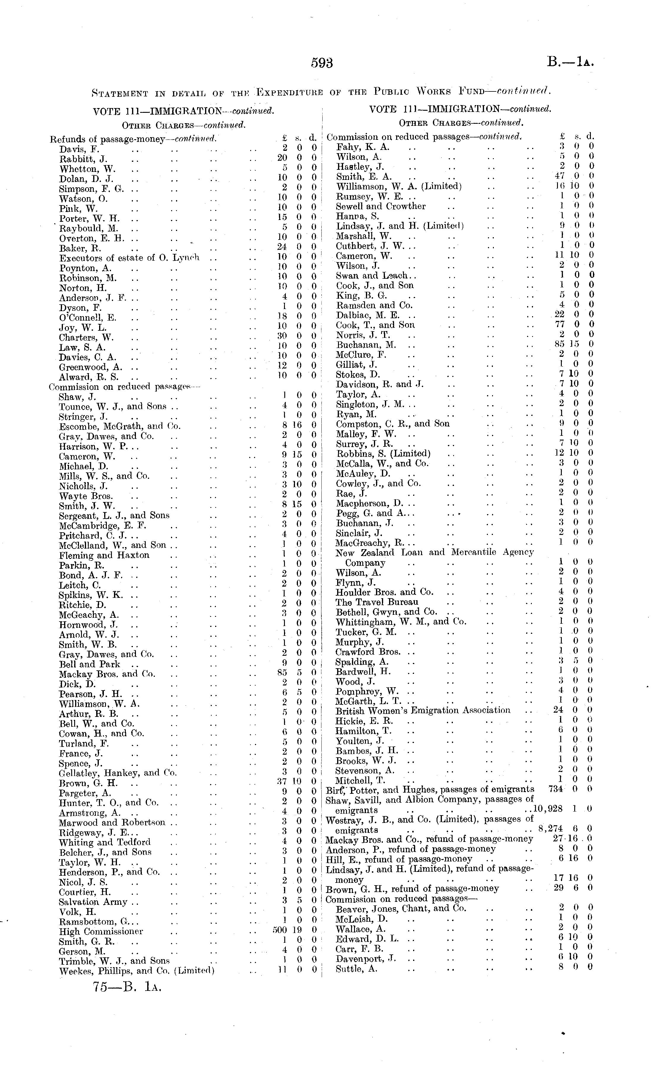 Statement in detain of the Expenditure of the Public Works Fund— continued. VOTE 111—IMMIGRATION— continued. VOTE 111—IMMIGRATION— continued. Other Chabges— continued. Othek Chaeges— continued. Refunds of passage-money— continued, £ s. d. : Commission on reduced passages— continued. £ s. d. Davis F ' .. .. •• 200: Fahy, K. A I! 0 0 Rabbitt, J. .. .. .. ■ ■ 20 0 0 Wilson, A. .. .. .. .. 5 0 0 Whetton, W. .. .. ■ ■ • • 5 0 0 i Hastley, J. .. .. .. .. 2 0 0 Dolan, D. J. .. .. •• •• 10 0 0 Smith, E. A. .. .. .. .. 47 0 0 Simpson F. G 20 0 Williamson, W. A. (Limited) .. .. 16 10 0 Watson,'O." .'. ■■ ■■ .. 10 0 0 Rumsey, W. E. .. .. .. .. I 0-0 Pink W .. .. •■ ■■ 10 0 0 Sewell and Crowther .. .. .. LOO Porter, W. H. '.'. '.'. .. ■■ 15 0 0 Hanna, S. .. .. .. .. 10 0 ' Raybould M .. •• •■ 5 0 0 Lindsay, J. and H. (Limited) .. .. 9 0 0 Overton EH . JO 0 0 Marshall, W. .. .. .. ..100 Baker, R. .. .. • • ■ ■ 24 0 0 Cuthbert, J. W. . . .. .. .. 10 0 Executors of estate of 0. Lynch .. ..10 0 0 Cameron, W. .. .. ■■ . ■ 11 10 0 Poynton, A ' .. ... 10 0 0 Wilson, J 20 0 Robinson, M. .. .. •• ■■ 10 0 0 Swan and Lsach. . .. .. .. 10 0 Norton H . .. . . 10 0 0 Cook, J., and Son .. .. .. 10 0 Anderson, J. V, .'. ■■ ■■ ■ ■ 4 0 0 King, B. G .. .. 5 0 0 Dyson F ..100: Ramsden and Co. . . . . .. 400 O'Connell, E. .. .. ■■ ■■ 18 0 0 Dalbiac, M. E. .. .. .. .. 22 0 0 Toy W L 10 0 0 Cook, T., and Son .. .. .. 77 0 0 Charters, W. '.'. '.'. .. .. 30 0 0 Norris, J. T 20 0 Law S A ■• •■ 10 0 0 Buchanan, M. .. .. .. .. 85 15 0 DaviesCA '..' '.'. '.'. ■■ 10 0 0 McClure, F. .. .. •■ •• 20 0 Greenwood, A 12 0 0 Gilliat, ,T. .. I 0 0 Alward, R, S 10 0 0 Stokes, D. 710 0 Commission on reduced passages— Davidson, R. and .1. . . . . .. 7 10 0 Shaw, J 10 0 Taylor, A +00 Tounce, W. J., and Sons .. .. .. 40 0: Singleton, J. M. . . .. .. .. 200 Stringer, J. .. .. .. ■ ■ 10 0, Ryan, M. .. .. .. • • 100 Escombe, McGrath, and Co. .. .. 816 0 Compston, C. R., and Son .. .. 0 0 0 Gray. Dawes, and Co. . . .. .. 2 0 0 Malley, F. W 10 0 Harrison, W. P. .. 4 0 0 Surrey, J. R ■• 7 0 0 Cameron W ■ • • ■ 915 0; Robbins, S. (Limited) .. .. .. 12100 Michael, D. . . .. • ■ 3 0 0; McCalla, W., and Co. .. .. .. 300 Mills, W. S., and Co. .. . . . . 30 0 McAuley, D. .. .. .. .. 10 0 Nicholls J . . . ■ ■ ■ 310 0 Cowley, J., and Co. .. . . .. 2 0 0 Wayte Bros 200j Rae, J. 2 0 0 Smith J W . ■ ■ ■ • 815 0 Macpherson, D. .. .. .. .. LOO Sergeant, L. J., and Sons .. .. 2 0 0; Pegg, G. and A... 2 0 0 McCambridge, E. F . . 3 0 0, Buchanan, J 3 0 0 Pritchard, C. J .. .. 4 0 0; Sinclair, J 2 0 McClelland, W., and Son ... . .. 1 .0 0 J MacGreachy, R. .. . . .. • • 1 0 0 Fleming and Haxton . .. i 0 0 New Zealand Loan and Mercantile Agency Parkin, R 10 0 : Company 10 0 Bond, A. J. F 2 0 0; Wilson, A 200 Leitch, C 20 0 Flynn, J. .. 0 Spikins W X .. .. .. . ■ 10 0 Houlder Bros, and Co. .. . . 40 0 Ritchie' D 2 0 0 The Travel Bureau .. .. .. 2 0 0 McGeachv,' A. '.'. '.'. '.'. ■■ 30 0 Bethell, Gwyn and Co. .. .. .. 20 0 Hornwood J .. .. 10 0 Whittingham, W. M., and Co. .. .. 10 0 Arnold, W. J 10 0 Tucker, G. M [ 0 0 Smith, W. B ■ 10 0 Murphy, J 0 0 Gray, Dawes, and Co. .. .. .. 20 0 ' Crawford Bros. .. . . .. .. 10 0 Bell" and Park .. .. .. ■• 9 0 0, Spalding, A. .. .. -. •• .i a ( Mackay Bros, and Co. . . .. .. 85 5 0 Bardwell, H. .. .. .. .. J 0 0 Dick D 2 0 0 Wood, J 3 0 0 Pearson, J. H 6 5 0 Pomphrey, W 4 0 0 Williamson, W. A 2 0 0, McGarth L. T .. . .. 10 Arthur R B 5 0 0! British Women's Emigration Association . . 24 0 0 Bell, W., and Co. .'.' . . . . I 0 0 i Hickie, E. R 10 (» Cowan, H., and Co. .. .. . . 6 0 0; Hamilton, T > 0 Turland, F 5 0 0: Youlten, J . 0 Franco J .. . . • • 2 0 0 Bambes, J. H. .. .. .. •. LOO Spence! J 2 0 0: Brooks, W. J 10 0 Gellatley, Hankey, and Co. . . . . 3 0 0; Stevenson, A. . . .. • ■ . • I 0 0 Brown G H . .. ■■ 37 10 0 Mitchell,! 10 0 Pargeter A ..900: Birtf, Potter, and Hughes, passages of emigrants 734 0 0 Hunter T. 0., and Co. .'.'. . . ■ ■ 2 0 0 j Shaw, Savill, and Albion Company, passages of Armstrong, A.' .. .. . .' . •' 4 0 0, emigrants ... •• •• ..10,928 1.0 Marwood and Robertson .. . . . . 3 0 0 Westray, J. 8., and Co. (Limited), passages of Bidgeway, J. B •• ■• 3 0 0 emigrants .. ... ■■ .. 8,2/4 j 0 Whiting and Tedford .. .. 4 0 0 Mackay Bros, and Co., refund of passage-money 27 16 . 0 Belcher, J., and Sons . . . . .-. 3 0 0 Anderson, P., refund of passage-money .. 8 0 0 Taylor W H ..100 Hill, E., refund of passage-money .. .. 6 16 0 Henderson' p' and Co . . .. 10 0 Lindsay, J. and H. (Limited), refund of passageNicol J S ..200 money •. ■ • • • ■ • 17 16 0 Courtier H .. ..100 Brown, G. H., refund of passage-money .. 29 6 0 Salvation Army '.'. '. 3 5 0: Commission on reduced passages— y o j k jj .10 0 Beaver, Jones, Chant, and Co. .. .. 2 0 0 Ramsbottom, G.'.i '.'. ■■ ■■ 10 0 MoLeish, D inn High Commissioner .. .. .. 500 19 0 Wallace, A. .. .. •• •• i 0 0 Smith, G. R 10 0 Edward, D. L 010 0 Gerson, M +00 Carr, F. B 100 Trimble, W. J., and Sons .. .. 10 0 Davenport, J. . . .. • ■ • • 010 U Weekes, Phillips, and Co. (Limited) ... 1! 0 0 Suttle, A. .. ■• •• •• SOU 75—8. lα.