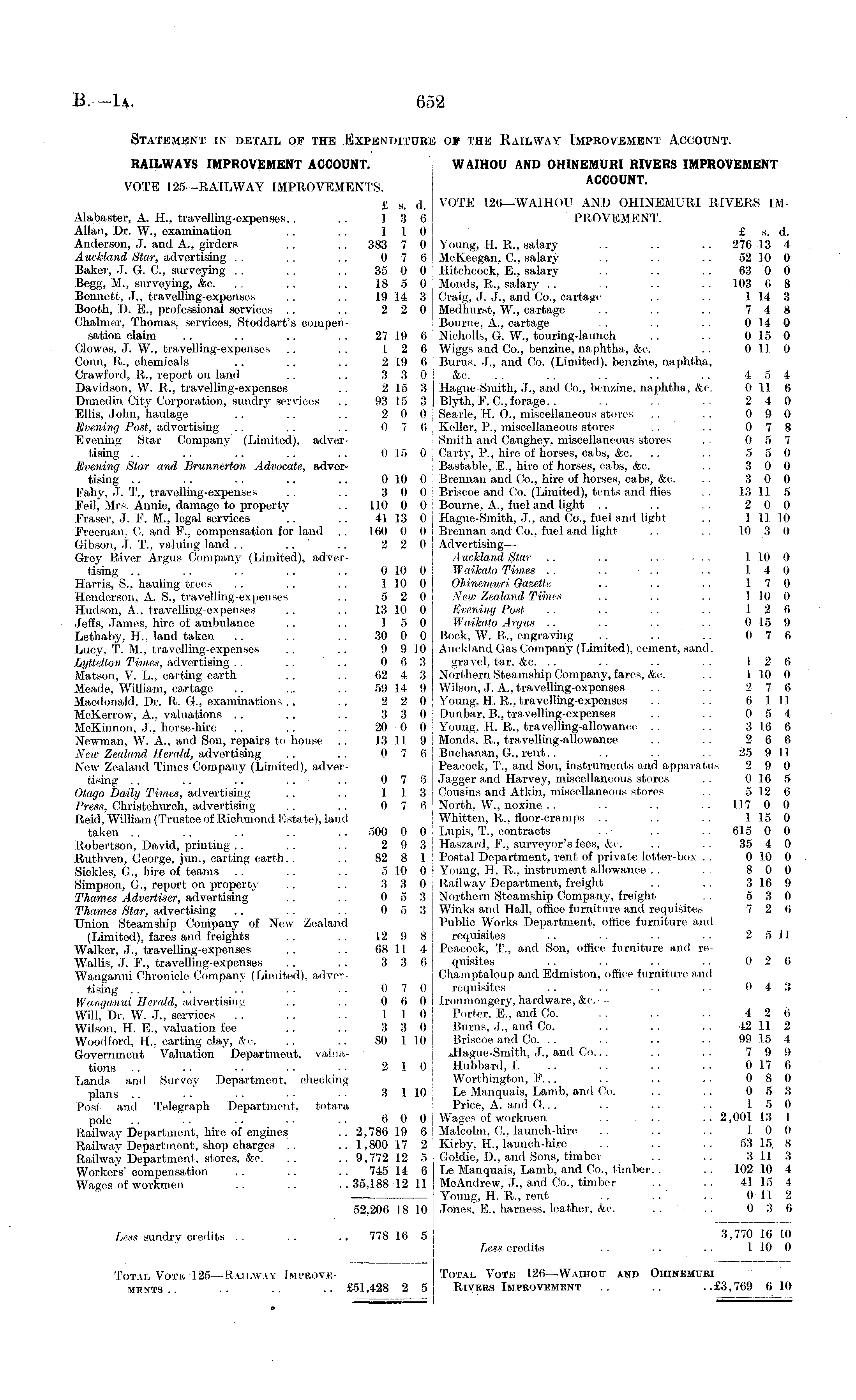 Statement in detail of the Expenditure of the Kailvvay Improvement Account. RAILWAYS IMPROVEMENT ACCOUNT. I WAIHOU AND OHINEMURI RIVERS IMPROVEMENT VOTE 125—RAILWAY IMPROVEMENTS. ACCOUNT. £ s. d. VOTE 120—WA1HOU AND OHINEMURI RIVERS TM Alabaster, A. H., travelling-expenses. . .. .13 6 PROVEMENT. Allan, Dr. W., examination .... 1 1 0 £ s. d. Anderson, J. and A., girders .. .. 383 7 0 Young, H. R., salary .. .. .. 276 13 4 Auckland Star, advertising . . .. .. 0 7 6 McKeegan, C, salary . . . . .. 52 10 0 BakeT-, J. G. 0., surveying . . .. .. 35 0 0 Hitchcock, E., salary . . .. .. 63 0 0 Begg, M., surveying, &c. .. .. .. 18 5 0 Monds, R., salary .'. .. .. 103 6 8 Bennett, J., travelling-expenses .. .. 19 14 3 Craig, J. J., and Co., cartage .. .. 1 14 3 Booth, I). E., professional services .. .. 2 2 0 Medhurst, W., cartage .. .. .. 7 4 8 Chalmer, Thomas, services, Stoddart's compen- Bourne, A., cartage .. .. .. 014 0 sation claim .. .. .. .. 27 19 (i Nioholls, G. W., touring-launch .. .. 015 0 Clowes. J. W., travelling-expenses .. .. 12 6 Wiggs and Co., benzine, naphtha, <fee. . . 011 0 Conn, R., chemicals .. .. .. 2 19 6 Burns. J., and Co. (Limited), benzine, naphtha, Crawford, R., report on land .. .. 3 3 0! &c. .. .. .. .. .. 454 Davidson, W. R., travelling-expenses .. 215 3 | Hague-Smith, J., and Co., ben/.ine, naphtha, &c. 011 6 Dunedin City Corporation, sundry services .. 93 15 3 Blyth, l< , . C, forage.. .. .. .. 2 4 0 Ellis, John, haulage .. .. .. 2 0 0 Searle, H. 0., miscellaneous stores .. .. 0 9 0 Evening Post, advertising .. .. .. 0 7 6 Keller, P., miscellaneous stores .. . . 0 7 8 Evening Star Company (Limited), adver- Smith and Caughey, miscellaneous stores . . 0 5 7 tising .. . . .. .. .. 015 0 Carty, P., hire of horses, cabs, &c. .. . . 5 5 0 Evening Star and Brunnerton Advocate, adver- Bastable, E., hire of horses, cabs, &c. .. 3 0 0 tising .. .. . . .. .. 010 0 Brennan and Co., hire of horses, cabs, &c. .. 3 0 0 Fahy, J. T., travelling-expenses .. .. 3 0 0 Briscoe and Co. (Limited), tents and flies .. 13 11 5 Feil, Mrs. Annie, damage to property .. 110 0 0 j Bourne, A., fuel and light .. .. . . 2 0 0 Fraser, J. F. M., legal services .. .. 41 13 0 j Hague-Smith, J., and Co., fuel and light . . 11l 10 Freeman. 0, and F., compensation for land .. 160 00 j Brennan and: Co., fuel and light .. . . 10 3 0 Gibson, J. T., valuing land .. .. .. 2 2 0 i Advertising — - Grey River Argus Company (Limited), adver- Auckland Star . . . . .. - . . 110 0 tising .. .. '.. .. .. 010 0 j Wailnto T lines . . .. .. .. 14 0 Harris, S., hauling trees .. .. .. 1 10 Q Ohinemuri Gazette .. .. .. 17 0 Henderson, A. S., travelling-expenses . . 5 2 0 i New Zealand Time* .. .. . . 110 0 Hudson, A., travelling-expenses .. .. 13 10 0 Evening Post .. .. .. .. 1. 2 6 Jeffs, James, hire of ambulance .. .. 15 0 Waikato Artjius .. .. .. .. 015 9 Lethaby, H.. land taken .. .. .. 30 0 0 Bock, W. R., engraving .. .. . . 0 7 6 Lucy, T. M., travelling-expenses .. .. 9 910 Auckland Gas Company (Limited), cement, sand. Lyttelton Times, advertising .. .. .. 0 6 3 gravel, tar, &c. .. . . .. . . 12 6 Matson, V. L., carting earth .. .. 62 4 3 Northern Steamship Company, fares, &<;. .. 1 10 0 Meade, William, cartage .. ... .. 59 14 9 Wilson, J. A., travelling-expenses .. .. 2 7 6 Macdonald. Dr. R. G., examinations .. .. 2 2 0 > Young, H. R., travelling-expenses .. .. 6 111 McKerrow, A., valuations .. .. .. 3 3 0: Dunbar, 8., travelling-expenses .. . . 0 5 4 McKinnon, J., horse-hire .. .. .. 20 0 0 j Young, H. R., travelling-allowance .. . . 316 6 Newman, W. A., and Son, repairs to house .. 13 11 9 Monds, R., travelling-allowance .. .. 2 6 6 Mew Zealand Herald, advertising .. .. 0 7 6 Buchanan, G., rent.. .. .. .. 25 911 New Zealand Times Company (Limited), adver- i Peacock, T., and Son, instruments and apparatus 2 9 0 tising .. .. .. .. .. 0 7 6' Jagger and Harvey, miscellaneous stores .. 016 5 Oku/o Daily Times, advertising .. .. 113 Cousins and Atkin, miscellaneous stores . . 512 6 Press, Christchurch, advertising . . .. 0 7 6; North, W., noxine .. .. .. .. 11700 Reid, William (Trustee of Richmond hO state), land Whitten, R., floor-oramps .. .. .. 1 15 0 taken . . .. .. .. .. 500 00 I Lupis, T., contracts ... . . . 015 0 0 Robertson, David, printing .. .. .. 29 3 ! Has/.ard, F., surveyor's fees, &c. .. .. 35 4 0 Ruthven, George, jun., carting earth.. .. 82 8 1 : Postal Department, rent of private letter-box .. 0 10 0 Sickles, G., hire of teams .. .. .. 510 0 ; Young, H. R., instrument allowance .. .. 8 0 0 Simpson, G., report on property .. .. 3 3 0 Railway Department, freight . . .. 316 9 Thames Advertiser, advertising ' .. .. 0 5 3 Northern Steamship Company, freight . . 5 3 0 Thames Star, advertising .. . . .. 0 5 3 Winks and Hall, office furniture and requisites 7 2 6 Union Steamship Company of New Zealand ! Public Works Department, office furniture and (Limited), fares and freights .. .. 12 9 8 requisites .. . . .. . . 2 511 Walker, J., travelling-expenses . . .. 68 11 4 ] Peacock, T., and Son, office furniture and reWallis, ,). F., travelling-expenses .. .. 3 3 6 j quisites .. . . .. . . 0 2 t> Wanganui Chronicle Company (Limited), adver- j Champtaloup and Edmiston, office furniture and tising .. .. .. .. ■■ 0 7 0 j requisites .. .. .. .. 0 4 3 Wanganui Herald, advertising .. .. 0 6 0 I ironmongery, hardware, &.<•. Will, Dr. W. J., services . . .. . . 110 Porter, E., and Co. .. .. .. 4 2 6 Wilson. H. E., valuation fee .. .. 3 3 0 Burns, J., and Co. .. .. .. 42 11 2 Woodford, H., carting clay, &c. . . .. 80 1 10 Briscoe and Co. .. .. .. .. 99 15 4 Government Valuation Department, vahia- .Hague-Smith, J., and Co.. . .. . . 7 9 9 tions .. .. .. •• ■■ 210! Hubbard, 1. .. .. .. .. 017 6 Lands and Survey Department, checking Worthington, F... .. .. .. 0 8 0 plans .. .. •• •• 3 110 Le Manquais, Lamb, and Co. .. .. 0 5 3 Post and Telegraph Department, totara Price, A. and G... . . .. .. 15 0 pol