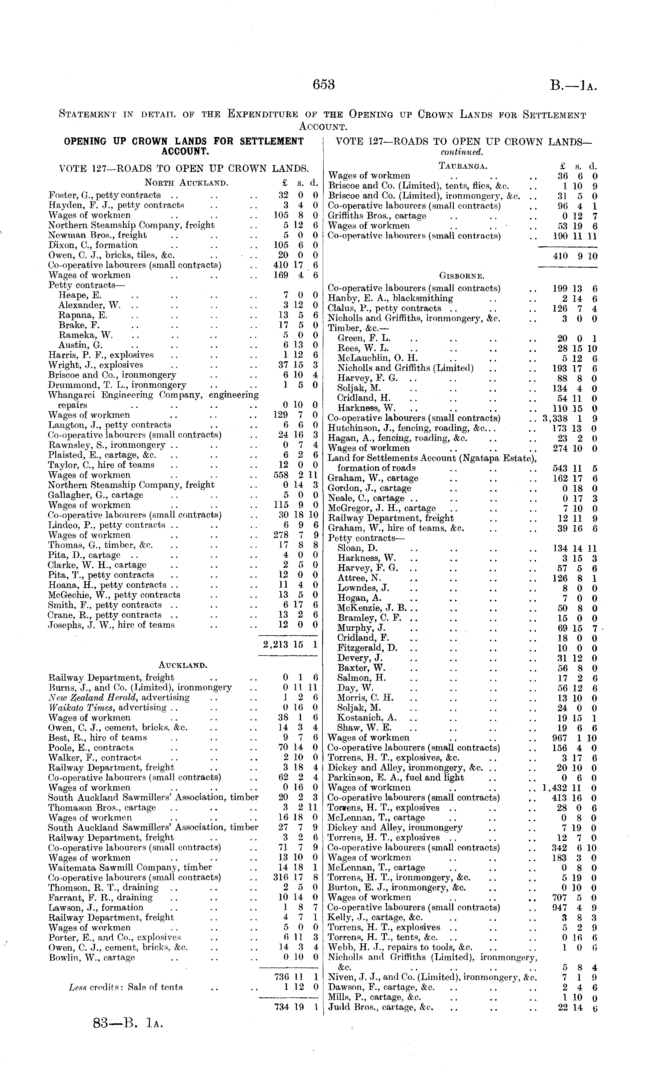 Statement in detail op the Expenditure of the Opening up Crown Lands for Settlement Account. OPENING UP CROWN LANDS FOR SETTLEMENT VOTE 127—ROADS TO OPEN UP CROWN LANDSACCOUNT, continued. VOTE 127—ROADS TO OPEN UP CROWN LANDS. TTT . Taubanga. £ s. d. Wages of workmen .. .. .. 30 6 0 North Auckland. £ s. d. Briscoe and Co. (Limited), tents, flios, &o. .. I 10 9 Foster, G., petty contracts .. .. .. 32 0 0 Briscoe and Co. (Limited), ironmongery, &c. .. 31 5 0 Hayden, F. J., potty contracts .. .. 3 4 0 Co-operative labourers (small contracts) .. 90 4 1 Wages of workmen .. .. .. 105 8 0 Griffiths Bros., cartage .. .. .. 012 7 Northern Steamship Company, freight .. 512 6 Wages of workmen .. .. ■.. 53 19 6 Newman Bros., freight .. .. .. 5 0 0 Co-operative labourers (small contracts) .. 190 11 11 Dixon, C, formation .. .. . . 105 6 0 , Owen, C. J., bricks, tiles, &c. .. ■ .. 20 0 0 410 9 10 Co-operative labourers (small contracts) .. 410 17 6 . - Wages of workmen .. .. . . 169 4 6 Gisbokne. Petty contracts— Co-operative labourers (small contracts) .. 199 13 6 Heape, E 7 0 0 H anbv, c. A., blacksmithing .. .. 214 6 Alexander, W 3 12 0 Clalug> p. ; petty oon tracts 120 7 4 Rapana, E. .. .. .. .. 13 5 6 Nicholls and Griffiths, ironmongery, &c. .. 3 0 0 Brake, F 17 5 0 Timber, &c.Rameka, W 5 0 0 Green, F. L 20 0 1 Austin, G. .. 0 3 0 R e e S) W. L 28 15 10 Harris, P. *~ explosives 112 6 McLauchlin, O. H 512 G Wright, J. explosives 37 15 3 Nicholls and Griffiths (Limited) .. .. 193 17 6 Briscoe and Co., ironmongery .. .. 610 4 Harvey F G 88 8 0 Drummond, T. L., ironmongery .. .. 15 0 Soliak M ' 134 4 0 Whangarei Engineering Company, engineering Cridland H " " " " 54 11 0 repairs 010 0 Harkness, W. '.'. '.'. '.'. '.'. 110 15 0 Wages of workmen .. .. .. 129 7 0 Co-operative labourers (small contracts) .. 3,338 1 9 Langton, J., petty contracts .. .. 0 0 0 Hutchinson, J., fencing, roading, &c... .. 173 13 0 Co-operative labourers (small contracts) .. 24 16 3 H agan, A., fencing, roading, &c 23 2 0 Rawnsley S., ironmongery 0 7 4 Wages of wor k men 274 10 0 Plaisted, E., cartage, &c. .. .. .. 6 2 6 Land for Settlements Account (Ngatapa Estate), Taylor, C, hire of teams 12 0 0 formation of roads .. .. .. 543 11 5 Wages of workmen ... .. 558 211 Graham, W., cartage 162 17 6 Northern Steamship Company, freight .. 0 14 3 Gordon, J. cartage . 0 18 0 Gallagher, G. cartage 5 0 0 Ne ale, C., cartage 017 3 Wages of workmen 115 9 0 McGregor, J. H., cartage .. .. 710 0 Co-operative labourers (small contracts) .. 30 18 10 R a il way Department, freight .. . 12 11 9 Lindeo, P., petty contracts 0 9 6 Graham, W., hire of teams, &c 39 16 6 Wages of workmen .. .. .. 278 7 9 p etty contractsThomas, G., timber, <fee. .. . . . . 17 8 8 Sloan D 134 14 11 Pj ta ; 40 0 Harkness, W. '.'. '.'. '.'. '.'. 315 3 Clarke, W. H., cartage .. .. .. 2 5 0 Harvey, F. G. .. .. . 57 5 6 Pita, T., petty contracts .. .. .. 12 0 0 Attree, N. .. .. .. . 126 8 1 Hoana, H., petty contracts .. .. .. 11 4 0 Lowndes, J. .. .. .. .. 80 0 McGechie, W., petty contracts .. .. 13 5 0 Hogan A 7 0 0 Smith, F., petty contracts .. .. .. 617 6 McKen'zie, J. B. . '. '.'. '.'. '.'. 50 8 0 Crane, R., petty contracts .. .. .. 13 2 6 Bramley, C. F. .. .. 15 0 0 Josephs, J. W., hire of teams .. .. 12 0 0 Murphy,' J. '.. .. .. .. 69 15 7 —— T"—— - : Cridland, F. .. .. .. '.'. 18 0 0 2,213 15 1 Fitzgerald, D. .. .. .. .. 10 0 0 — Devery, J. .. .. .. .. 31 12 0 Auckland. Baxter, W. .. .. .. .. 56 8 0 Railway Department, freight .. .. 0 16 Salmon, H. .. .. .-. .. 17 2 6 Burns, J., and Co. (Limited), ironmongery .. 011 11 Day, W. .. .. .. .. 56 12 6 New Zealand Herald, advertising .. .. 12 6 Morris, C. H. .. .. .. 13 10 0 Waikato Times, advertising .. .. .. 0 16 0 Soljak, M. .. .. .. .. 24 0 0 Wages of workmen .. .. .. 38 1 6 Kostanich, A. .. .. .. 19 15 1 Owen, C. J., cement, bricks, &c. .. .. 14 3 4 Shaw, W. E. .. .. .. .. 19 6 6 Best, R., hire of teams .. .. .. 9 7 6 Wages of workmen .. .. .. 967 110 Poole, E., contracts .. .. .. 70 14 0 Co-operative labourers (small contracts) .. 156 4 0 Walker, F., contracts . . .. .. 210 0 Torrens, H. T., explosives, &c. .. .. 317 6 Railway Department, freight .. .. 318 4 Dickey and Alley, ironmongery, &c. .. .. 20 10 0 Co-operative labourers (small contracts) .. 62 2 4 Parkinson, E. A., fuel and light .. .. 0 6 0 Wages of workmen .. .. .. 016 0 Wages of workmen .. .. .. 1,432 11 0 South Auckland SawmiHers' Association, timber 20 2 3 Co-operative labourers (small contracts) .. 413 16 0 Thomason Bros., cartage .. .. .. 3 211 Tor»ens, H. T., explosives .. .. .. 28 0 6 Wages of workmen .. .. .. 16 18 0 McLennan, T., cartage .. .. .. 0 8 0 South Auckland SawmiHers' Association, timber 27 7 9 Dickey and Alley, ironmongery .. .. 7 19 0 Railway Department, freight .. .. 3 2 6 Torrons, H. T., explosives .. .. .. 12 7 0 Co-operative labourers (small contracts) .. 71 7 9 Co-operative labourers (small contracts) .. 342 610 Wages of workmen .. .. .. 13 10 0 Wages of workmen .. .. .. 183 3 0 Waitemata Sawmill Company, timber .. 14 18 1 McLennan, T., cartage .. .. .. 0 8 0 Co-operative labourers (small contracts) .. 310 17 8 Torrens, H. T., ironmongery, &c. .. .. 519 0 Thomson, R. T., draining .. .. .. 2 5 0 Burton, E. J., ironmongery, &c. .. .. 010 0 Farrant, F. R., draining .. .. .. 10 14 0 Wages of workmen .. .. .. 707 5 0 Lawson, J., formation .. .. .. 18 7 Co-operative labourers (small contracts) .. 947 4 9 Railway Department, freight .. .. 4 7 1 Kelly, J., cartage, &c. .. .. .. 3 8 3 Wages of workmen .. .. .. 5 0 0 Torrens, H. T., explosives .. .. .. 5 2 9 Porter, E., and Co., explosives .. .. 611 3 Torrens, H. T., tents, &c. .. .. .. 010 6 Owen, C. J., cement, bricks, &c. .. .. 14 3 4 Webb, H. J., repairs to tools, &c. .. .. 10 6 Bowlin, W., cartage .. .. .. 010 0 Nicholls and Griffiths (Limited), ironmongery. &c. .. .. .. ..' 5 8 4 730 11 1 Niven, J. J., and Co. (Limited), ironmongery, &,c. 7 19 Lees credits: Sals o