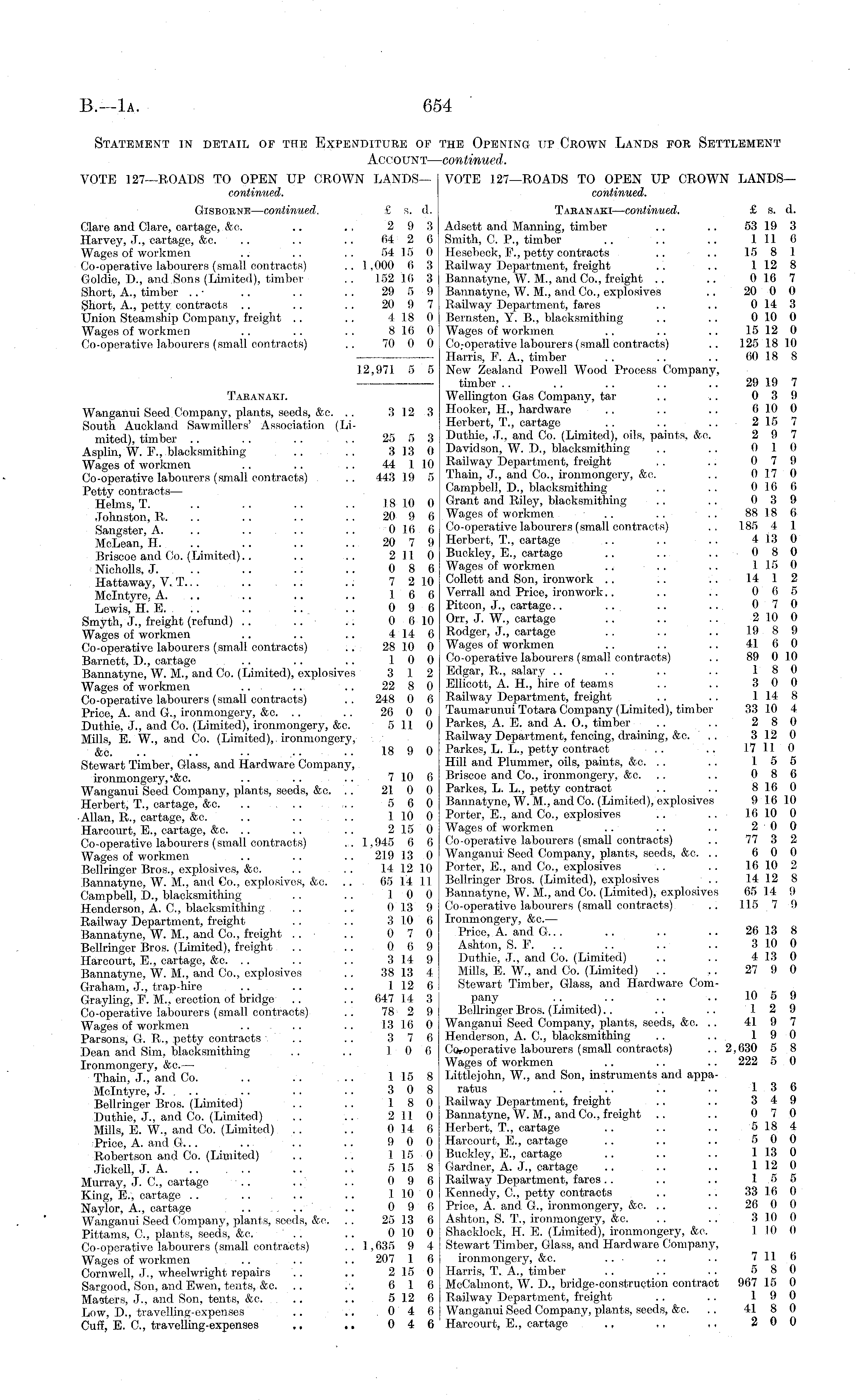 Statement in detail of the Expenditure of the Opening tip Crown Lands for Settlement Account — continued. VOTE 127—ROADS TO OPEN UP CROWN LANDS— VOTE 127—ROADS TO OPEN UP CROWN LANDS— continued. continued. Gisbobne— continued. £ s. d. Taranaki— continued. £ s. d. Clare and Clare, cartage, &c. .. ~ 2 9 3 Adsett and Manning, timber .. .. 53 19 3 Harvey, J., cartage, &c. .. .. .. 64 2 6 Smith, C. P., timber .. .. .. 111 6 Wages of workmen .. .. .. 54 15 0 Hesebeck, I?., petty contracts .. .. 15 8 1 Co-operative labourers (small contracts) .. 1,000 (i 3 Railway Department, freight .. .. 1 12 8 Goldie, D., and.Sons (Limited), timber .. 152 16 3 Bannatyne, W. M., and Co., freight .. .. 016 7 Short, A., timber ..• .. .. .. 29 5 9 Bannatyne, W. M., and Co., explosives .. 20 0 0 Short, A., petty contracts .. .. .. 20 9 7 Railway Department, fares .. .. 014 3 Union Steamship Company, freight .. .. 418 0 Bernsten, Y. 8., blacksmithing .. .. 010 0 Wages of workmen .. .. . . 816 0 Wages of workmen .. .. .. 15 12 0 Co-operative labourers (small contracts) .. 70 0 0 Co-operative labourers (small contracts) .. 125 18 10 Harris, F. A., timber .. .. .. 60 18 8 12,971 5 5 New Zealand Powell Wood Process Company, _ ...—— uiinogj > 4 • * at m ■ ■ • *-f«7 iy i Taeanaki. Wellington Gas Company, tar .. .. 0 3 9 Wanganui Seed Company, plants, seeds, &c. .. 312 3 Hooker, H., hardware .. .. .. 610 0 South Auckland Sawmillers' Association (Li- Herbert, T., cartage . . .. .. 215 7 mited) timber 25 5 3 Duthie, J., and Co. (Limited), oils, paints, &c. 2 9 7 Asplin, W. ¥~ blacksmithing' .. .. 313 0 Davidson, W. D., blacksmithing .. .. 01 0 Wages of workmen .. .. .. 44 110 Railway Department, freight . . .. 0 7 9 Co-operative labourers (small contracts) .. 443 19 5 Thain, J., and Co., ironmongery, &c. .. 017 0 Petty contracts— Campbell, D., blacksmithing _ .. .. 016 6 Helms T. 18 10 0 Grant and Riley, blacksmithing .. .. 0 3 9 Johnston,' R. . '.'. '.'. '.'. '.'. 20 9 6 Wages of workmen .. .... 88 18 6 Sangster A. 016 6 Co-operative labourers (small contracts) .. 185 4 1 McLean,'H.' '.'. .. .. .. 20 7 9 Herbert, T., cartage ... .. .. 413 0 Briscoe and Co. (Limited).. .. .. 2 11 0 Buckley, E., cartage .. .. ..080 Nicholls, J. . . . .. .. .. 0 8 6 Wages of workmen .. . . .. 115 0 Hattaway, V. T.. ... .. .. 72 10 Collett and Son, ironwork .. .. .'. 14 1 2 Mclntyre. A. .. .. .. 16 6 Verrall and Price, ironwork.. .. .. 0 6 5 Lewis, H.E. .. .. .. .. 0 9 6 Pitcon, J., cartage.. .. .. .. 0 7 0 Smyth, J., freight (refund) .. .. .. 0 610 Orr, J. W., cartage .. .. .. 210 0 Wages of workmen .. .. .. 414 6 Rodger, J., cartage .. .. .. 19 8 9 Co-operative labourers (small contracts) .. 28 10 0 Wages of workmen .. .. .. 41 6 0 Barnett D. cartage .. .. .. 10 0 Co-operative labourers (small contracts) .. 89 010 Bannatyne,'w. M., and Co. (Limited), explosives 312 Edgar, R., salary .. .. .. .. 18 0 Wages of workmen . . .. .. 22 8 0 Ellicott, A. H., hire of teams .. .. 3 0 0 Co-operative labourers (small contracts) .. 248 0 6 Railway Department, freight .. .. 114 8 Price, A. and G., ironmongery, &c. .. .. 26 0 0 Taumarunui Totara Company (Limited), timber 33 10 4 Duthie, J., and Co. (Limited), ironmongery, &c. 511 0 Parkes, A. E. and A. 0., timber .. .. 2 8 0 Mills, E. W., and Co. (Limited),, ironmongery, Railway Department, fencing, draining, &c. .. 312 0 & Ci .. __ .. 18 9 0 Parkes, L. L., petty contract .. .. 17 11 0 Stewart Timber, Glass, and Hardware Company, Hill and Plummer, oils, paints, &c. .. .. 15 5 ironmongery,-&c. .. .. .. • 710 6 Briscoe and Co., ironmongery, &c. .. .. 0 8 6 Wanganui Seed Company, plants, seeds, &c. .. 21 0 0 Parkes, L. L., petty contract .. .. 816 0 Herbert, T., cartage, &c. .. .. ... 5 6 0 Bannatyne, W.M., and Co. (Limited), explosives 916 10 • Allan, R., cartage, &c. . . . . .. 110 0 Porter, E., and Co., explosives .. .. 16 10 0 Harcourt, E., cartage, &c. .. .. .. 215 0 Wages of workmen . . . . .. 2 0 0 Co-operative labourers (small contracts) .. 1,945 6 6 Co-operative labourers (small contracts) .. 77 3 2 Wages of workmen .. . . .. 219 13 0 Wanganui Seed Company, plants, seeds, &c. .. 60 0 Bellringor Bros., explosives, &c. . . . . 14 12 1.0 Porter, E., and Co., explosives .. .. 16 10 2 Bannatyne, W. M., and Co., explosives, &c. .. 65 14 11 Bcllringcr Bros. (Limited), explosives .. 14 12 8 Campbell, D., blacksmithing .. .. 10 0 Bannatyne, W. M., and Co. (Limited), explosives 65 14 9 Henderson, A. C, blacksmithing .. .. 0 13 9 Co-operative labourers (small contracts) .. 115 7 9 Railway Department, freight .. .. 310 6 Ironmongery, &c— Bannatyne, W. M., and Co., freight .. .. 0 7 0 Price, A. and G.. . .. .. .. 26 13 8 Bellringer Bros. (Limited), freight .. .. 06 9 Ashton, S. F. .. .. .. .. 310 0 Harcourt, E., cartage, &c. .. .. .. 314 9 Duthie, J., and Co. (Limited) .. . . 413 0 Bannatyne, W. M., and Co., explosives .. 38 13 4 Mills, E. W., and Co. (Limited) .. .. 27 9 0 Graham, J., trap-hire .. .. .. 112 6 Stewart Timber, Glass, and Hardware CornGrayling, I , '. M., erection of bridge .. .. 647 14 3 pany .. .. .. .. 10 5 9 Co-operative labourers (small contracts) .. 78 2 9 Bellringer Bros. (Limited).. .. .. 12 9 Wages of workmen .. 13 16 0 Wanganui Seed Company, plants, seeds, &o. .. 41 9 7 Parsons, G. R., petty contracts .. .. 3 7 6 Henderson, A. C, blacksmithing .. .. 19 0 Dean and Sim. blacksmithing .. .. 10 6 Co-operative labourers (small contracts) ..2,630 5 8 Ironmongery, &c.— Wages of workmen .. .. .. 222 5 0 Thain, J., and Co. .. .. ... 115 8 Littlejohn, W., and Son, instruments and appaMclntyre' J. ... .. .. .. 308 ratus .. .. .. • • 136 Bellringer Bros. (Limited) .. .. 18 0 Railway Department, freight .. .. 3 4 9 Duthie, J., and Co. (Limited) .. ... 2 11 0 Bannatyne, W. M., and Co., freight .. .. 0 7 0 Mills, E. W., and Co. (Limited) .. .. 014 6 Herbert, T., cartage .. .. .. 518 4 Price, A. and G... .. .. .. 9 0 0 Harcourt, E., cartage .. .. .. 5 0 0 Rob