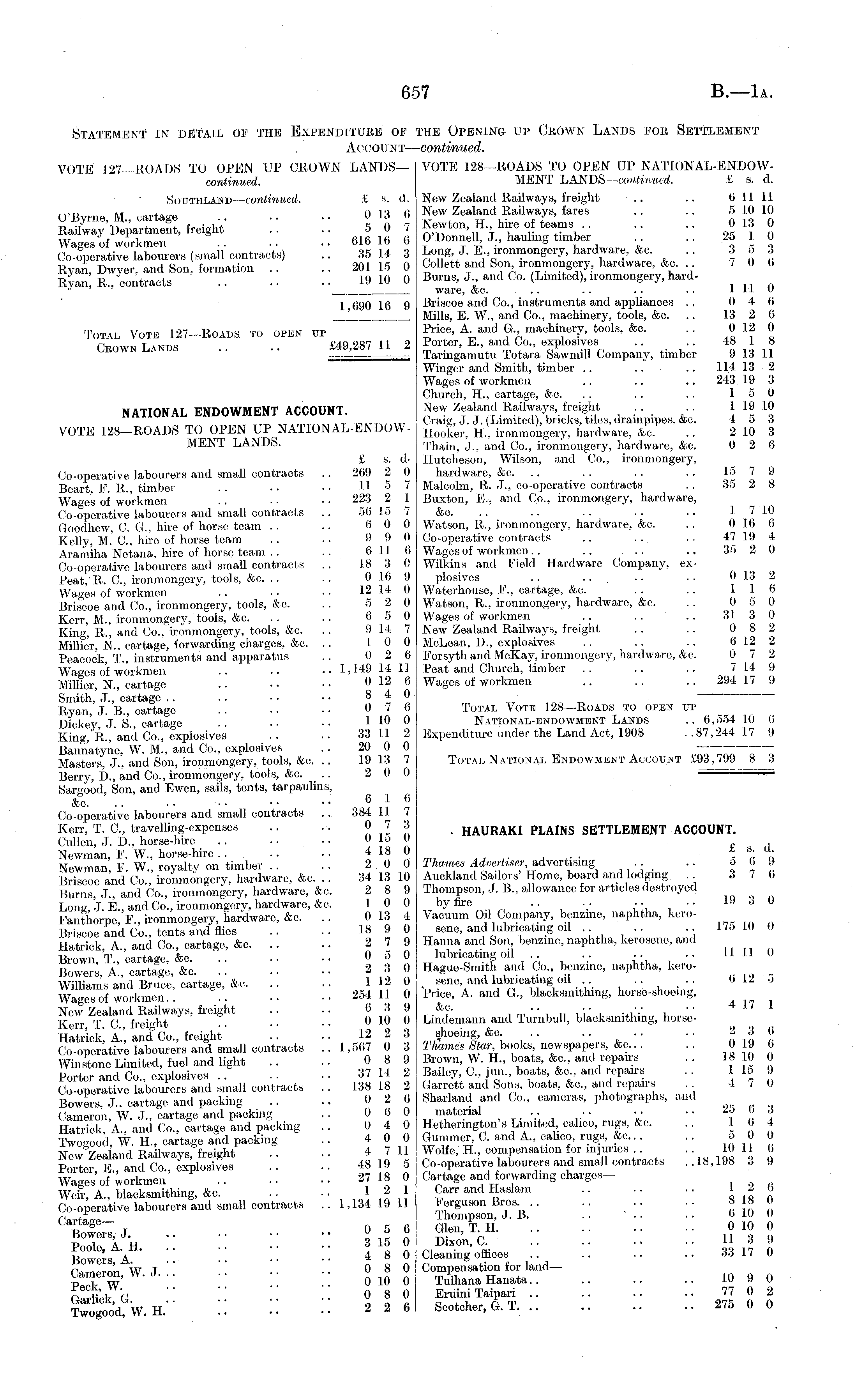 Statement in detail of the Expenditure of the Opening up Crown Lands foe Settlement Account— continued. VOTE 127—ROADS TO OPEN UP UKOWN LANDS— VOTE 128—ROADS TO OPEN DP NATiONAL-ENDOW-continued. MENT LANDS— continued. £ s. d. Southland — continued. £ s. (1. New Zealand Railways, freight .. .. 0 11 11 O'Byrne, M., cartage 013 (i New Zealand Railways, fares .. .. 510 10 Railway Department, freight .. .. 50 7 Newton H hire of teams 013 0 Wagls of workmen 616 16 6 O'Donnell J., hauling timber .. 25 1 0 Co-operative labourers (small contracts) . . 36 14 3 Long J. E ironmongery, hardware, &c .. 3 5 3 Ryan, Dwyer. and Son formation .. .. 20115 0 Collett and Son ironmongery, hardware, &c / 0 (, Ryan R., contracts 19 10 0 Burns, J and Co. (Limited), ironmongery, hardJ ' ' ware, &c. .. .. .. .. 1110 1 690 16 9 Briscoe and Co., instruments and appliances .. 0 4 6 I Mills, E. W., and Co., machinery, tools, &o. .. 13 2 0 Total Voti 127-Roads to e» up Price, A and G machinery, tools, &c. .. 0 12 0 (i.,,,™ r .»™ £49 287 11 2 Porter, E., and Co., explosives .. .. 48 1 8 Crown Lands .. .. Taringamutu Totara Sawmill Company, timber 913 11 Winger and Smith, timber .. .. .. 114132 Wages of workmen .. .. .. 243 19 3 Church, H., cartage, &c. . . .. .. 15 0 NATIONAL ENDOWMENT ACCOUNT. New Zealand Railways, freight .. 1 19 10 _.'_„. Craig, J. J. (Limited), bricks, tiles, drainpipes, &c. 4 o 3 VOTE 128-ROADS TO OPEN UP NATIONAL-IiNDOW- Hoo |' el . ; h.; ironmongery, hardware, &c. .. 210 3 MENT LANDS. Thain, J., and Co., ironmongery, hardware, &c. 0 2 6 £ s. d- Hutcheson, Wilson, and Co., ironmongery, Co-operative labourers and small contracts .. 269 2 0 hardware, &c. .. .. .. .. 15 7 9 Beart, F. R., timber .. .. •• 11 5 7 Malcolm, R. J., co-operative contracts .. 35 2 8 Wage's of workmen .. ■ . ■ • 223 2 1 Buxton, E., and Co., ironmongery, hardware, Co-operative labourers and small contracts .. 56 15 7 &c. . . .. .. .. .. 17 10 Goodhew, C. G., hire of horse team .. .. 60 0 Watson, R., ironmongery, hardware, &c. .. 016 6 Kelly, M. C, hire of horse team .. .. 9 9 0 Co-operative contracts .. .. .. 47 19 4 Aramiha Netana, hire of horse team .. .. (i II (i Wages of workmen. ... .. .. 35 2 0 Co-operative labourers and small contracts .. 18 3 0 Wilkins and Field Hardware Company, exPeat, R. C, ironmongery, tools, &c. .. .. 016 9 plosives .. .. .. .. 013 2 Wages of workmen .. .. ■ • 12 14 0 Waterhouse, F., cartage, &c. . . .. 116 Briscoe and Co., ironmongery, tools, &o. .. 5 2 0 Watson, R., ironmongery, hardware, &c. . . 0 5 0 Kerr, M., ironmongery, tools, &c. .. .. 65 0 Wages of workmen .. .. .. 31 3 0 King, R., and Co., ironmongery, tools, &c. .. 914 7 New Zealand Railways, freight .. .. 08 2 Millie'r, N., cartage, forwarding charges, &c. .. 10 0 McLean, I)., explosives .. .. . . 612 2 Peacock. T., instruments and apparatus .. 0 2 6 Forsyth and McKay, ironmongery, hardware, &c. 0 7 2 Wages of workmen .. .. .. 1,149 14 11 Peat and Church, timber .. .. .. 714 9 Millier, N., cartage .. •• •■ 012 6 Wages of workmen .. .. .. 294 17 9 Smith, J., cartage .. .. • • ■ • 84 0 Ryan J. 8., cartage .. ■ ■ • • 0 7 6 Total Vote 128—Roads to open up Dickey J S.. cartage .. .. ■• 1 10 0 National-endowment Lands .. 6,554 L 0 0 King, R., and Co., explosives .. .. 33 11 2 Expenditure under the Land Act, 1908 ..87,244 17 9 Bannatyne, W. M., and Co., explosives 20 0 0 ~:~Z^T~~~7, Masters, J., and Son, ironmongery, tools, &c. .. 19 13 7 Total National Endowment Account £93,799 8 A Berry, D., and Co., ironmongery, tools, &c. .. 2 0 0 Sargood, Son, and Ewen, sails, tents, tarpaulins, &o. .. .. 6 16 Co-operative labourers and small contracts .. 384 11 7 Kerr, T. C, travelling-expenses .. .. 07 3 HAURAKI PLAINS SETTLEMENT ACCOUNT. Cullen, J. D., horse-hire ...... 010 O Newman, F. W., horse-hire .. ... •• 418 0 * b "■ Newman, F. W., royalty on timber .. .. 20 0 Thames Advertiser, advertising .. .. «« 9 Briscoe and Co., ironmongery, hardware, &c. .. 34 13 10 Auckland Sailors' Homo, board and lodging . 3/0 Bums J., and Co., ironmongery, hardware, &c. 28 9 Thompson, J. 8., allowance for articles destroyed Long, J. E., and Co., ironmongery, hardware, &c. 10 0 by fire .... .. .. 19 3 0 Fanthorpe F., ironmongery, hardware, &c. .. 013 4 Vacuum Oil Company, benzine, naphtha, keroBriscoe and Co., tents and flies .. .. 18 9 0 sene, and lubricating oil .. .. 175 10 0 Hatrick, A., and Co., cartage, &c 2 7 9 Hanna and Son, benzine, naphtha, kerosene, and Brown T cartage &c ..050 lubricating oil .. .. .. .. 11 II 0 Bowers, A!, cartage, &c. " .. .. 23 0 Hague-Smith and Co., benzine, naphtha, keroWilliams and Bruce, cartage, &c 112 0 sene and lubricating oil .. l> 12 o Wages of workmen.. .. .. 254 11 0 Price, A. and G., blacksnuthmg, horse-shoemg, New Zealand Railways, freight .. .. 6 3 9 &o. „■■ " . V ■• 4 1/1 Kerr T C freight .. .. 010 0 Lindemann and Turnbull, blacksnuthmg, horseHatriokiA.', and Co., freight" '.'. ■■ 12 2 3 shooing, &c .. .. .. Co-operative labourers and small contracts ...1,567 0 3 Thames Star ; &0... .. 019 6 Winstone Limited, fuel and light .. .. 08 9 Brown W. H., boats, &c, and repairs .. 18 10 0 Porter and Co., explosives 37 14 2 Bailey, C|.m., boats &c and repairs .. 115 9 Co-operative labourers and small contracts .. 138 18 2 Garrett and Sons, boats, &c, and repairs . 4/0 Bowers, J., cartage and packing .. .. 02 6 Shadand and Co., cameras, photographs, and Cameron, W. J., cartage and packing .. 0 0 0 material .. .. .. .. b 6 Hatrick, A., and Co., cartage and packing .. 04 0 Hetherington's Limited calico, rugs, &c. I 6 4 Twogood, W. H., cartage and packing .. 40 0 Gummer, C. and A. calico, rugs, &q 50 0 Railways, freight .. .. 47 11 Wolfe, H, compensation for mjunes .10 116 Porter E., and Co., explosives .. .. 48 19 5 Co-operative labourers and small contracts ..18,198 3 9 Wages of workmen 27 18 0 Cartage and. forwarding chargesWe&, A., blacksmit