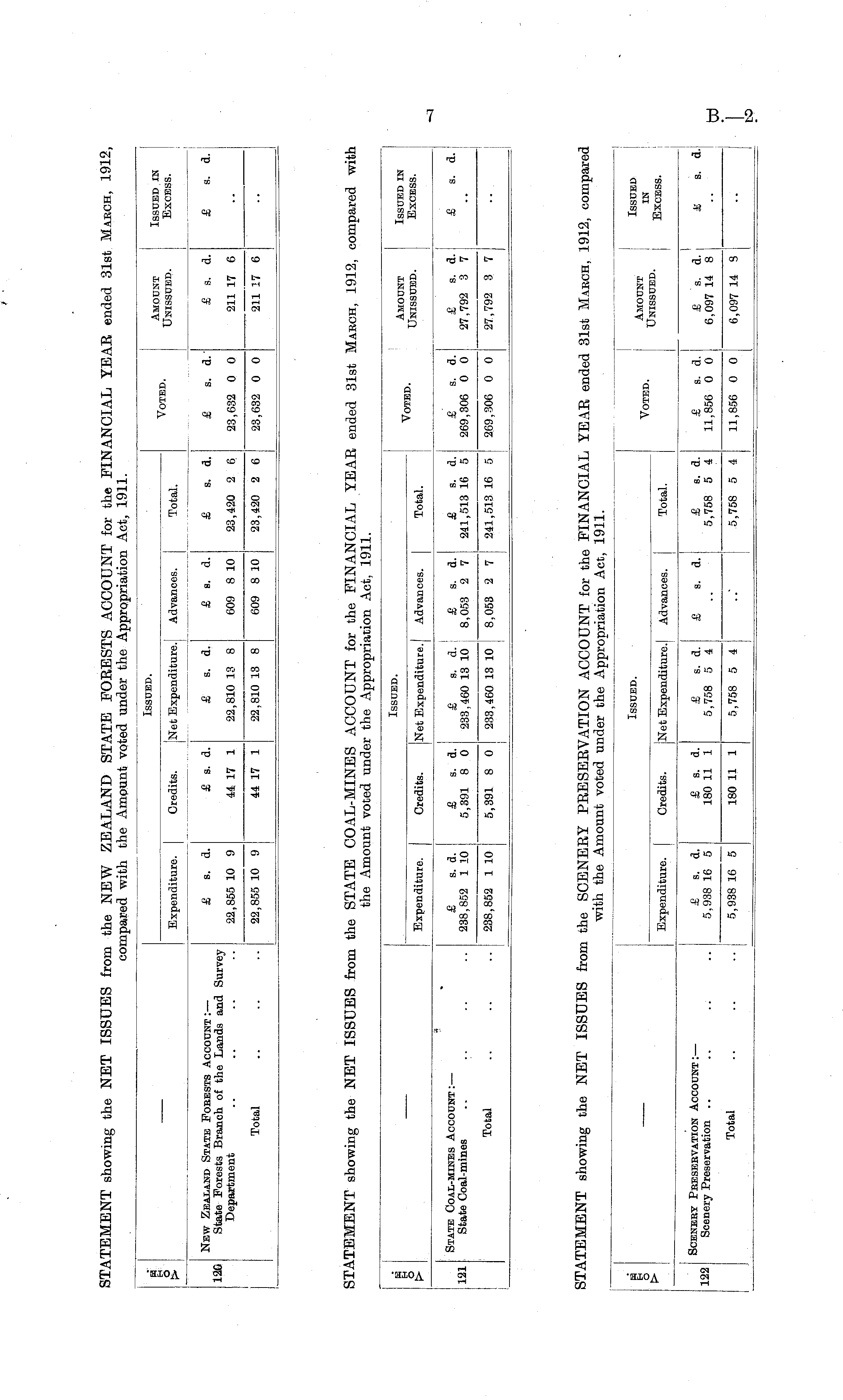 STATEMENT showing the NET ISSUES from the NEW ZEALAND STATE FORESTS ACCOUNT for the FINANCIAL YEAR ended 31st March, 1912, compared with the Amount voted under the Appropriation Act, 1911.