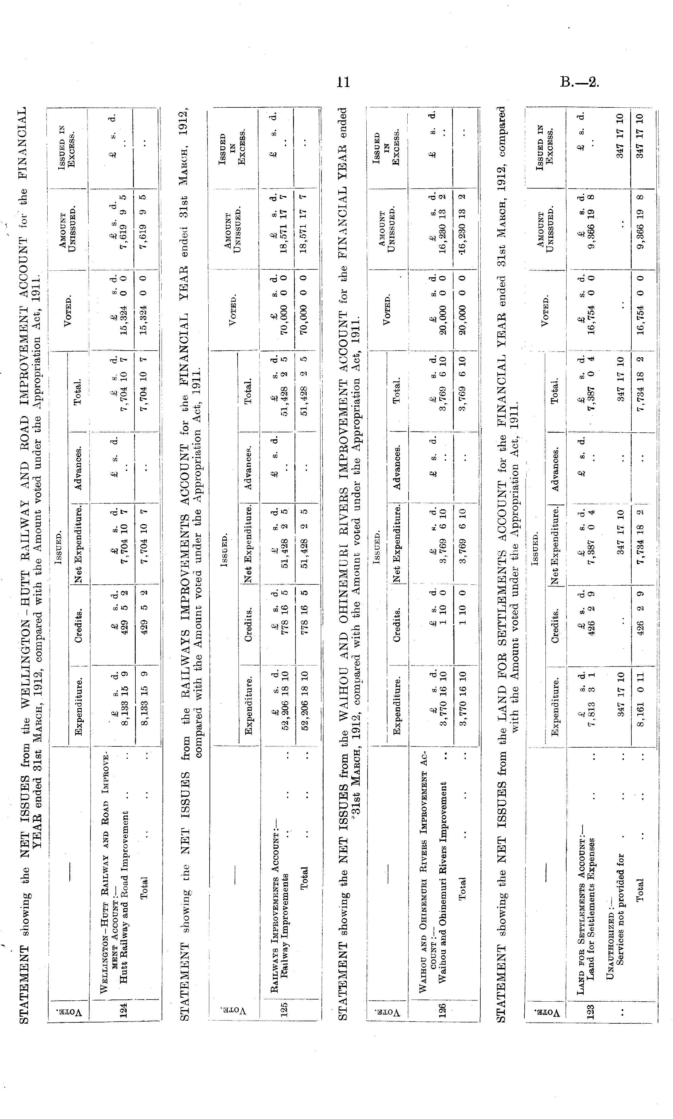 STATEMENT showing the NET ISSUES from the RAILWAYS IMPROVEMENTS ACCOUNT for the FINANCIAL YEAR ended 31st March, 1912, compared with the Amount voted under the Appropriation Act, 1911.