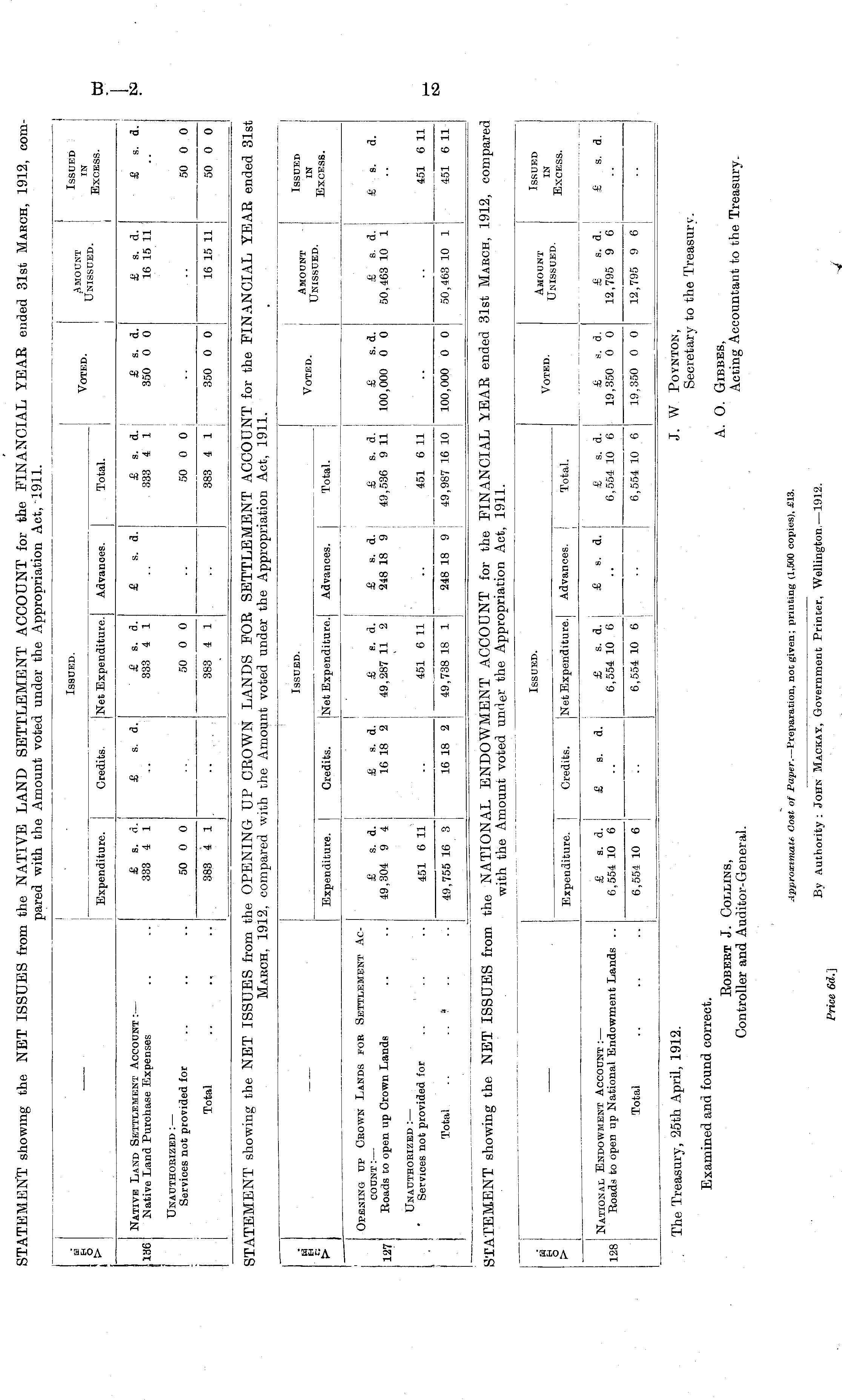 The Treasury, 25th April, 1912. J. W. Poynton, Secretary to the Treasury. Examined and found correct. Eobbet J. Collins, A - °- ( f IBBES '. ~.,, „, Controller and Auditor-General. Actm S Accountant to the Treasury.