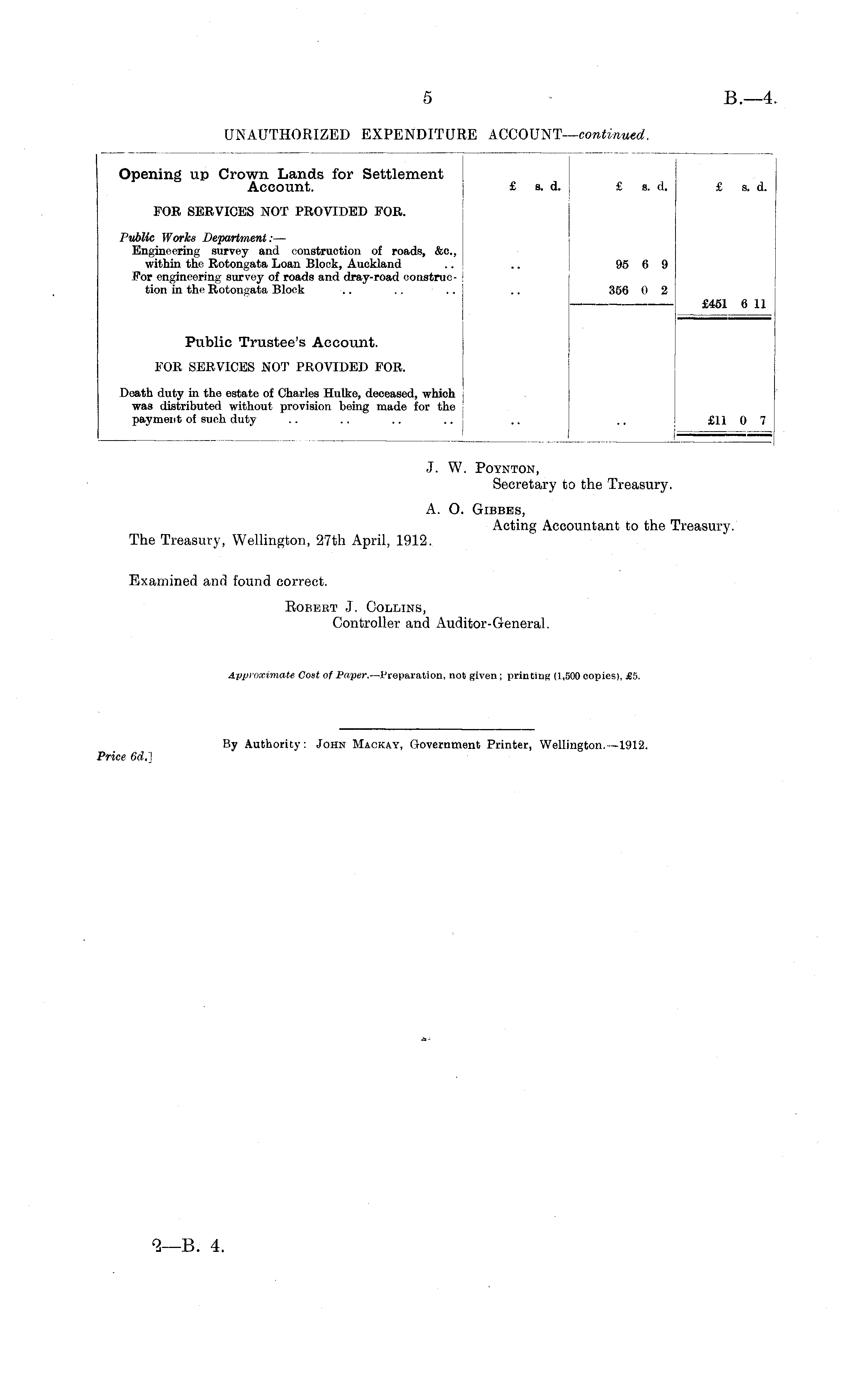J. W. POYNTON, Secretary to the Treasury. A. O. GIBBES, Acting Accountant to the Treasury. The Treasury, Wellington, 27th April, 1912. Examined and found correct. Eokeet J. Collins, Controller and Auditor-General. Approximate Cost of Paper.— Preparation, nob given; printing (1,500 copies), £5.