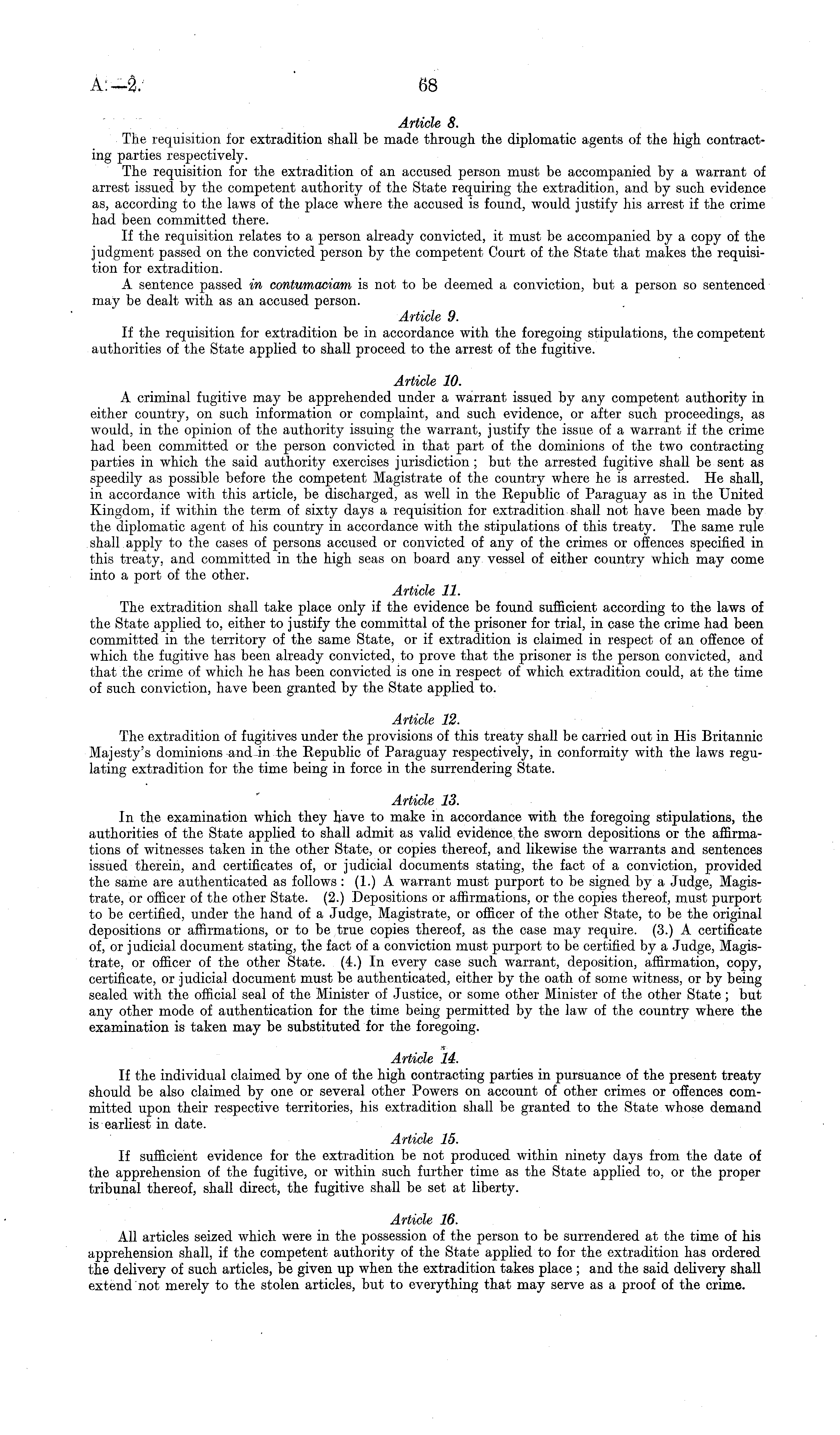 The requisition for extradition shall be made through the diplomatic agents of the high contracting parties respectively. The requisition for the extradition of an accused person must be accompanied by a warrant of arrest issued by the competent authority of the State requiring the extradition, and by such evidence as, according to the laws of the place where the accused is found, would justify his arrest if the crime had been committed there. If the requisition relates to a person already convicted, it must be accompanied by a copy of the judgment passed on the convicted person by the competent Court of the State that makes the requisition for extradition. A sentence passed in contumaciam is not to be deemed a conviction, but a person so sentenced may be dealt with as an accused person. Article 9. If the requisition for extradition be in accordance with the foregoing stipulations, the competent authorities of the State applied, to shall proceed to the arrest of the fugitive. Article 10. A criminal fugitive may be apprehended under a warrant issued by any competent authority in either country, on such information or complaint, and such evidence, or after such proceedings, as would, in the opinion of the authority issuing the warrant, justify the issue of a warrant if the crime had been committed or the person convicted in that part of the dominions of the two contracting parties in which the said authority exercises jurisdiction ; but the arrested fugitive shall be sent as speedily as possible before the competent Magistrate of the country where he is arrested. He shall, in accordance with this article, be discharged, as well in the Republic of Paraguay as in the United Kingdom, if within the term of sixty days a requisition for extradition shall not have been made by the diplomatic agent of his country in accordance with the stipulations of this treaty. The same rule shall apply to the cases of persons accused or convicted of any of the crimes or offences specified in this treaty, and committed in the high seas on board any vessel of either country which may come into a port of the other. Article 11. The extradition shall take place only if the evidence be found sufficient according to the laws of the State applied to, either to justify the committal of the prisoner for trial, in case the crime had been committed in the territory of the same State, or if extradition is claimed in respect of an offence of which the fugitive has been already convicted, to prove that the prisoner is the person convicted, and that the crime of which he has been convicted is one in respect of which extradition could, at the time of such conviction, have been granted by the State applied to. Article 12. The extradition of fugitives under the provisions of this treaty shall be carried out in His Britannic Majesty's dominions and in the Republic of Paraguay respectively, in conformity with the laws regulating extradition for the time being in force in the surrendering State. Article 13. In the examination which they have to make in accordance with the foregoing stipulations, the authorities of the State applied to shall admit as valid evidence, the sworn depositions or the affirmations of witnesses taken in the other State, or copies thereof, and likewise the warrants and sentences issued therein, and certificates of, or judicial documents stating, the fact of a conviction, provided the same are authenticated as follows : (1.) A warrant must purport to be signed by a Judge, Magistrate, or officer of the other State. (2.) Depositions or affirmations, or the copies thereof, must purport to be certified, under the hand of a Judge, Magistrate, or officer of the other State, to be the original depositions or affirmations, or to be true copies thereof, as the case may require. (3.) A certificate of, or judicial document stating, the fact of a conviction must purport to be certified by a Judge, Magistrate, or officer of the other State. (4.) In every case such warrant, deposition, affirmation, copy, certificate, or judicial document must be authenticated, either by the oath of some witness, or by being sealed with the official seal of the Minister of Justice, or some other Minister of the other State; but any other mode of authentication for the time being permitted by the law of the country where the examination is taken may be substituted for the foregoing. Article 14. If the individual claimed by one of the high contracting parties in pursuance of the present treaty should be also claimed by one or several other Powers on account of other crimes or offences committed upon their respective territories, his extradition shall be granted to the State whose demand is earliest in date. Article 15. If sufficient evidence for the extradition be not produced within ninety days from the date of the apprehension of the fugitive, or within such further time as the State applied to, or the proper tribunal thereof, shall direct, the fugitive shall be set at liberty. Article 16. All articles seized which were in the possession of the person to be surrendered at the time of his apprehension shall, if the competent authority of the State applied to for the extradition has ordered the delivery of such articles, be given up when the extradition takes place ; and the said delivery shall extend not merely to the stolen articles, but to everything that may serve as a proof of the crime.