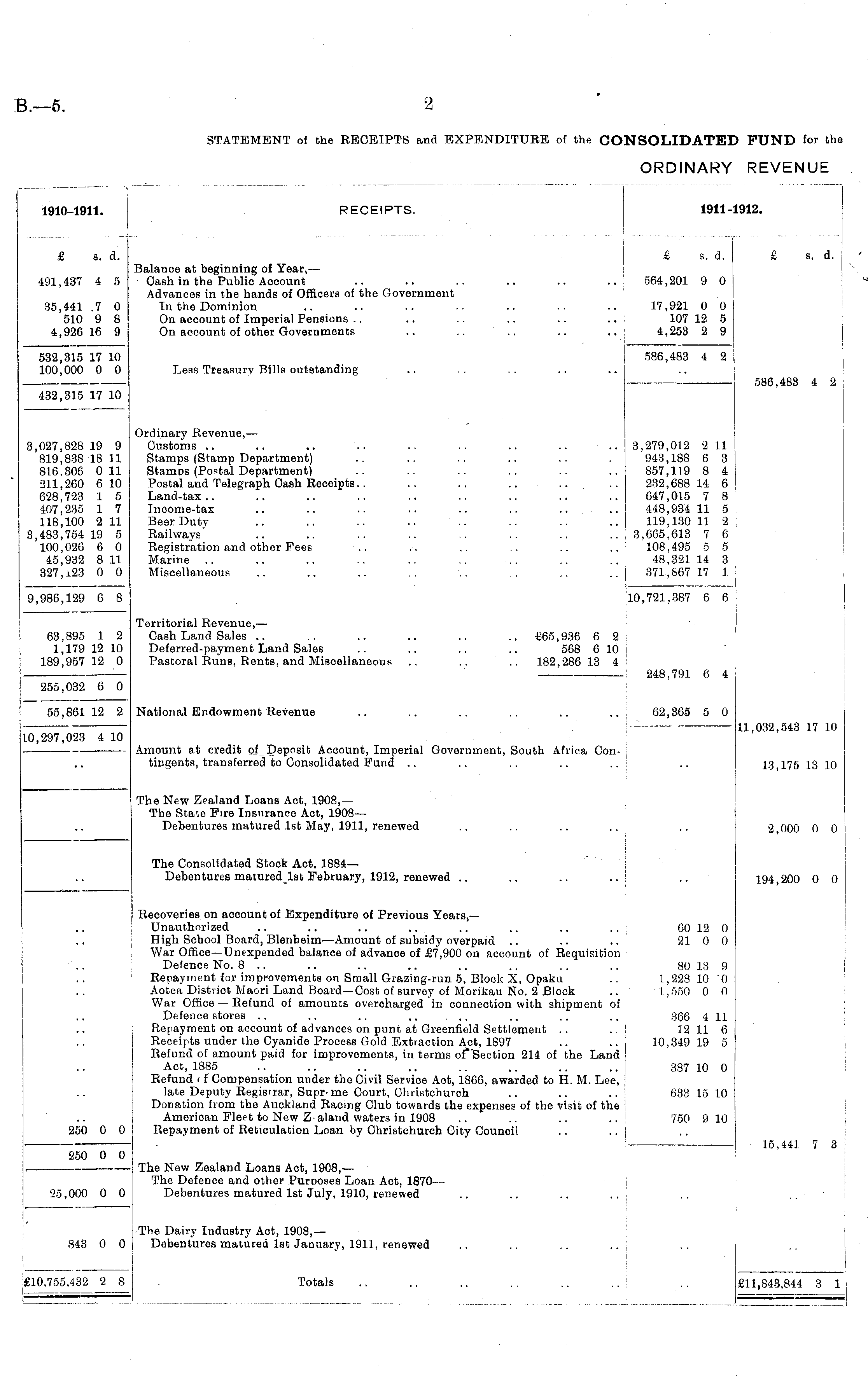 1910-1911. RECEIPTS, 19111911 912. £ a. a. £ s. a. £ s. d. 491,437 4 5 Balanoe at beginning of Year, — Cash in the Public Aocount .. .. .. .. .. .. j Advances in the hands of Officers of the Government In the Dominion .. .. .. .. .. .. On account of Imperial Pensions On account of other Governments .. .. .. .. .. 51 564,201 9 0 17,921 0 0 107 12 5 4,253 2 9 £ s. d. 564,201 9 0 17,921 0 0 107 12 5 4,253 2 9 35,441 .7 0 510 9 8 4,926 16 9 - :oe aoo a n 532,315 17 10 100,000 0 0 Less Treasury Bills outstanding 5i 586,483 4 2 586,483 4 2 432,315 17 10 586,488 4 2 3,027,828 19 9 819,838 18 11 816,306 0 11 211,260 6 10 628,723 1 5 407,235 1 7 118,100 2 11 3,483,754 19 5 100,026 6 0 45,932 8 11 327,123 0 0 9,986,129 6 8 Ordinary Revenue, — Customs .. .. .. .. .. .. .. .. .. 3 Stamps (Stamp Department) Stamps (Postal Department) Postal and Telegraph Cash Receipts Land-tax Income-tax .. .. .. .. .. .. .... Beer Duty Railways .. .. .. .. .. .. .. .. 3 Registration and other Pees Marine Miscellaneous .. .. .. .. .. .. .. .. — 1fl 3,279,012 2 11 943,188 6 3 857,119 8 4 232,688 14 6 647,015 7 8 448,934 11 5 119,130 11 2 3,665,613 7 6 108,495 5 5 48,321 14 3 371,667 17 1 :).2 9 8 2 6 4 1 3.G 1 3 (1 7 279,012 2 11 343,188 6 3 357,119 8 4 232,688 14 6 347,015 7 8 148,934 11 5 119,130 11 2 565,613 7 6 108,495 5 5 48,321 14 3 371,667 17 1 791 387 fi R 1U Territorial Revenue, — Cash Land Sales .. ., .. .. .. .. £65,936 6 2 Deferred-payment Land Sales .. .. .. .. 568 6 10 Pastoral Runs, Rents, and Miscellaneous .. .. .. 182,286 13 4 10,721,387 6 6 2 m, 387 h r> 248,791 6 4 63,895 1 2 1,179 12 10 189,957 12 0 248,791 6 4 255,032 6 0 National Endowment Revenue i 62,365 5 0 62,365 5 0 55,861 12 2 .0,297,023 4 10 i Amount at credit of Deposit Account, Imperial Government, South Africa Contingents, transferred to Consolidated Fund .. .. .. .. 11,032,543 17 10 13,175 18 10 The New Zealand Loans Act, 1908,— The State Fire Insurance Act, 1908— Debentures matured 1st May, 1911, renewed .. .. .. 2,000 0 0 The Consolidated Stock Act, 1884— Debentures matured 1st February, 1912, renewed 194,200 0 0 Recoveries on account of Expenditure of Previous Years,— Unauthorized High School Board, Blenheim—Amount of subsidy overpaid War Office—Unexpended balance of advance of £7,900 on account of Requisition Defence No. 8 .. .. .. .. .. .. .. Repayment for improvements on Small Grazing-run 5, Block X, Opaku Aotea District Maori Land Board—Cost of survey of Morikau No. 2 Block War Office — Refund of amounts overcharged in connection with shipment of Defence stores Repayment on account of advances on punt at Greenfield Settlement Receipts under the Cyanide Process Gold Extraction Act, 1897 Refund of amount paid for improvements, in terms of*Section 214 of the Land Act, 1885 Refund < f Compensation under the Civil Service Act, 1866, awarded to H. M. Lee, late Deputy Registrar, Supr-me Court, Christchurch Donation from the Auckland Racing Club towards the expenses of the visit of the American Fleet to New Z-aland waters in 1908 .. .. .. Repayment of Reticulation Loan by Ohristchurch City Council 60 12 0 21 0 0 80 13 9 1,228 10 '0 1,550 0 0 366 4 11 12 11 6 10,349 19 5 387 10 0 633 15 10 750 9 10 250 0 0 15,44] 7 3 250 0 0 The New Zealand Loans Act, 1908, — The Defence and other Purposes Loan Act, 1870 — Debentures matured 1st July, 1910, renewed 25,000 0 0 The Dairy Industry Act, 1908, — Debentures matured 1st January, 1911, renewed 843 0 0 £11,843,844 3 1 10,755,432 2 8 Totals