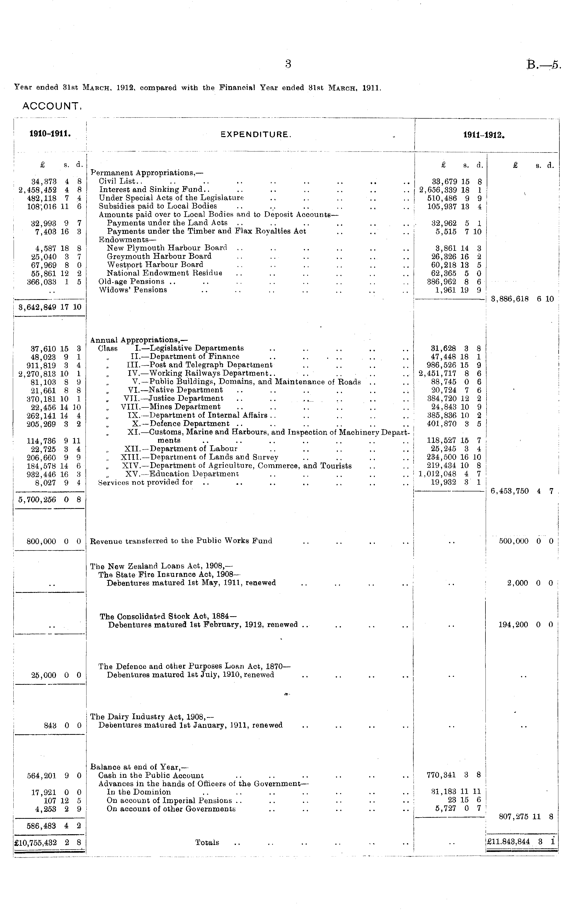 1910-1911. EXPENDITURE. 1911[912. £ s. d. Permanent Appropriations,— Civil List Interest and Sinking Fund.. Under Special Acts of the Legislature .. .. .. Subsidies paid to Local Bodies Amounts paid over to Local Bodies and to Deposit Accounts— Payments under the Land Acts Payments under the Timber and Flax Royalties Aot Endowments — New Plymouth Harbour Board Greymouth Harbour Board Westport Harbour Board National Endowment Residue Old-age Pensions .. Widows' Pensions £ a. d. £ s. a. 34,373 4 8 2,458,452 4 8 482,118 7 4 108;016 11 6 33,679 15 8 2,656,339 18 1 510,486 9 9 105,937 13 4 32,993 9 7 7,403 16 3 32,962 5 1 5,515 7 10 4,587 18 8 25,040 3 7 67,969 8 0 55,861 12 2 366,033 1 5 3,861 14 3 26,326 16 2 60,218 13 5 62,365 5 0 386,962 8 6 1,961 19 9 3,642,849 17 10 ,886,618 6 10 37,610 15 3 48,023 9 1 911,819 3 4 2,270,813 10 1 81,103 8 9 21,661 8 8 370,181 10 1 22,456 14 10 262,141 14 4 205,269 3 2 Annual Appropriations,— Class I.—Legislative Departments II. —Department of Finance .. .. ... III.—Post and Telegraph Department IV.—Working Railways Department.. .. V.—Public Buildings, Domains, and Maintenance of Roads .. „ VI. —Native Department „ VII.—Justice Department VIII. —Mines Department IX. —Department of Internal Affairs .. X. —Defence Department .. XI.—Customs, Marine and Harbours, and Inspection of Machinery Departments XII. —Department of Labour XIII. —Department of Lands and Survey „ XIV. —Department of Agriculture, Commerce, and Tourists XV. —Education Department Services not provided for 31,628 3 8 47,448 18 1 986,526 15 9 2,451,717 8 6 88,745 0 6 20,724 7 6 384,720 12 2 24,843 10 9 385,836 10 2 401,870 3 5 114,736 9 11 22,725 3 4 206,660 9 9 184,578 14 6 932,446 16 3 8,027 9 4 118,527 15 7 25,245 3 4 234,500 16 10 219,434 10 8 1,012,048 4 7 19,932 3 1 5,700,256 0 8 6,453,750 4 7 Revenue transferred to the Public Works Fund 500,000 0 0 800,000 0 0 The New Zealand Loans Act, 1908,— The State Fire Insurance Act, 1908Debenturee matured 1st May, 1911, renewed 2,000 0 0 The Consolidated Stock Aot, 1884— Debentures matured 1st February, 1912, renewed 194,200 0 0 The Defence and other Purposes Loan Act, 1870 — Debentures matured 1st July, 1910, renewed 25,000 0 0 843 0 0 The Dairy Industry Act, 1908,— Debentures matured 1st January, 1911, renewed Balance at end of Year, — Cash in the Public Aooouni Advances in the hands of Offioers of the Government — In the Dominion On account of Imperial Pensions On account of other Governments 770,341 3 8 564,201 9 0 17,921 0 0 107 12 5 4,253 2 9 31,183 11 11 23 15 6 5,727 0 7 807,275 11 8 586,483 4 2 Totals :i0,755,432 2 8 :£11.843,844 3 1