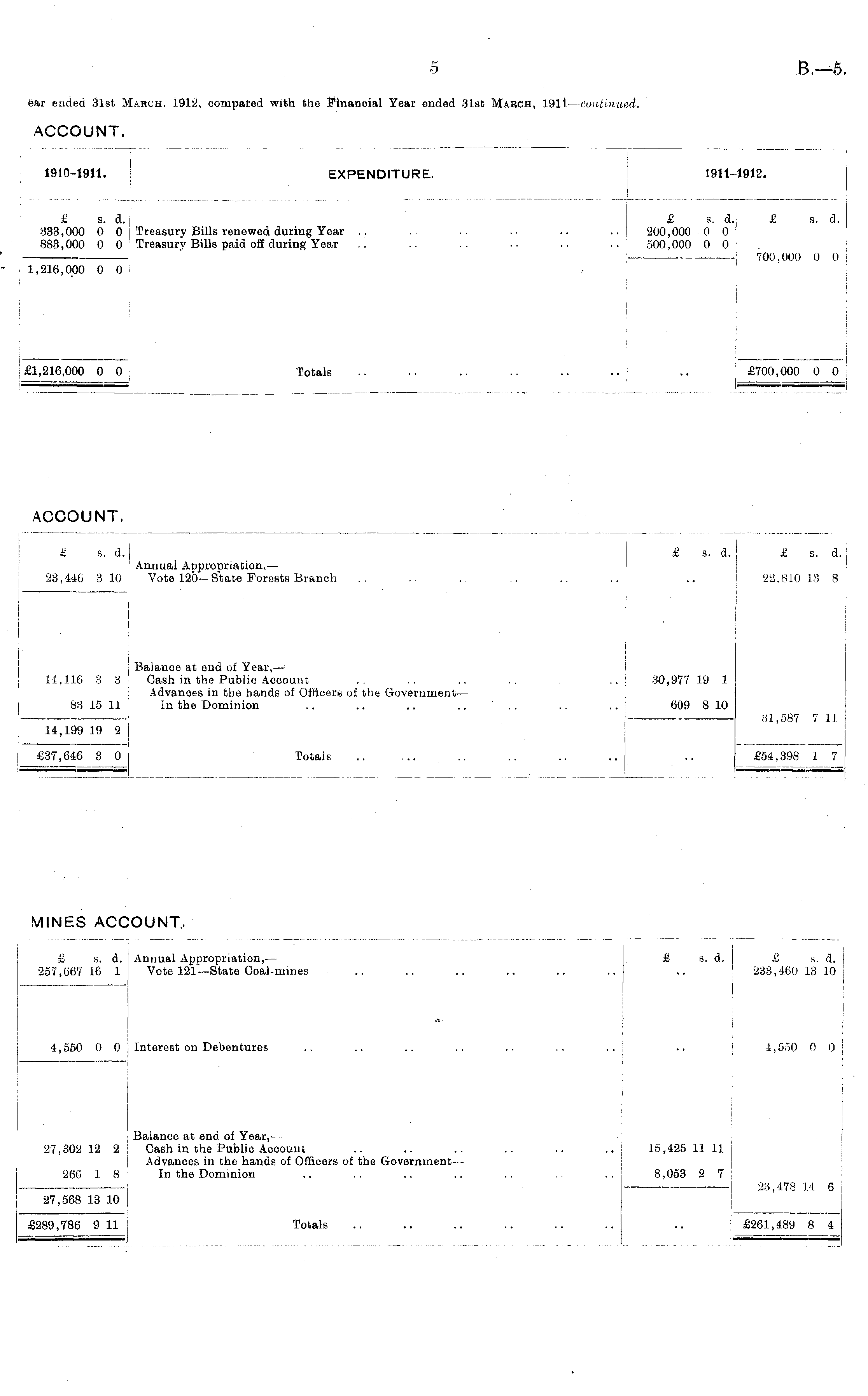 nv/ouui\ i ■ 1910-1911. EXPENDITURE. £ s. d. I 633,000 0 0 : Treasury Bills renewed during Year .. 883,000 0 0 Treasury Bills paid oft during Year 1911-1912. £ s. d. £ s. d. .. ' 200,000 0 0 500,000 0 0 ' I 1,216,000 0 0 . 700,000 0 0 £1,216,000 0 0 j Totals £700,000 0 0 - — i ACCOUNT. £ ■. d.| Annual Approuriacion. — 23,446 3 10 Vote 120—State PorestH Branch £ s. d. ! £ s. d. .. j .. 22,810 18 8 I £ s. d. 22,810 18 8 ~ Balance at end of Year, — 14,116 3 3 Cash in the Public Account Advanoes in fcho hands of Officers of the Government— 83 15 11 In the Dominion 30,977 19 1 609 8 10 ■ 31.587 7 11 ' OX,UOf ( -LJL 81,587 7 11 14,199 19 2 J £37,646 3 0 Totals £54,398 1 7 £54,398 1 7 MINES ACCOUNT, £ s. d. j Annual Appropriation,— 257,667 16 1 Vote 121— State Coal-mines £ s. d. j £ r. d. ! 233,460 13 10 4,550 0 0 t Interest on Debentures 1 4,550 0 0 J Balance at end of Year,— 27,302 12 2 ! Cash in the Public Account Advances in the hands of Officers of the Government 266 18 In the Dominion 27,568 13 10 .. i 15,425 11 11 8,053 2 7 __ _l 23,478 U 6 £289,786 9 11 I Totals £289,786 9 11 ! £261,489 8 4 £261,489 8 4