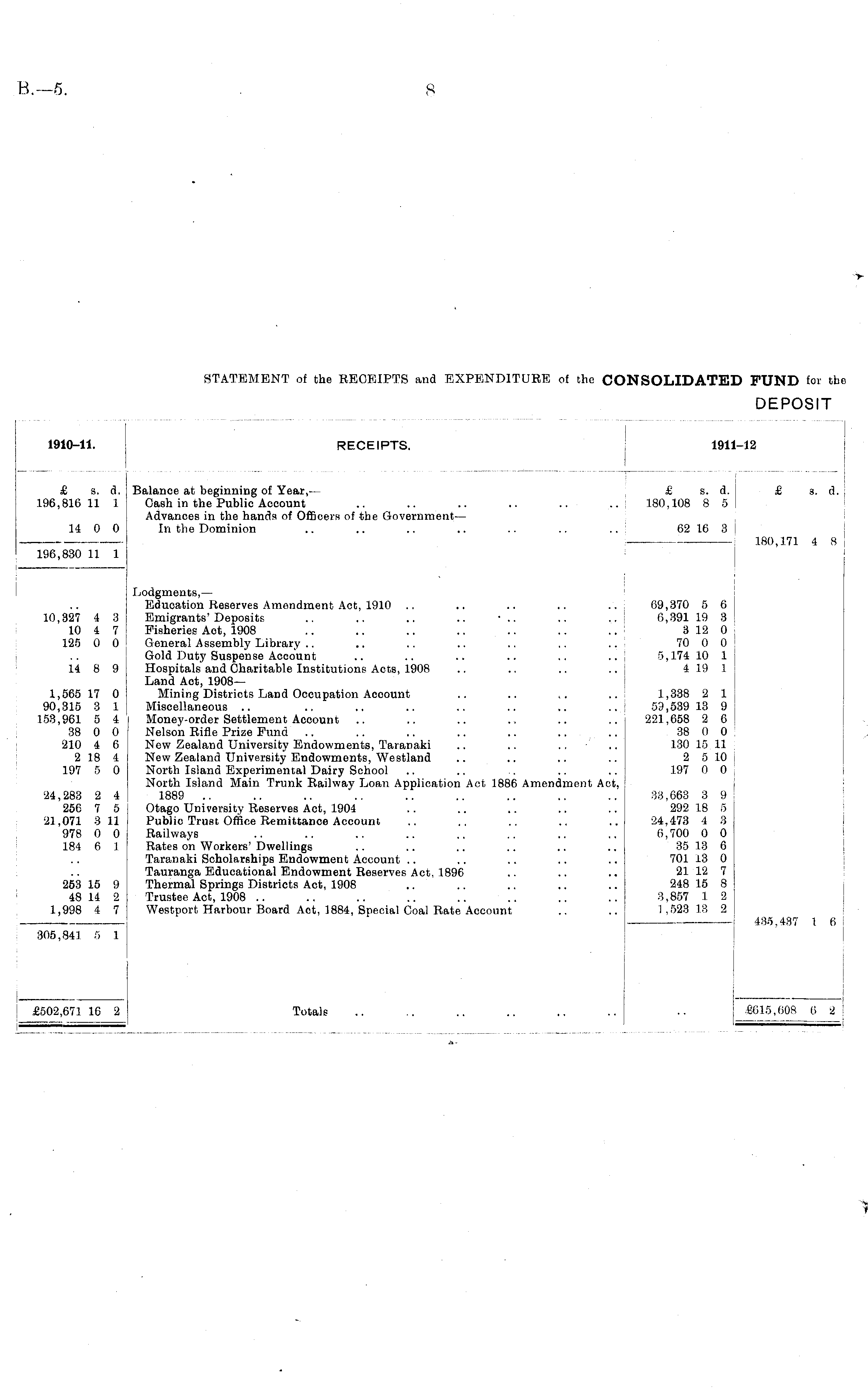 1910-11. RECEIPTS. 191 1-12 £ s. A. 196,816 11 1 Balance at beginning of Year, — Cash in the Public Account .. .. .. .. Advances in the hands of Officers of the Government— In the Dominion £ s. d. 180,108 8 5 62 16 3 £ s. a. 14 0 0 180,171 4 8 196,830 11 1 10,327 4 3 10 4 7 125 0 0 14 8 9 1,565 17 0 90,315 3 1 153,961 5 4 38 0 0 210 4 6 2 18 4 197 5 0 Lodgments,— Education Reserves Amendment Act, 1910 Emigrants' Deposits .. .. .. .. • .. Fisheries Act, 1908 General Assembly Library .. Gold Duty Suspense Acoount Hospitals and Charitable Institutions Acts, 1908 Land Act, 1908— Mining Districts Land Occupation Acoount Miscellaneous .. .. .. .. .. .. .. Money-order Settlement Account .. .. .. .. .. .. '. Nelson Rifle Prize Fund New Zealand University Endowments, Taranaki New Zealand University Endowments, Westland North Island Experimental Dairy School North Island Main Trunk Railway Loan Application Act 1886 Amendment Act, 1889 .. Otago University Reserves Act, 1904 Public Trust Office Remittance Account Railways Rates on Workers' Dwellings Taranaki Scholarships Endowment Account Tauranga Educational Endowment Reserves Act, 1896 Thermal Springs Districts Act, 1908 Trustee Act, 1908 .. Westporfc Harbour Board Aot, 1884, Special Coal Rate Account 69,370 5 6 6,391 19 8 3 12 0 70 0 0 5,174 10 1 4 19 1 1,338 2 1 53,539 13 9 221,658 2 6 38 0 0 130 15 11 2 5 10 197 0 0 33,663 3 9 292 18 5 24,473 4 3 6,700 0 0 35 13 6 701 13 0 21 12 7 248 15 8 3,857 1 2 1,523 13 2 69,370 5 6 c>, 391 19 8 3 12 0 70 0 0 5,174 10 1 4 19 1 1,338 2 1 53,539 13 9 221,658 2 6 38 0 0 130 15 11 2 5 10 197 0 0 24,283 2 4 256 7 5 21,071 8 11 978 0 0 184 6 1 33,663 3 9 292 18 5 24,473 4 3 6,700 0 0 35 13 6 701 13 0 21 12 7 248 15 8 3,857 1 2 1,523 13 2 253 15 9 48 14 2 1,998 4 7 435,437 1 6 305,841 5 1 Totals £502,671 16 2 6615,608 6 2