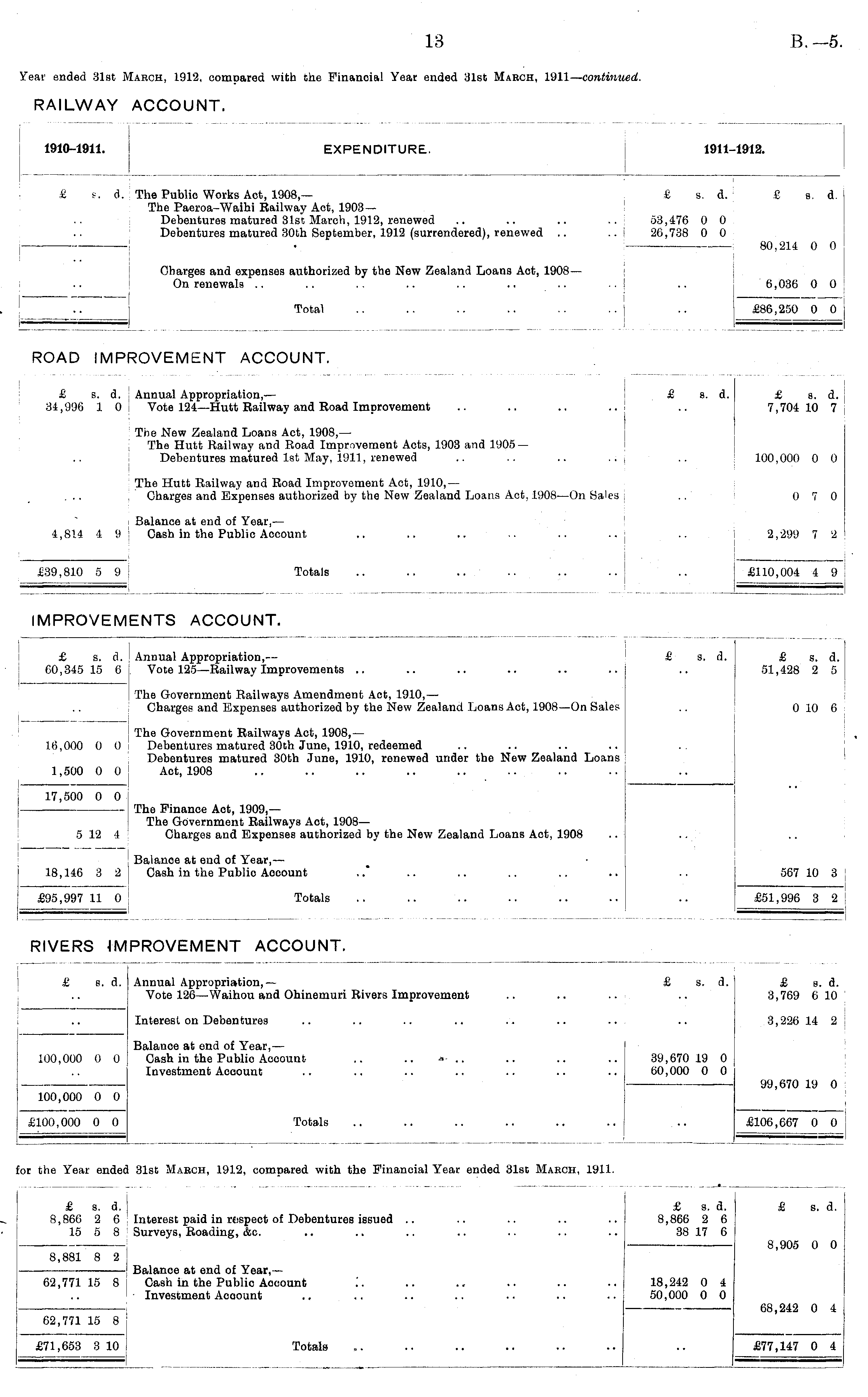 RAILWAY ACCOUNT. 1910-1911. EXPENDITURE. 1911-1912. EXPENDITURE. 1911-1912. £ p. d. The Public Works Act, 1908,— £ s. d. £ s. d. The Paeroa-Waihi Railway Act, 1903— Debentures matured 31st March, 1912, renewed .. .. .. .. 53,476 0 0 Debentures matured 30th September, 1912 (surrendered), renewed .. ..( 26,738 0 0 I ] , 80,214 0 0 .. Charges and expenses authorized by the New Zealand Loans Aot, 1908— On renewals .. .. .. .. .. .. .. .. | .. 6,036 0 0 Total .. .. .. .. .. .. j .. £86,250 0 0 j ROAD IMPROVEMENT ACCOUNT. £ s. d. Annual Appropriation,— £ 8. d. £ s. d. 34,996 1 0 Vote 124—Hutt Eailway and Road Improvement .. .. .. ..I .. 7,704 10 7 The New Zealand Loans Act, 1908,— The Hutt Railway and Road Improvement Acts, 1903 and 1905 — Debentures matured 1st May, 1911, renewed .. .. .. . .j .. 100,000 0 0 The Hutt Railway and Road Improvement Act, 1910, — Charges and Expenses authorized by the New Zealand Loans Act, 1908—On Sales : .. 0 7 0 Balance at end of Year, — 4,814 i 9 Cash in the Public Account .. .. .. .. .. .. .. 2,299 7 2 £39,810 5 9 Totals .. .. .. .. .. .. .. £110,004 4 9 ■ ' : —=, __ . _'_ t ft m r—% i—x *■•* t a r— ■ m r-* & a —ir— **■* a /% i ■ ■. i *-rIMPROVEMENTS ACCOUNT. IMPROVEMENTS ACCOUNT. i £ s. d. Annual Appropriation,— £ s. d. £ s. d. 60,345 15 6 Vote 125—Railway Improvements .. .. .. .. .. .. .. 51,428 2 5 I The Government Railways Amendment Aot, 1910, — Charges and Expenses authorized by the New Zealand Loans Act, 1908—On Sales .. 0 10 6 £ s. d. 51,428 2 5 0 10 6 The Government Railways Act, 1908,— 16,000 0 0 Debentures matured 30th June, 1910, redeemed Debentures matured 30th June, 1910, renewed under the New Zealand Loans 1,500 0 0j Aot, 1908 17,500 0 0 The Finance Act, 1909,— The Government Railways Act, 1908— 5 12 4 Charges and Expenses authorized by the New Zealand Loans Act, 1908 Balance at end of Year, — 18,146 3 2 J Cash in the Public Aocount . .* .. .. .. .. .. .. 567 10 3 567 10 3 £95,997 11 0 Totals .. .. .. .. .. .. .. £51,996 3 2 £51,996 3 2 RIVERS IMPROVEMENT ACCOUNT. RIVERS )IV £ s. d. Annual Appropriation,— £ s. d. £ s. d. Vote 126—Waihou and Ohinemuri Rivers Improvement .. .. .. .. 3,769 6 10 £ s. a. £ s. d. 3,769 6 10 Interest on Debentures .. .. .. .. ... .. .. .. 3,226 14 2 3,226 14 2 Balance at end of Year, — 100,000 0 0 Cash in the Public Account .. .. .. .. .. .. 39,670 19 0 Investment Account .. .. .. .. .. .. .. 60,000 0 0 — 99,670 19 0 100,000 0 0 £100,000 0 0 Totals .. .. .. .. .. .. .. £106,667 0 0 100,000 0 0 100,000 0 0 99,670 19 0 £106,667 0 0 £100,000 0 0 I , _ _ . ' —— for the Year ended 31st March, 1912, compared with the Financial Year ended 31sc Mahch, 1911. £ s. d. ! £ a. d. £ s. d. 8,866 2 6 Interest paid in respect of Debentures issued .. .. .. .. .. 8,866 2 6 15 5 8 Surveys, Roading, &c. .. .. .. .. .. .. .. 38 17 6 8,905 0 0 8,881 8 2 j ' Balance at end of Year, — 62,77115 8 Cash in the Public Aocount .'. .. .. .. .. .. 18,242 0 4 Investment Aooount .. .. .. .. .. .. .. 50,000 0 0 18,242 0 4 50,000 0 0 — 68,242 0 4 62,771 15 8 £71,653 3 10 : Totals .. .. .. .. .. .. .. £77,147 0 4 £77,147 0 4