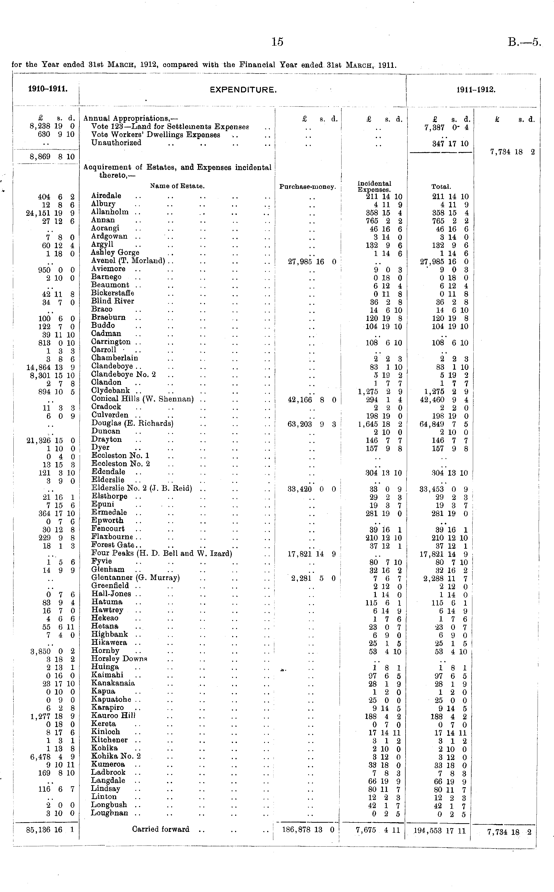 1910-1911. EXPENDITURE. 1911-1912. 8,869 8 10 404 6 2 12 8 6 24,151 19 9 27 12 6 7 8 0 60 12 4 1 18 0 950' 0 0 2 10 0 42 11 8 34 7 0 100 6 0 122 7 0 39 11 10 813 0 10 13 3 3 8 6 14,864 13 9 8,301 15 10 2 7 8 894 10 5 11 3 3 6 0 9 21,326 15 0 1 10 0 0 4 0 13 15 3 121 3 10 3 9 0 £ s. d. 8,238 19 0 630 9 10 Annual Appropriations,— £ a. d. Vote 123—Land for Settlements Expenses Vote Workers' Dwellings Expenses Unauthorized Acquirement of Estates, and Expenses incidental thereto,— Name of Estate. Purchaee-money. Airedale Albury Allanholm Annan Aorangi Ardgowan Argyll Ashley Gorge Avenel (T. Morland) .. .. .. .. 27,985 16 0 Aviemore Barnego Beaumont .. Biokerstaffe Blind Eiver .. .. .. Braoo .. .. .. .. Braeburn .. .. .. . Buddo Cadman Garrington .. .. .. .. Carroll • .. .. .. .. .. Chamberlain .. .. .. Clandeboye Glandeboye No. 2 .. Clandon .. .. .. .. Clydebank .. .. .. .. .. j Conical Hills (W. Shennan) .. .. .. 42,166 8 0 Cradock .. .. .. .. Culverden .. .. .. .. Douglas (E. Richards) .. .. .. 63,203 9 3 Duncan Drayton .. .. .. .. ., I Dyer .. .. .. .. .. I Eccleston No. 1 Eccleston No. 2 Edendale Elderslie .. .. .. .. . Elderslie No. 2 (J. B. Reid) .. .. .. j 33,420 0 0 Elsthorpe . . .. .. .. .. Epuni .. ... .. .. Ermedale Epworth Fencourt Flaxboume Forest Gate Four Peaks (H. D. Bell and W. Izard) .. 17,82114 9 Fyvie .. .. .. .. Glenham Glentanner (G. Murray) .. .. .. 2,281 5 0 Greenfield .. . . .. .. .. j Hall-Jones Hatuma Hawtrey Hekeao Hetana Highbank Hikawera .. .. .. .. Hornby .. .. .. .. .. | Horsley Downs Huinga .. .. .. .. ■ • ». Kaimahi Kanakanaia Kapua Kapuatohe Karapiro Kauroo Hill Kereta Kinloch Kitchener .. .. .. .. .. Kohika Kohika No. 2 Kumeroa Ladbrook Langdale Lindsay Linton Longbush Lougbnan £ s. d. Incidental Expenses. 211 14 10 4 11 9 358 15 4 765 2 2 1 46 16 6 3 14 0 132 9 6 1 14 6 9 0 3 l 0 18 0 6 12 4 0 11 8 36 2 8 14 6 10 120 19 8 • 104 19 10 108 6 10 2 2 3 j 83 1 10 5 19 2 1 7 7 1,275 2 9 294 1 4 2 2 0 198 19 0 1,645 18 2 2 10 0 146 7 7 157 9 8 304 13 10 I 33' 0 9 29 2 3 19 3 7 281 19 0 39 16 1 210 12 iO 37 12 1 J 80 7 10 j 32 16 2 7 6 7 2 12 0 1 14 0 115 6 1 6 14 9 17 6 23 0 7 6 9 0 25 1 5 53 4 10 18 1 97 6 5 28 1 9 12 0 25 0 0 9 14 5 188 4 2 0 7 0 17 14 11 3 12 2 10 0 3 12 0 33 18 0 7 8 3 66 19 9 80 11 7 12 2 3 42 1 7 0 2 5 Total. 211 14 10 4 11 9 358 15 4 765 2 2 46 16 6 3 14 0 132 9 6 1 14 6 27,985 16 0 ' 9 0 3 0 18 0 6 12 4 0 11 8 36 2 8 14 0 10 120 19 8 104 19 10 108* 6 10 2 2 3 83 1 10 5 19 2 17 7 1,275 2 9 42,460 9 4 2 2 0 198 19 0 64,849 7 5 2 10 0 146 7 7 157 9 8 £ 3. d. £ s. d. 7,387 0- 4 347 17 10 7,734 18 2 304 13 10 21 16 1 7 15 6 364 17 10 0 7 6 30 12 8 229 9 8 18 1 3 33,453 0 9 29 2 3 19 3 7 281 19 0 15 6 14 9 9 0 7 6 83 9 4 16 7 0 4 6 6 55 6 11 7 4 0 39 16 1 210 12 10 37 12 1 17,821 14 9 80 7 10 32 16 2 2,288 11 7 2 12 0 1 14 0 115 6 1 6 14 9 17 6 '23 0 7 6 9 0 25 1 5 53 4 10 3,850 0 2 3 18 2 2 13 1 0 16 0 23 17 10 0 10 0 0 9 0 6 2 8 1,277 18 9 0 18 0 8 17 6 13 1 1 13 8 6,478 4 9 9 10 11 169 8 10 18 1 97 6 5 28 1 9 12 0 25 0 0 9 14 5 188 4 2 0 7 0 17 14 11 3 12 2 10 0 3 12 0 33 18 0 7 8 3 66 19 9 80 11 7 12 2 3 42 1 7 0 2 5 116* 6 7 20 0 3 10 0 7,734 18 2 35,136 16 1 Carried forward .. .. ..186,878 13 0 7,675 4 11 194,553 17 11
