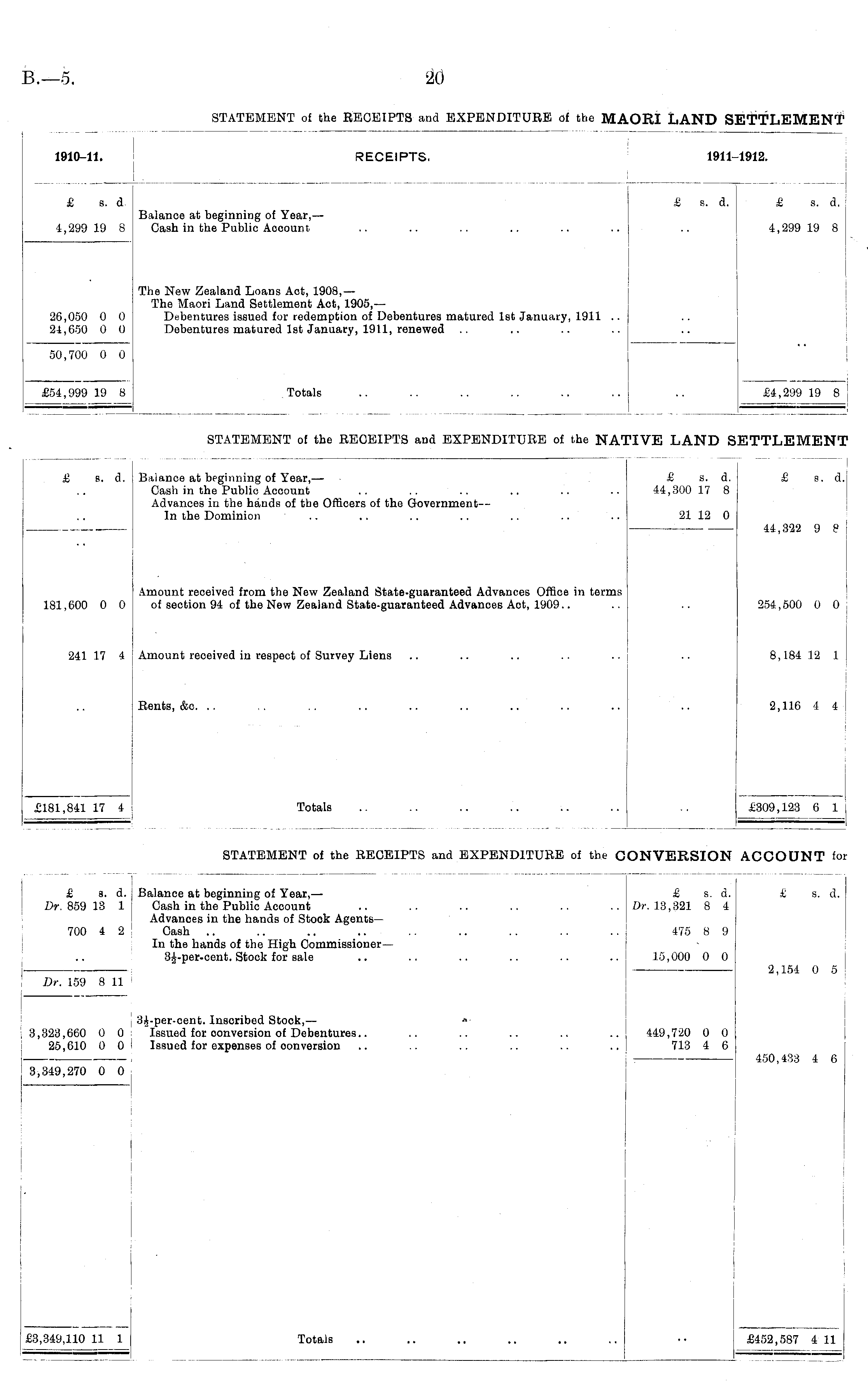 1910-11. RECEIPTS. 1910-11. 1911 1912. £ s. d. Balance at beginning of Year, — 4,299 19 8 Gash in the Public Aocount £ s. d. £ s. d. £ s. d. 4,299 19 8 4,299 19 8 The New Zealand Loans Act, 1908,— The Maori Land Settlement Aot, 1905,— 26,050 0 0 Debentures issued for redemption of Debentures matured 1st January, 1911 .. 24,650 0 0 Debentures matured 1st January, 1911, renewed 50,700 0 0 26,050 0 0 24,650 0 0 50,700 0 0 £54,999 19 8 Totals £54,999 19 8 £4,299 19 8 STATEMENT of the RECEIPTS and EXPENDITURE of the NA1 'IVE LAND S: TTLEMENT £ s. d. Balance at beginning of Year, — Cash in the Public Account Advances in the hands of the Officers of the Government — In the Dominion £ s. d. : £ s. d. 44,300 17 8 21 12 0 £ b. d. 44,322 9 e Amount received from the New Zealand State-guaranteed Advances Office in terms 181,600 0 0 of section 94 of the New Zealand State-guaranteed Advances Aot, 1909.. 181,600 0 0 254,500 0 0 241 17 4 J Amount received in respect of Survey Liens 241 17 4 j . 8,184 12 1 Rents, &c. : 2,116 4 4 £181,841 17 4 Totals £181,841 17 4 £309,123 6 1 STATEMENT of the RECEIPTS and EXPENDITURE of the C ONVERSION ACCOUNT fo: . £ s. d. Balance at beginning of Year, — Dr. 859 13 1 Cash in the Public Account Advances in the hands of Stook Agents— 700 4 2 Cash In the hands of the High Commissioner— Stock for sale £ s. d. Dr. 13,321 8 4 £ s. d. 475 8 9 . Dr. 159 8 11 : 15,000 0 0 2,154 0 5 3£-per-cent. Inscribed Stock,— *• 3,323,660 0 0 Issued for conversion of Debentures.. 25,610 0 0 '• Issued for expenses of conversion 450,433 4 6 449,720 0 0 713 4 6 3,349,270 0 0 ■ . , £3,349,110 11 1 Totals £3,349,110 11 1 £452,587 4 11