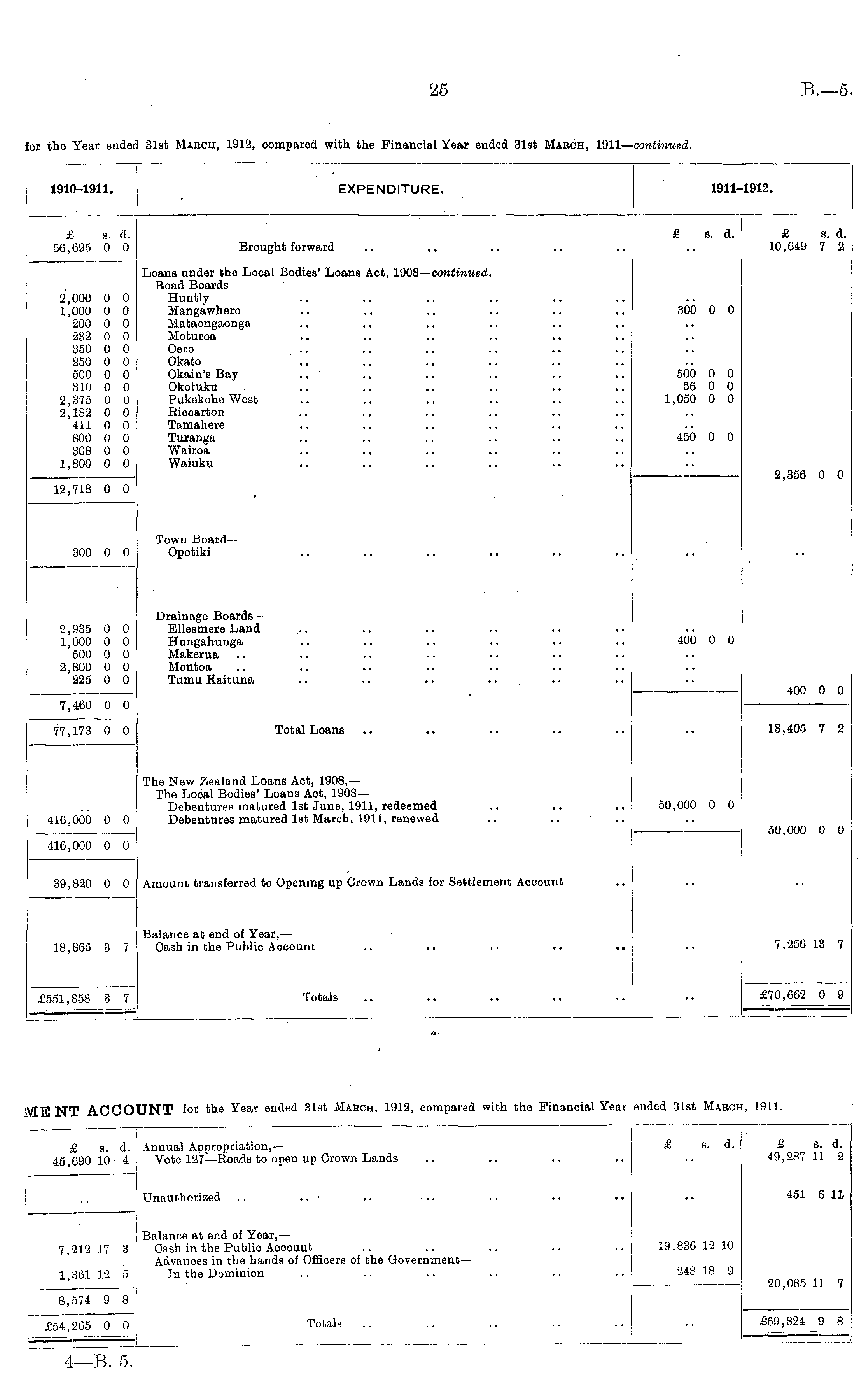 1910-1911. EXPENDITURE. 1911-1912. £ s. d. 56,695 0 0 Brought forward £ s. d. £ s. d. 10,649 7 2 2,000 0 0 1,000 0 0 200 0 0 232 0 0 350 0 0 250 0 0 500 0 0 310 0 0 2,375 0 0 2,182 0 0 411 0 0 800 0 0 308 0 0 1,800 0 0 Loans under the Local Bodies' Loans Act, 1908— continued. Road Boards— Huntly Mangawhero Mataongaonga Moturoa Oero Okato Okain's Bay Okotuku Pukekohe West Riooarton Tamahere Turanga Wairoa Waiuku 300 0 0 500 0 0 56 0 0 1,050 0 0 450 0 0 12,718 0 0 2,356 0 0 300 0 0 Town BoardOpotiki 2,935 0 0 1,000 0 0 500 0 0 2,800 0 0 225 0 0 Drainage Boards— Bllesmere Land Hungahunga Makerua Moutoa Tumu Kaituna 400 0 0 400 0 0 7,460 0 0 77,173 0 0 Total Loans 13,405 7 2 The New Zealand Loans Aot, 1908,— The Looal Bodies' Loans Act, 1908— Debentures matured 1st June, 1911, redeemed Debentures matured 1st March, 1911, renewed .. .. 50,000 0 0 50,000 0 0 416,000 0 0 416,000 0 0 Amount transferred to Opening up Crown Lands for Settlement Aoeount 39,820 0 0 18,865 3 7 Balance at end of Year, — Cash in the Public Account 7,256 13 7 Totals £551,858 3 7 £70,662 0 9 j»E NT AOCOUNT for tne Year ended 31st Mabch, 1912, oompared with the Finanoial Year ended 31st Marc :, 1911. £ s. d. 45,690 10 4 £ s. a. >,690 10 4 Annual Appropriation,— Vote 127 —Roads to open up Crown Lands £ s. d. £ s. d. 49,287 11 2 Unauthorized .. .. ■ 451 6 117,212 17 3 ',212 17 3 L.361 12 5 ) KHA O Q Balance at end of Year, — Cash in the Public Account Advances in the hands of Officers of the Government — In the Dominion 19,836 12 10 20,085 11 7 1,361 12 5 248 18 9 8,574 9 8 S,574 9 8 1,265 0 0 Totali £54,265 0 0 £69,824 9 8 4—B. 5.