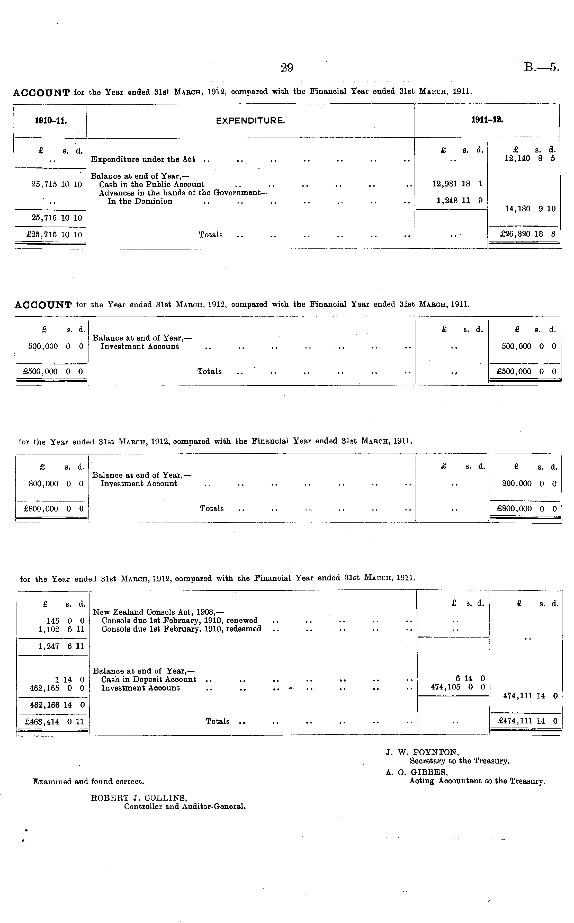 1910-11. EXPENDITURE. 191 1-12. £ 8. d. £ s. d. £ s. d. 12,140 8 5 Expenditure under the Aot .. 25,715 10 10 Balance at end of Year, — Cash in the Publio Aocount Advances in the hands of the Government — In the Dominion 12,931 18 1 1,248 11 9 14,180 9 10 25,715 10 10 Totals £25,715 10 10 £26,320 18 3 ACCOUNT for the Year ended 31st March, 1912, oompared with the Financial Year ended 31st March, 1911. £ s. d. Balance at end of Year, — 500,000 0 0 Investment Aocount £500,000 0 0 Totals £ s. d. £ s. d. 500,000 0 0 £500,000 0 0 for the Year ended 31st March, 1912, oompared with the Financial Year ended 31st March, 1911. £ s. d. Balance at end of Year,— 800,000 0 0 Investment Account £800,000 0 0 ) Totals £ s. d. £ s. d. 800,000 0 0 £800,000 0 0 for the Year ende ed 31st March, 1912, compared with the Financial Year ended 31st March, 1911. £ s. d. £ s. d. £ s. d. 145 0 0 1,102 6 11 145 0 0 1,102 6 11 New Zealand Consols Aot, 1908, — Consols due 1st February, 1910, renewed Consols due 1st February, 1910, redeemed 1,247 6 11 1 14 0 462,165 0 0 Balance at end of Year, — Cash in Deposit Account .. Investment Account 6 14 0 474,105 0 0 474,111 14 0 462,166 14 0 £463,414 0 11 Totals .. £474,111 14 0