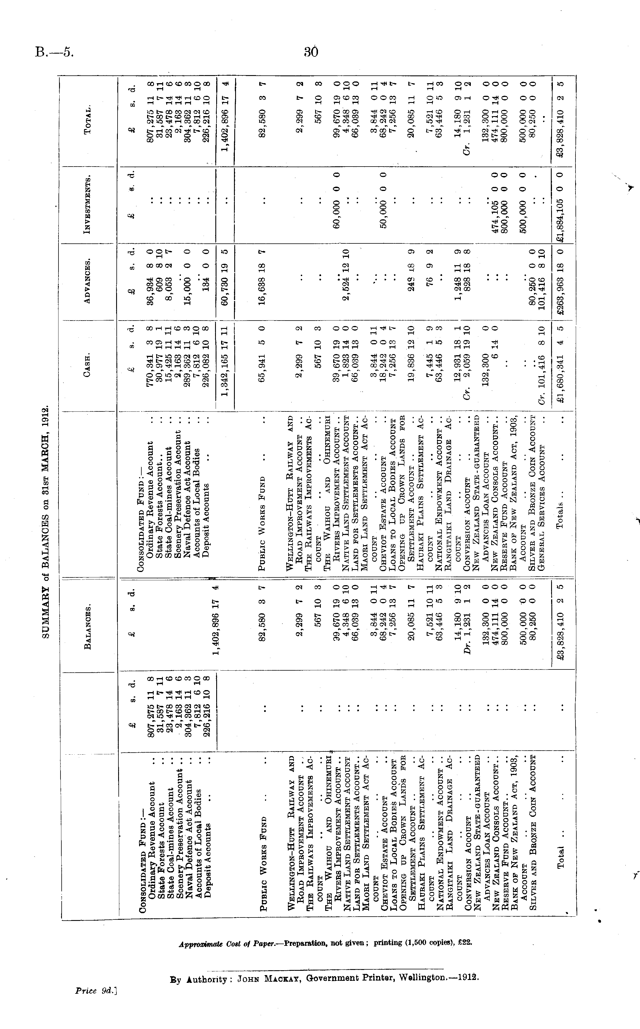 Balances. I Cash. Advances. Investments. Total. £ s. d. £ 3. d. £ s. d. £ s. d. £ s. d. £ s. d. Consolidated Fund :— Ordinary Revenue Aooount State Forests Account State Coal-minee Account Scenery Preservation Account .. Naval Defence Act Account Accounts of Local Bodies Deposit Aooounts 807,275 11 8 31,587 7 11 23,478 14 6 2,163 14 6 304,362 11 3 7,812 6 10 226,216 10 8 Consolidated Fund: — Ordinary Revenue Account State Forests Account.. State Coal-mines Acoount Scenery Preservation Account .. Naval Defence Act Account Accounts of Local Bodies Deposit Accounts 770,341 3 8 30,977 19 1 15,425 11 11 2,163 14 6 289,362 11 3 7,812 6 10 226,082 10 8 36,934 8 0 609 8 10 8,053 2 7 15,000 0 0 807,275 11 8 31,587 7 11 23,478 14 6 2,163 14 6 304,362 11 3 7,812 6 10 226,216 10 8 134' 0 0 1 1,402,896 17 4 1,342,165 17 11 60,730 19 5 1,402,896 17 4 Public Works Fund 82,580 3 7 Public Works Fund 65,941 5 0 16,638 18 7 82,580 3 7 Wellington-Hutt Eailway and Road Improvement Account The Railways Improvements Account The Waihou and Ohinemuei Rivers Improvement Account .. Native Land Settlement Account Land fob Settlements Account.. Maori Land Settlement Act Account Cheviot Estate Account Loans to Local Bodies Account Opening up Crown Lands for Settlement Account Hauraki Plains Settlement Account National Endowment Account .. Rangitaiki Land Drainage Account Conversion Account New Zealand State - guaranteed Advances Loan Account New Zealand Consols Account.. Reserve Fund Account.. Bank of New Zealand Act, 1903, Account Silver and Bronze Coin Account 2,299 7 2 567 10 3 99,670 19 0 4,348 6 10 66,039 13 0 3,844 0 11 68,242 0 4 7,256 13 7 20,085 11 7 Wellington-Hutt Railway and Road Improvement Account The Railways Impbovements Account The Waihou and Ohinemuri Rivers Improvement Account .. Native Land Settlement Account Land fob Settlements Account.. Maobi Land Settlement Act Account Cheviot Estate Account Loans to Local Bodies Account Opening up Crown Lands fob Settlement Account Haueaki Plains Settlement Account National Endowment Account .. Rangitaiki Land Drainage Account Conversion Account New Zealand State - guaranteed Advances Loan Account New Zealand Consols Account.. Reserve Fund Account Bank of New Zealand Act, 1903, Account Silver and Bronze Coin Account General Services Account 2,299 7 2 567 10 3 39,670 19 0 1,823 14 0 66,039 13 0 3,844 0 11 18,242 0 4 7,256 13 7 19,836 12 10 2,524 12 10 •• 24S 18 9 60,000 0 0 50,000 0 0 2,299 7 2 567 10 3 99,670 19 0 4,348 6 10 66,039 13 0 3,844 0 11 68,242 0 4 7,256 13 7 20,085 11 7 7,521 10 11 63,446 5 3 7,445 1 9 63,446 5 3 76 9 2 7,521 10 11 63,446 5 3 14,180 9 10 Dr. 1,231 1 2 12,931 18 1 Or. 2,059 19 10 1,248 11 9 828 18 8 14,180 9 10 Gr. 1,231 1 2 132,300 0 0 474,111 14 0 800,000 0 0 132,300 0 6 14 0 474,105 0 0 800,000 0 0 132,300 0 0 474,111 14 0 800,000 0 0 500,000 0 0 80,250 0 0 Gr. 101,416 8 10 8O,25o' 0 0 101,416 8 10 500,000 0 0 500,000 0 0 80,250 0 0 Total .. £3,828,410 2 5 j Totals .. £1,680,341 4 5 £263,963 18 0 £1,884,105 0 0 £3,828,410 2 5