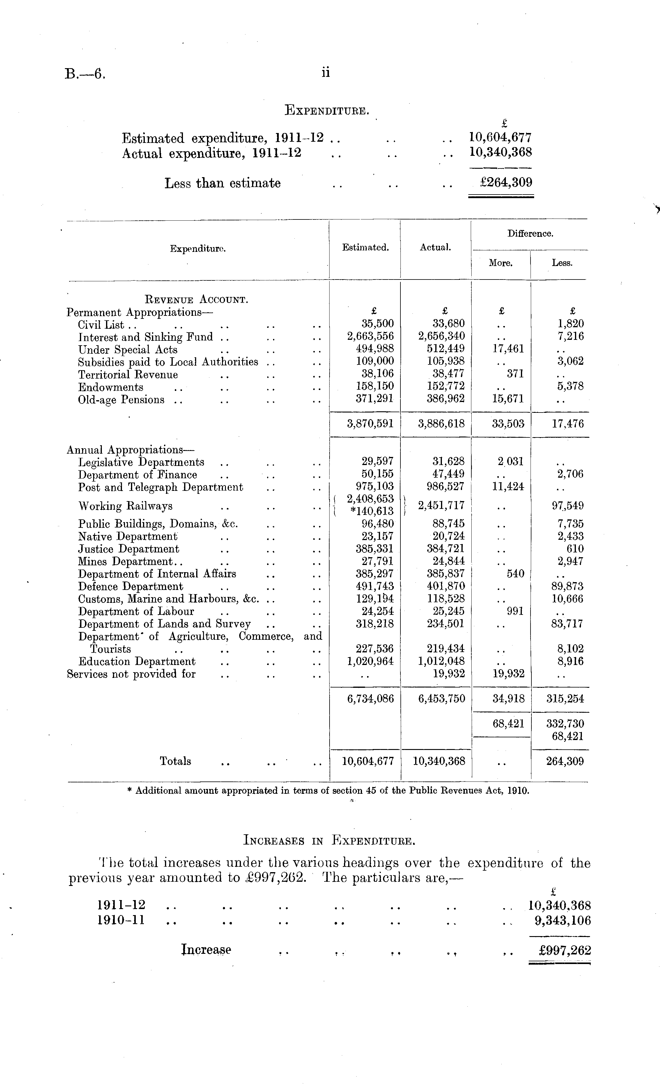 Expenditure. £ Estimated expenditure, 1911-12 . . .. .. 10,604,677 Actual expenditure, 1911-12 .. .. .. 10,340,368 Less than estimate . . .. .. £264,309