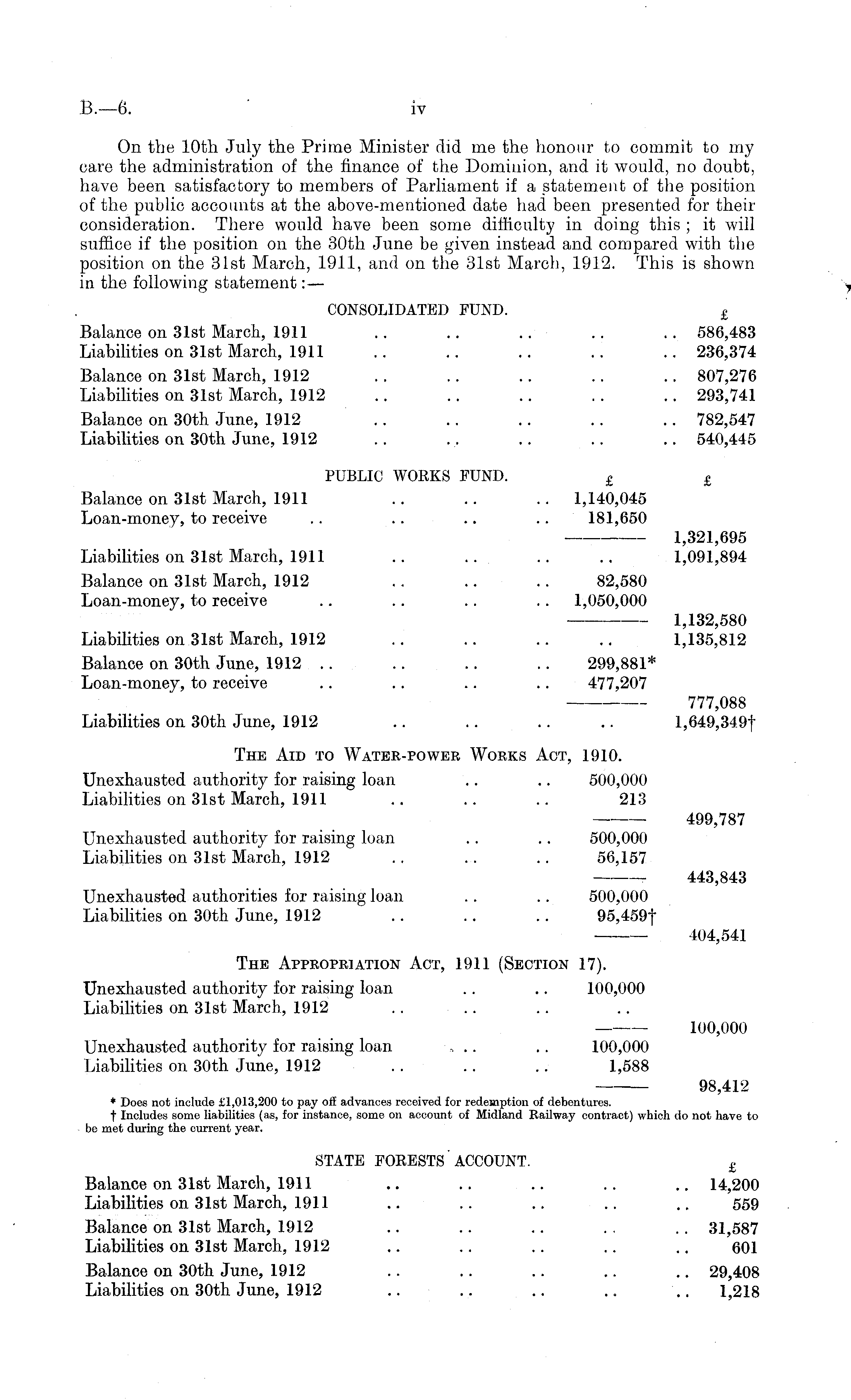 On the 10th July the Prime Minister did me the honour to commit to my care the administration of the finance of the Dominion, and it would, no doubt, have been satisfactory to members of Parliament if a statement of the position of the public accounts at the above-mentioned date had been presented for their consideration. There would have been some difficulty in doing this ; it will suffice if the position on the 30th June be given instead and compared with the position on the 31st March, 1911, and on the 31st March, 1912. This is shown in the following statement: — CONSOLIDATED FUND. £ Balance on 31st March, 1911 .. .. .. .. .. 586,483 Liabilities on 31st March, 1911 .. .. .. .. .. 236,374 Balance on 31st March, 1912 .. .. .. .. .. 807,276 Liabilities on 31st March, 1912 .. .. .. . . .. 293,741 Balance on 30th June, 1912 .. .. .. .. .. 782,547 Liabilities on 30th June, 1912 .. .... .. .. .. 540,445 PUBLIC WORKS FUND. £ £ Balance on 31st March, 1911 .. .. .. 1,140,045 Loan-money, to receive .. .. .. .. 181,650 1,321,695 Liabilities on 31st March, 1911 .. .. .. .. 1,091,894 Balance on 31st March, 1912 .. .. .. 82,580 Loan-money, to receive .. .. .. .. 1,050,000 1,132,580 Liabilities on 31st March, 1912 .. .. .. .. 1,135,812 Balance on 30th June, 1912 .. .. .. .. 299,881* Loan-money, to receive .. .. .. .. 477,207 777,088 Liabilities on 30th June, 1912 .. .. .. .. 1,649,349f The Aid to Water-power Works Act, 1910. Unexhausted authority for raising loan .. .. 500,000 Liabilities on 31st March, 1911 .. .. .. 213 499,787 Unexhausted authority for raising loan .. .. 500,000 Liabilities on 31st March, 1912 .. .. .. 56,157 443,843 Unexhausted authorities for raising loan . . .. 500,000 Liabilities on 30th June, 1912 .. .. .. 95,459f 404,541 The Appropriation Act, 1911 (Section 17). Unexhausted authority for raising loan .. .. 100,000 Liabilities on 31st March, 1912 .. .. — 100,000 Unexhausted authority for raising loan .. .. 100,000 Liabilities on 30th June, 1912 . . .. .. 1,588 98,412 * Does not include £1,013,200 to pay off advances received for redemption of debentures. f Includes some liabilities (as, for instance, some on account of Midland Railway contract) which do not have to be met during the current year. STATE FORESTS ACCOUNT. £ Balance on 31st March, 1911 .. .. .. .. .. 14,200 Liabilities on 31st March, 1911 .. .. .. .. .. 559 Balance on 31st March, 1912 .. .. .. .. .. 31,587 Liabilities on 31st March, 1912 .. .. .. .. .. 601 Balance on 30th June, 1912 .. .. .. .. .. 29,408 Liabilities on 30th June, 1912 .. .. .. .. .. 1,218