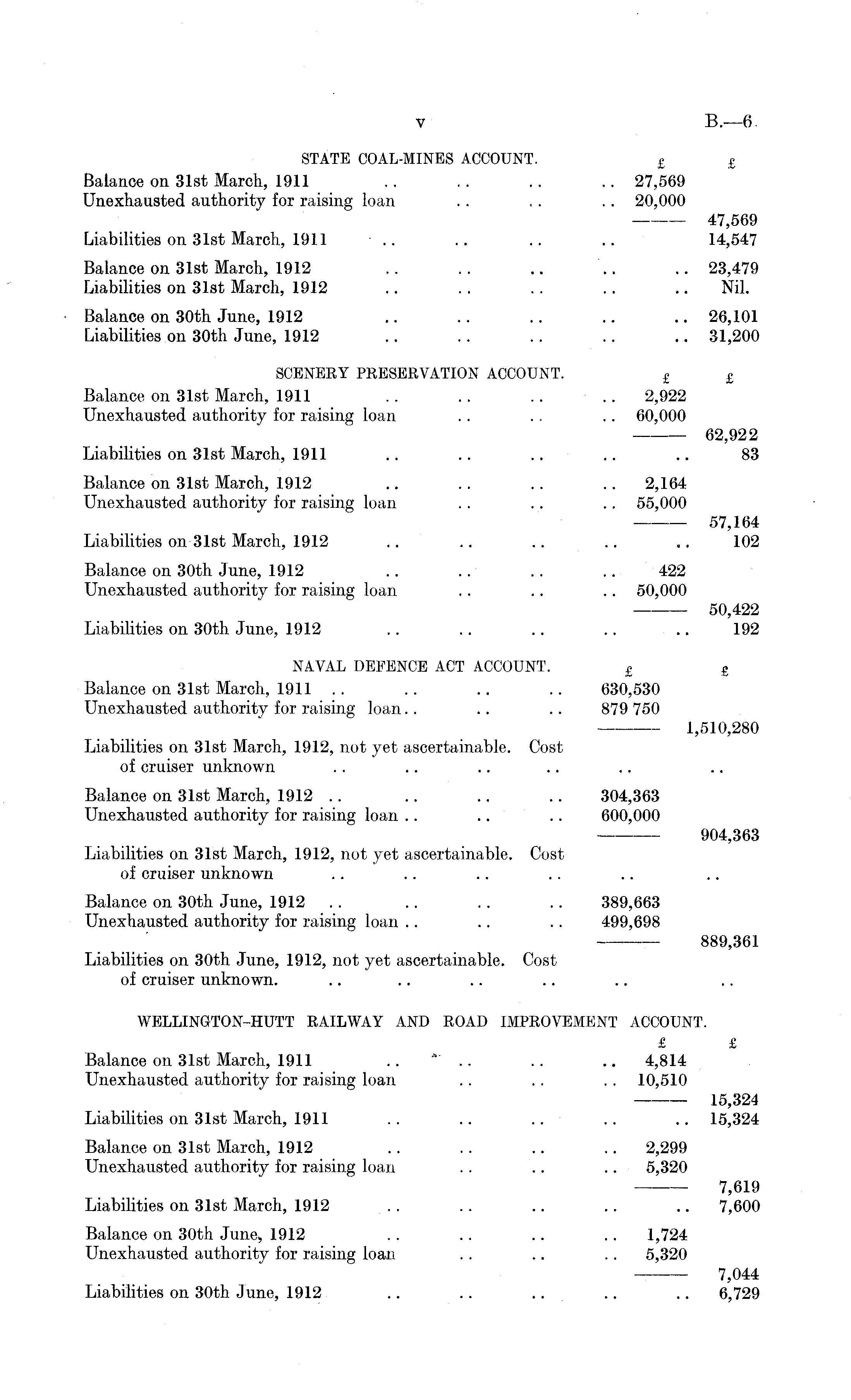 STATE COAL-MINES ACCOUNT. £ £ Balance on 31st March, 1911 .. .. .. .. 27,569 Unexhausted authority for raising loan .. . . .. 20,000 47,569 Liabilities on 31st March, 1911 .. .. .. .. 14,547 Balance on 31st March, 1912 .. .. .. .. .. 23,479 Liabilities on 31st March, 1912 .. .. .. .. .. Nil. Balance on 30th June, 1912 .. .. .. .. .. 26,101 Liabilities on 30th June, 1912 .. .. .. .. .. 31,200 SCENERY PRESERVATION ACCOUNT. £ £ Balance on 31st March, 1911 .. .. .. . . 2,922 Unexhausted authority for raising loan .. .. .. 60,000 62,922 Liabilities on 31st March, 1911 .. .. .. .. .. 83 Balance on 31st March, 1912 .. .. .. .. 2,164 Unexhausted authority for raising loan .. .. .. 55,000 57,164 Liabilities on 31st March, 1912 .. .. .. .. .. 102 Balance on 30th June, 1912 .. .. . . .. 422 Unexhausted authority for raising loan .. .. .. 50,000 50,422 Liabilities on 30th June, 1912 .. .. .. .. .. 192 NAVAL DEFENCE ACT ACCOUNT. £ £ Balance on 31st March, 1911.. .. .. .. 630,530 Unexhausted authority for raising loan.. .. .. 879 750 1,510,280 Liabilities on 31st March, 1912, not yet ascertainable. Cost of cruiser unknown Balance on 31st March, 1912 .. .. .. .. 304,363 Unexhausted authority for raising loan .. .. .. 600,000 904,363 Liabilities on 31st March, 1912, not yet ascertainable. Cost of cruiser unknown Balance on 30th June, 1912 .. .. .. .. 389,663 Unexhausted authority for raising loan .. .. .. 499,698 889,361 Liabilities on 30th June, 1912, not yet ascertainable. Cost of cruiser unknown. WELLINGTON-HUTT RAILWAY AND ROAD IMPROVEMENT ACCOUNT. £ £ Balance on 31st March, 1911 .. ** .. .. .. 4,814 Unexhausted authority for raising loan . . .. .. 10,510 15,324 Liabilities on 31st March, 1911 . . .. .. .. .. 15,324 Balance on 31st March, 1912 .. .. .. .. 2,299 Unexhausted authority for raising loan . . .. .. 5,320 7,619 Liabilities on 31st March, 1912 .. .. .. .. .. 7,600 Balance on 30th June, 1912 .. .. .. .. 1,724 Unexhausted authority for raising loan . . .. .. 5,320 7,044 Liabilities on 30th June, 1912 .. .. .. .. .. 6,729