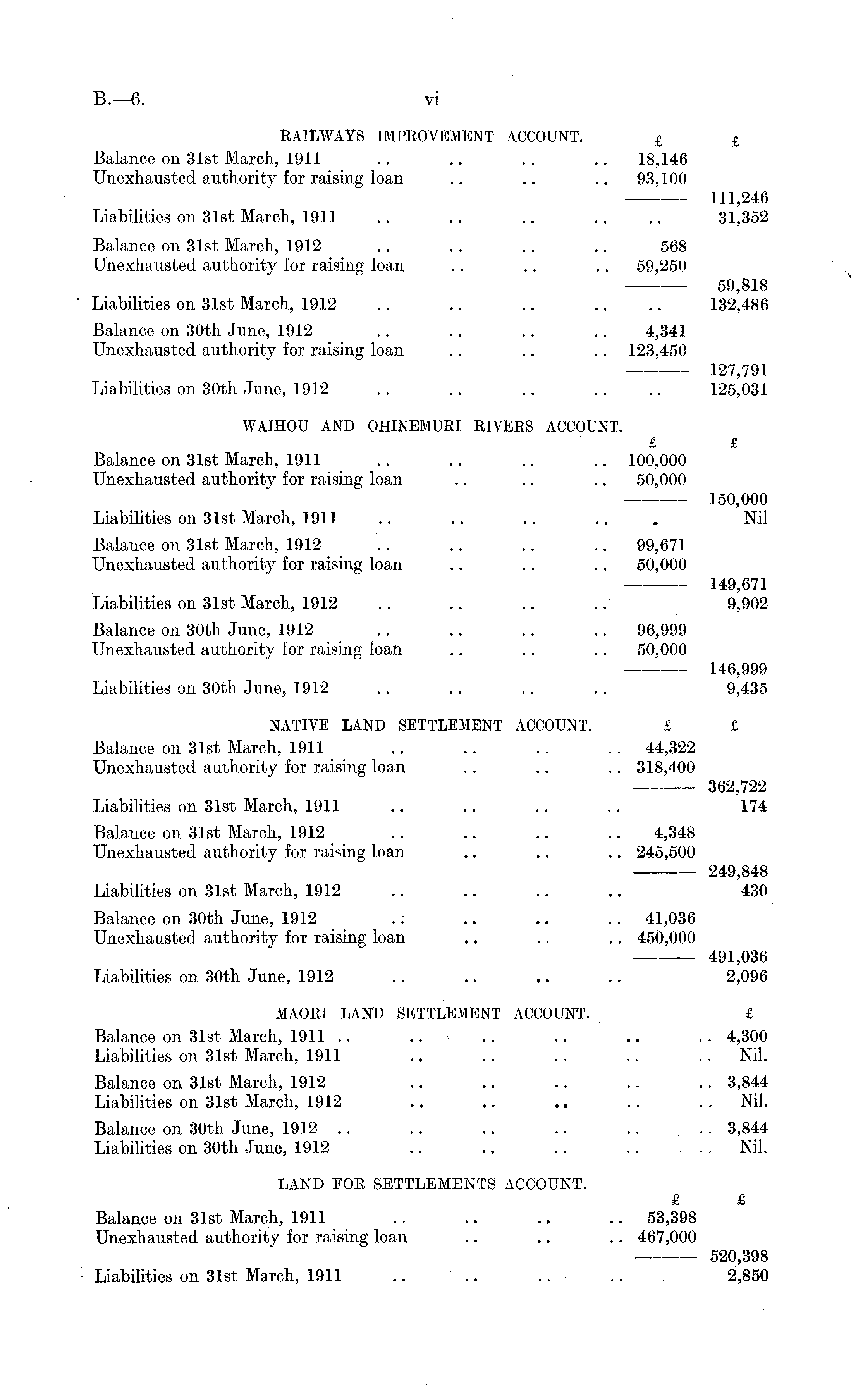 RAILWAYS IMPROVEMENT ACCOUNT. £ £ Balance on 31st March, 1911 .. .. .. .. 18,146 Unexhausted authority for raising loan .. .. .. 93,100 111,246 Liabilities on 31st March, 1911 .. .. .. .. .. 31,352 Balance on 31st March, 1912 . . .. .. .. 568 Unexhausted authority for raising loan . . .. .. 59,250 59,818 Liabilities on 31st March, 1912 .. .. .. .. .. 132,486 Balance on 30th June, 1912 .. .. .. .. 4,341 Unexhausted authority for raising loan .. .. .. 123,450 127,791 Liabilities on 30th June, 1912 . . .. .. .. .. 125,031 WAIHOU AND OHINEMURI RIVERS ACCOUNT. £ £ Balance on 31st March, 1911 .. .. .. .. 100,000 Unexhausted authority for raising loan .. .. .. 50,000 150,000 Liabilities on 31st March, 1911 .. .. .. .. . Nil Balance on 31st March, 1912 .. .. .. .. 99,671 Unexhausted authority for raising loan .. .. .. 50,000 — 149,671 Liabilities on 31st March, 1912 .. .. .. .. 9,902 Balance on 30th June, 1912 .. .. .. .. 96,999 Unexhausted authority for raising loan .. . . .. 50,000 146,999 Liabilities on 30th June, 1912 . . .. . . .. 9,435 NATIVE LAND SETTLEMENT ACCOUNT. £ £ Balance on 31st March, 1911 .. .. .. .. 44,322 Unexhausted authority for raising loan .. .. .. 318,400 362,722 Liabilities on 31st March, 1911 .. .. .. ~ 174 Balance on 31st March, 1912 .. .. .. .. 4,348 Unexhausted authority for raising loan .. .. .. 245,500 249,848 Liabilities on 31st March, 1912 .. .. .. .. 430 Balance on 30th June, 1912 .; .. .. .. 41,036 Unexhausted authority for raising loan .. .. .. 450,000 491,036 Liabilities on 30th June, 1912 .. .. .. .. 2,096 MAORI LAND SETTLEMENT ACCOUNT. £ Balance on 31st March, 1911 .. .. .. .. .. .. 4,300 Liabilities on 31st March, 1911 .. .. .. .. .. Nil. Balance on 31st March, 1912 .. .. .. .. .. 3,844 Liabilities on 31st March, 1912 .. .. .. .. .. Nil. Balance on 30th June, 1912 .. .. .. .. .. .. 3,844 Liabilities on 30th June, 1912 .. .. .. .. . . Nil LAND FOR SETTLEMENTS ACCOUNT. £ £ Balance on 31st March, 1911 .. .. .. .. 53,398 Unexhausted authority for raising loan .. .. .. 467,000 520,398 Liabilities on 31st March, 1911 .. .. .. .. 2,850