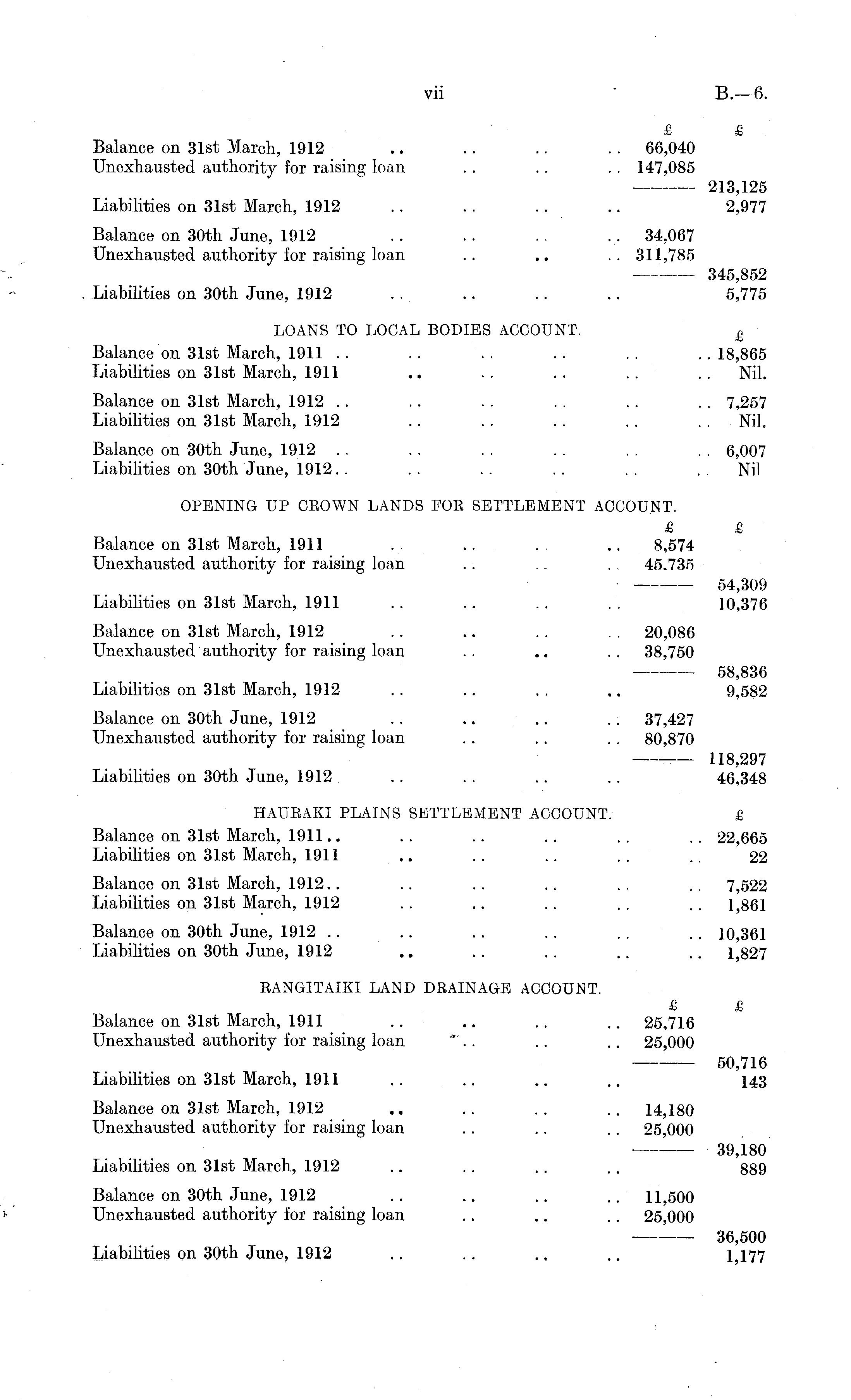 £ £ Balance on 31st March, 1912 .. .. .. .. 66,040 Unexhausted authority for raising loan .. .. . . 147,085 213,125 Liabilities on 31st March, 1912 .. . . .. .. 2,977 Balance on 30th June, 1912 . . . . . . .. 34,067 Unexhausted authority for raising loan .. .. .. 311,785 345,852 Liabilities on 30th June, 1912 .. .. .. .. 5,775 LOANS TO LOCAL BODIES ACCOUNT. £ Balance on 31st March, 1911 . . . . .. .. .. . . 18,865 Liabilities on 31st March, 1911 .. . . . . .. . . Nil. Balance on 31st March, 1912 .. . . . . .. . . . . 7,257 Liabilities on 31st March, 1912 .. . . . . .. . . Nil. Balance on 30th June, 1912 . . . . . . . . . . . . 6,007 Liabilities on 30th June, 1912. . . . . . . . . . Nil OPENING UP CEOWN LANDS FOE SETTLEMENT ACCOUNT. £ £ Balance on 31st March, 1911 . . .. . . .. 8,574 Unexhausted authority for raising loan . . ... . . 45.735 54,309 Liabilities on 31st March, 1911 . . .. . . . . 10,376 Balance on 31st March, 1912 .. .. .. .. 20,086 Unexhausted authority for raising loan .. .. .. 38,750 58,836 Liabilities on 31st March, 1912 . . .. . . .. 9,582 Balance on 30th June, 1912 . . .. .. .. 37,427 Unexhausted authority for raising loan . . .. . . 80,870 118,297 Liabilities on 30th June, 1912 . . . . .. .. 46,348 HAUEAKI PLAINS SETTLEMENT ACCOUNT. £ Balance on 31st March, 1911.. .. .. . . . . .. 22,665 Liabilities on 31st March, 1911 .. .. . . . . .. 22 Balance on 31st March, 1912.. .. .. .. . . .. 7,522 Liabilities on 31st March, 1912 . . .. . . . . .. 1,861 Balance on 30th June, 1912 .. .. . . . . . . . . 10,361 Liabilities on 30th June, 1912 .. .. .. .. .. 1,827 EANGITAIKI LAND DBAINAGE ACCOUNT. £ £ Balance on 31st March, 1911 .. .. .. .. 25,716 Unexhausted authority for raising loan ". . .. .. 25,000 50,716 Liabilities on 31st March, 1911 . . .. .. .. 143 Balance on 31st March, 1912 .. .. .. .. 14,180 Unexhausted authority for raising loan .. .. .. 25,000 39,180 Liabilities on 31st March, 1912 .. . . . . .. 889 Balance on 30th June, 1912 .. .. .. .. 11,500 Unexhausted authority for raising loan .. .. .. 25,000 36,500 Liabilities on 30th June, 1912 .. .. .. .. 1,177