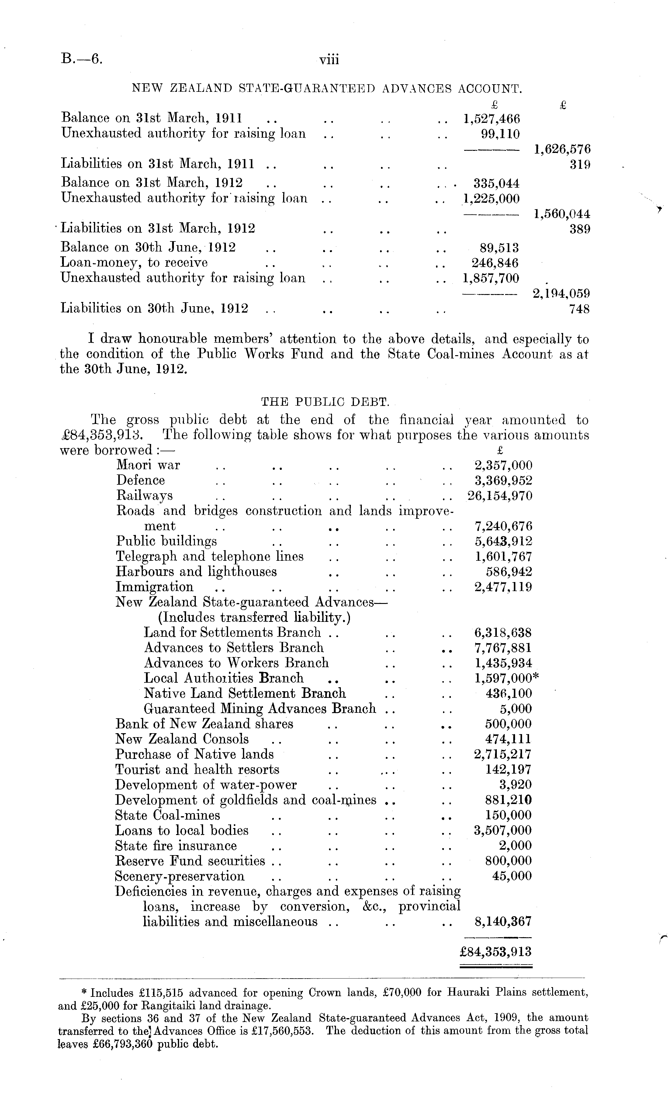 * Includes £115,515 advanced for opening Crown lands, £70,000 for Hauraki Plains settlement, and £25,000 for Eangitaiki land drainage. By sections 36 and 37 of the New Zealand State-guaranteed Advances Act, 1909, the amount transferred to the] Advances Office is £17,560,553. The deduction of this amount from the gross total leaves £66,793,360 public debt.